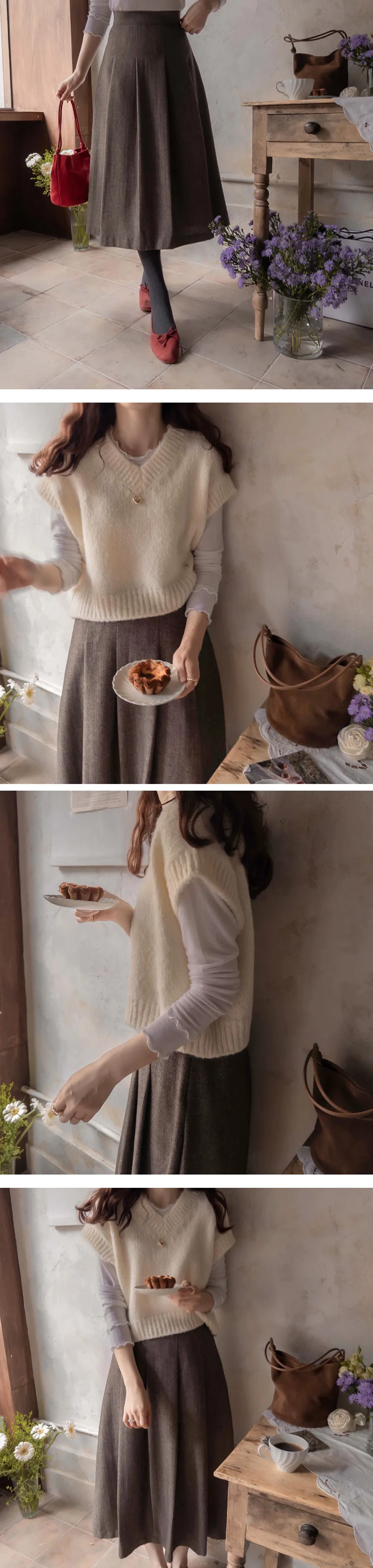經典氛圍針褶傘擺線條人字紋中長裙
