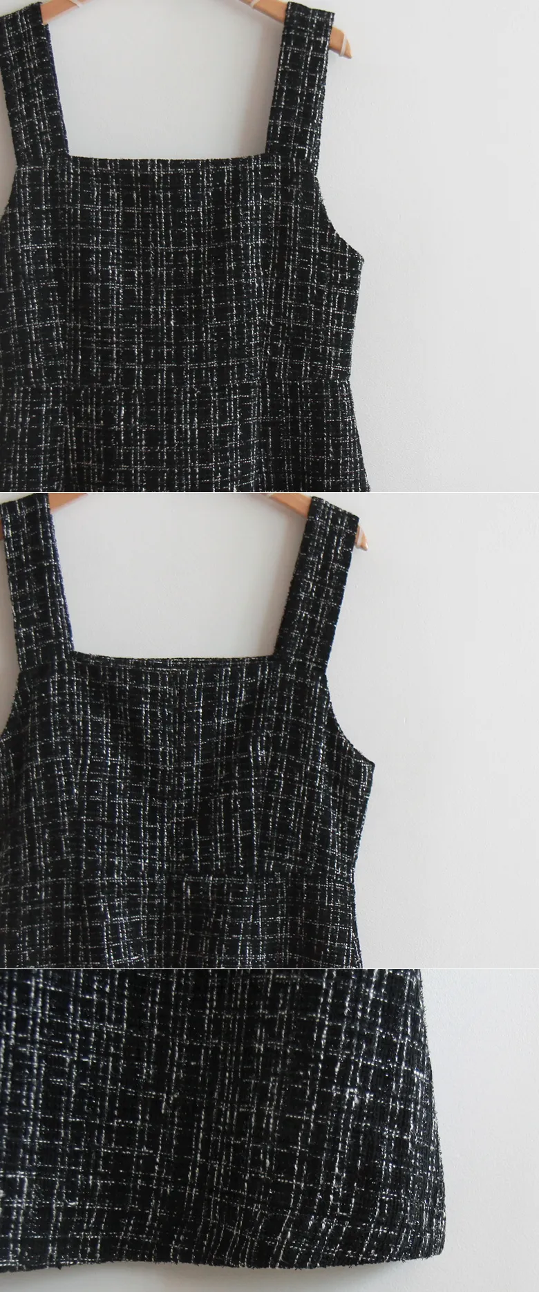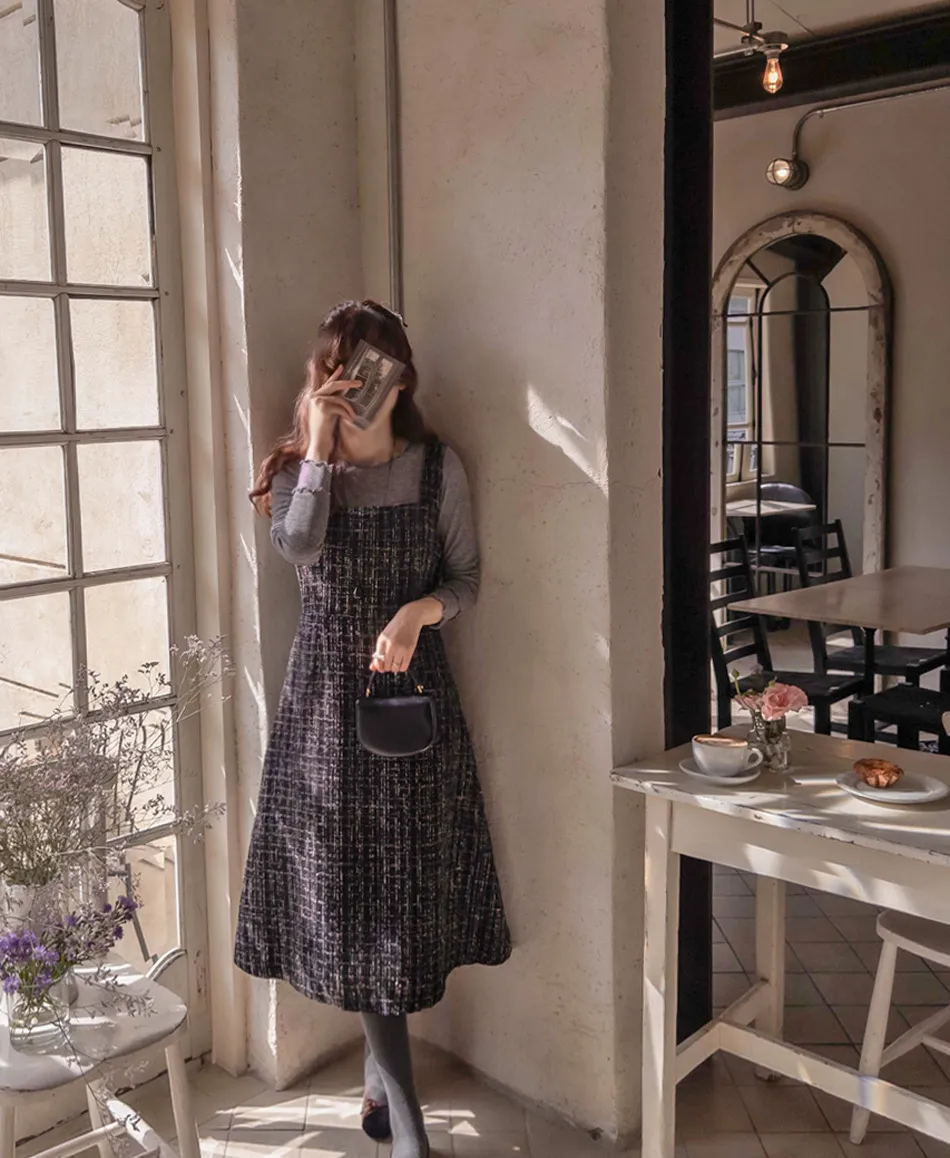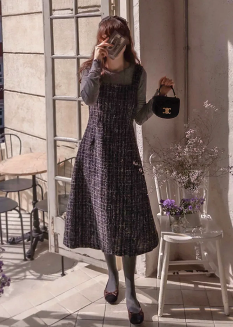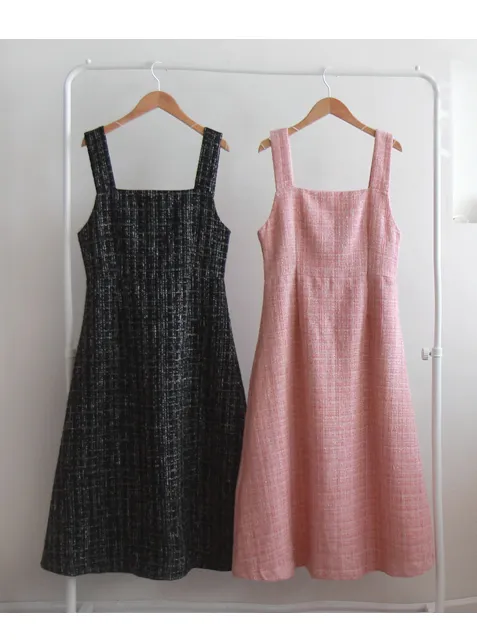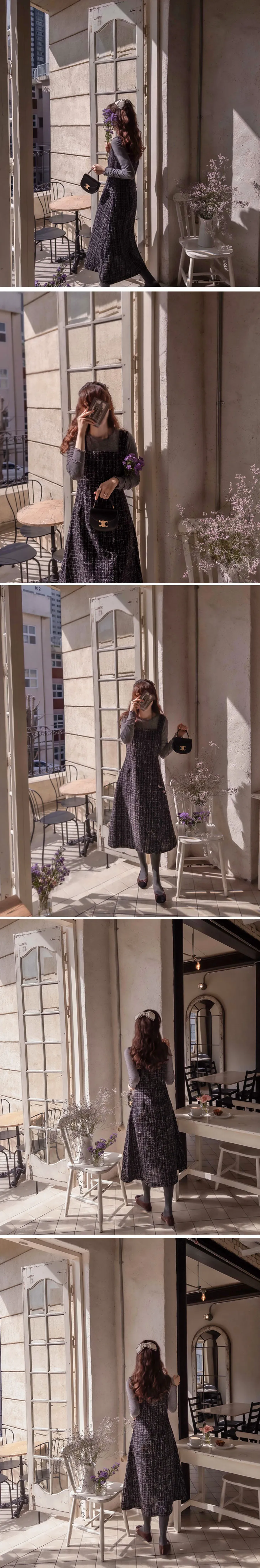 [後拉鍊結構][聚酯襯裡][柔軟珍珠花呢面料製成的連身裙][修身穿著,腰線適當,不緊貼身體][時尚花呢編織連身裙][有吸引力的花呢優雅合身