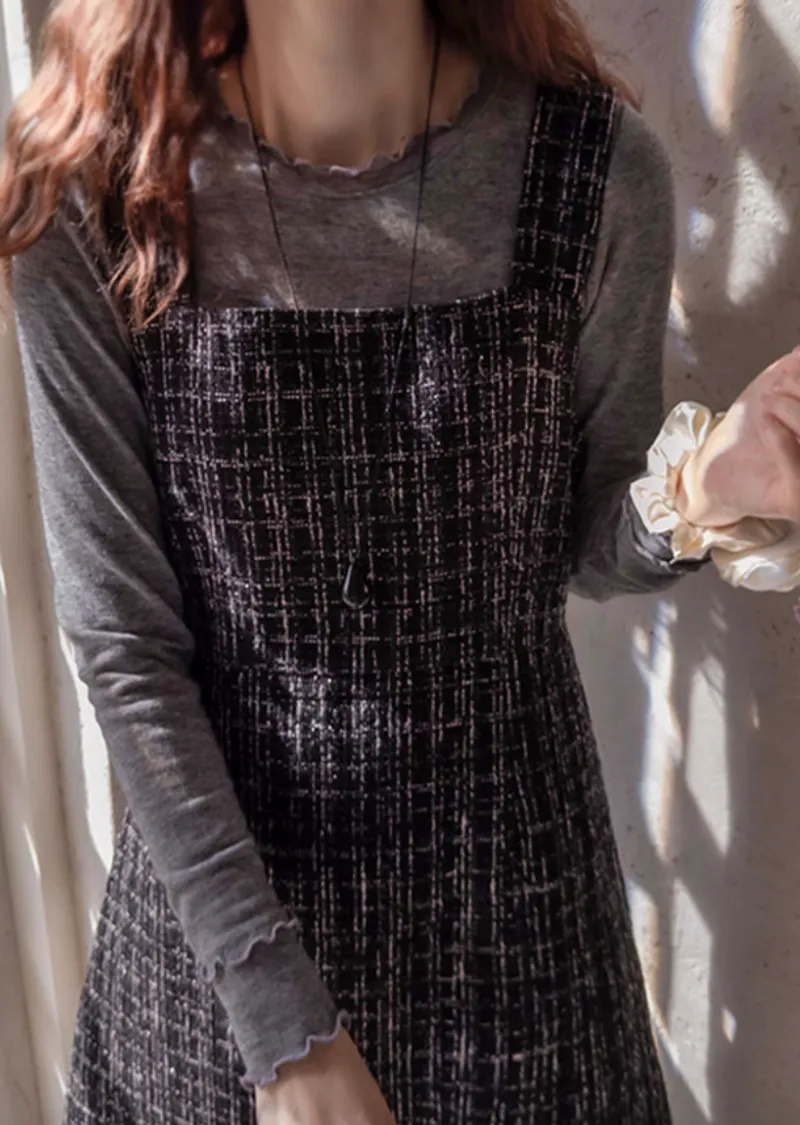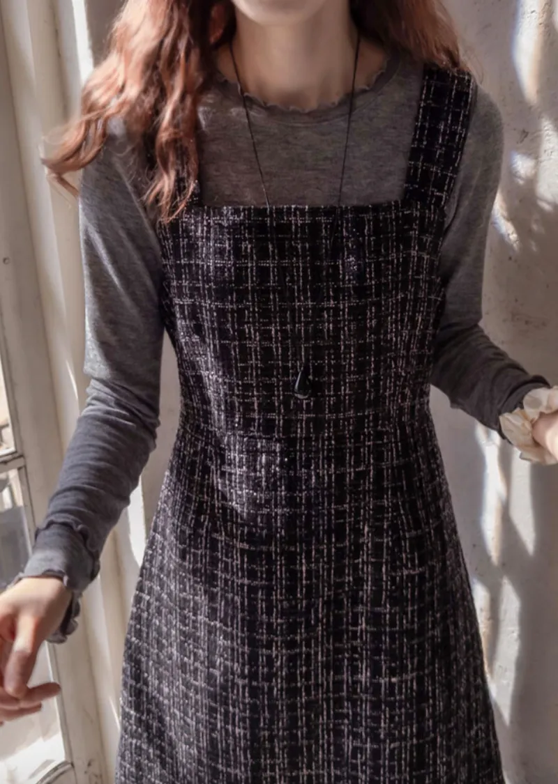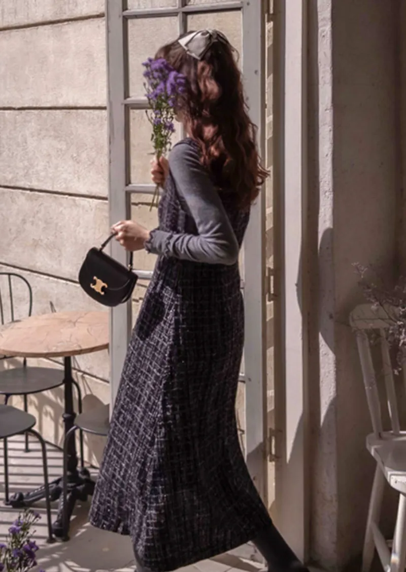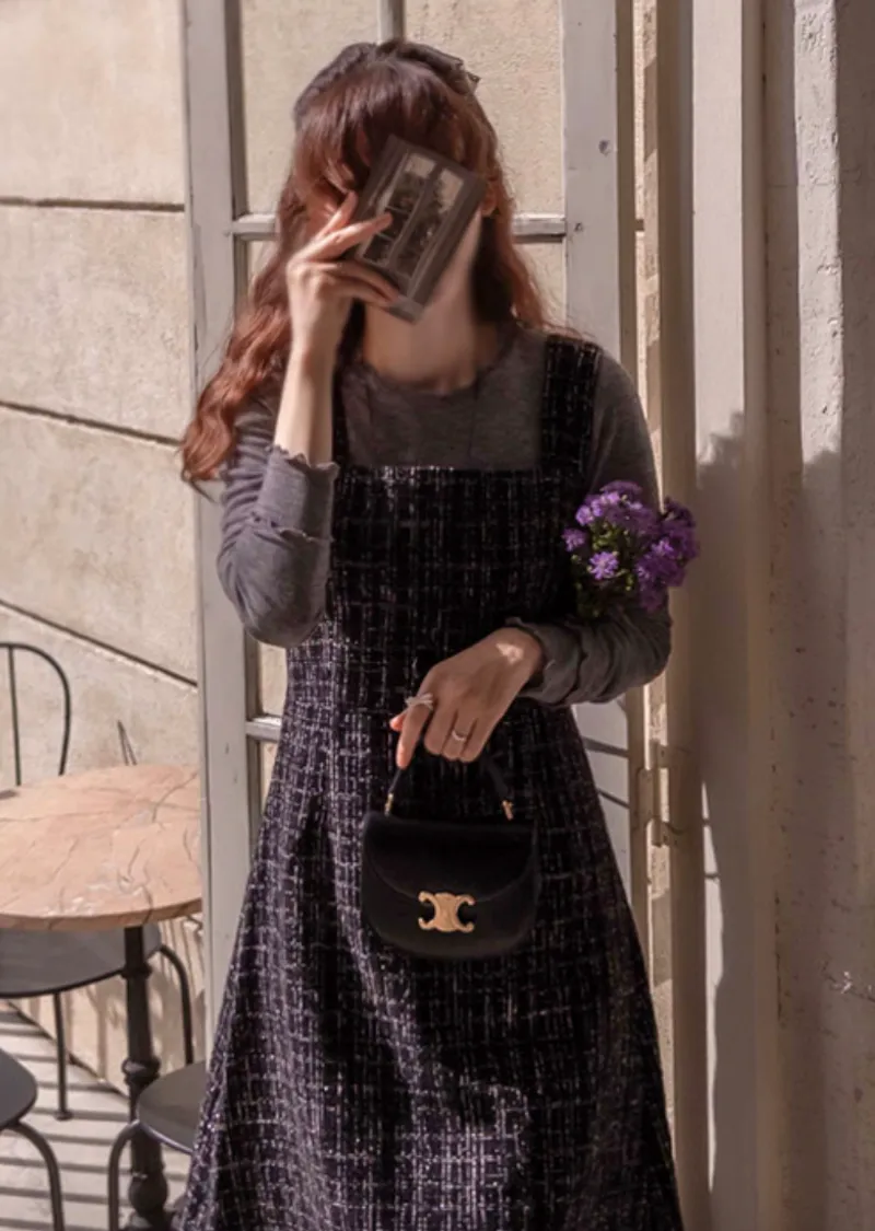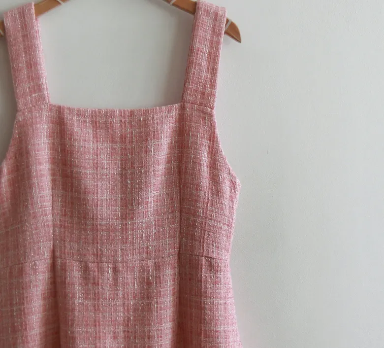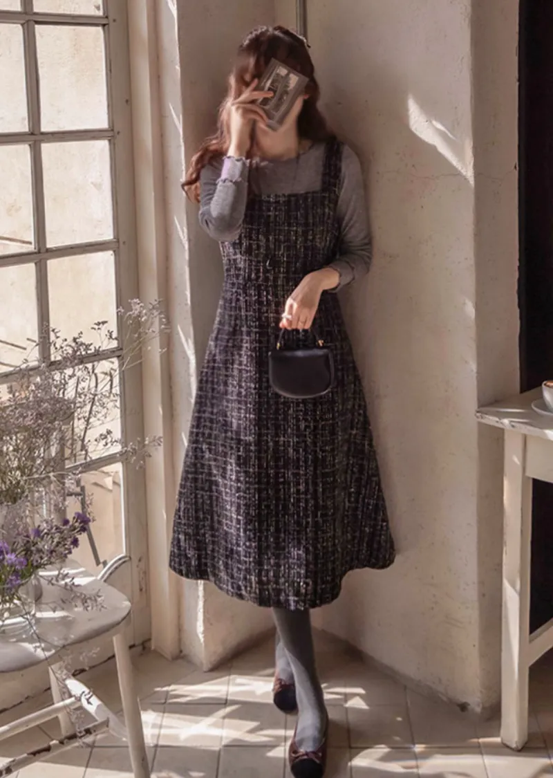 [後拉鍊結構][聚酯襯裡][柔軟珍珠花呢面料製成的連身裙][修身穿著,腰線適當,不緊貼身體][時尚花呢編織連身裙][有吸引力的花呢優雅合身