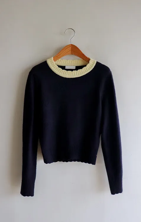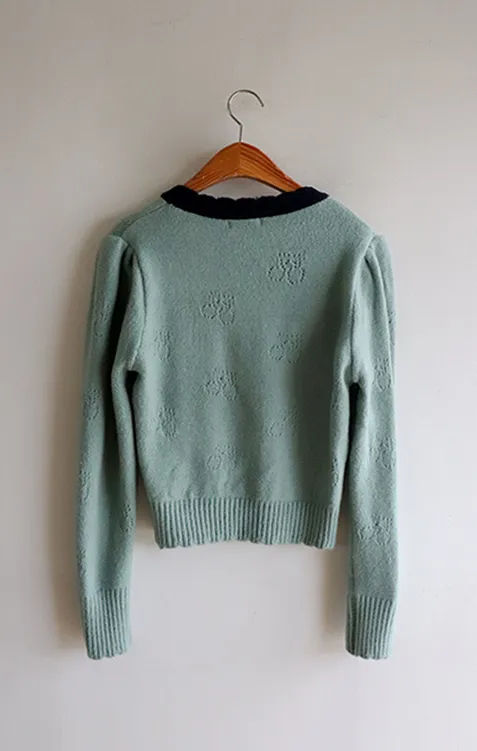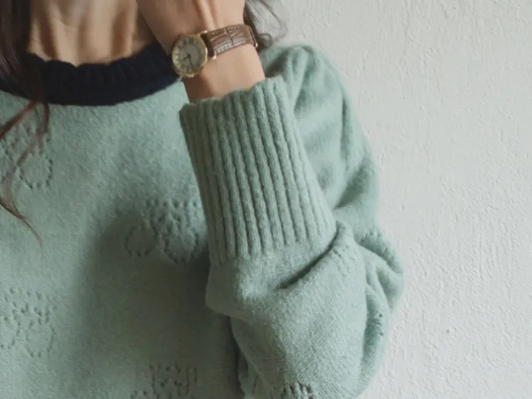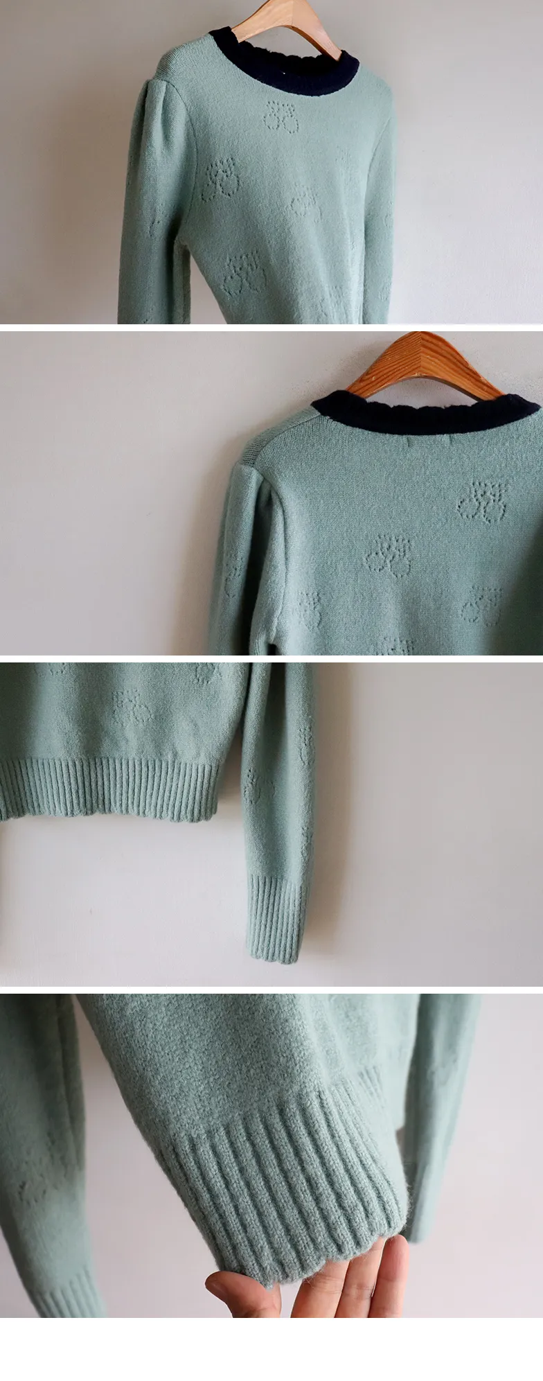 可愛波浪配色領口櫻桃鏤空設計針織上衣
