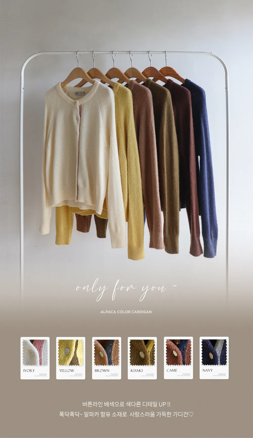 [아이보리, 옐로우, 카멜, 카키, 브라운, 네이비]