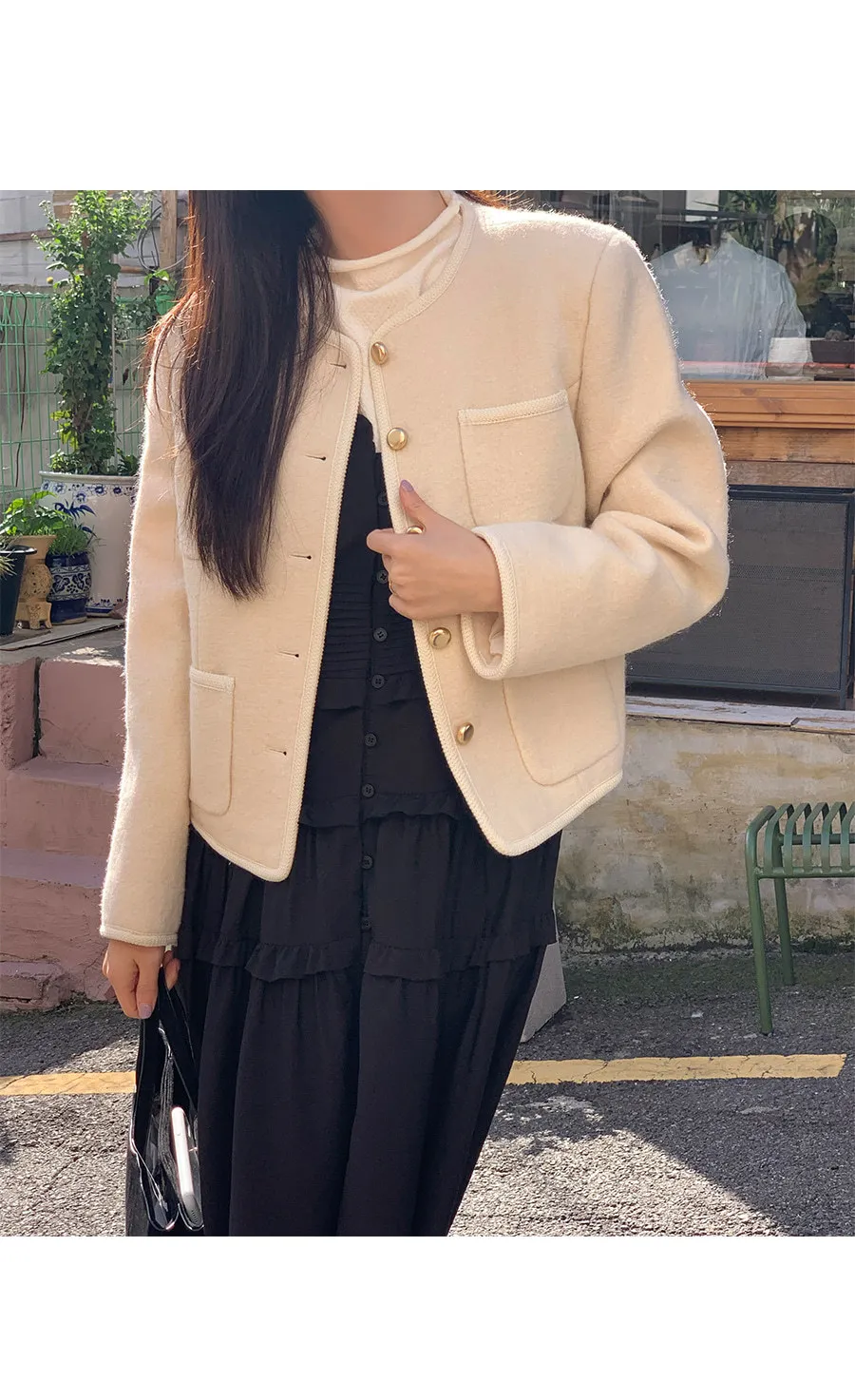 奢華氛圍羊毛混紡斜紋軟呢金釦外套
