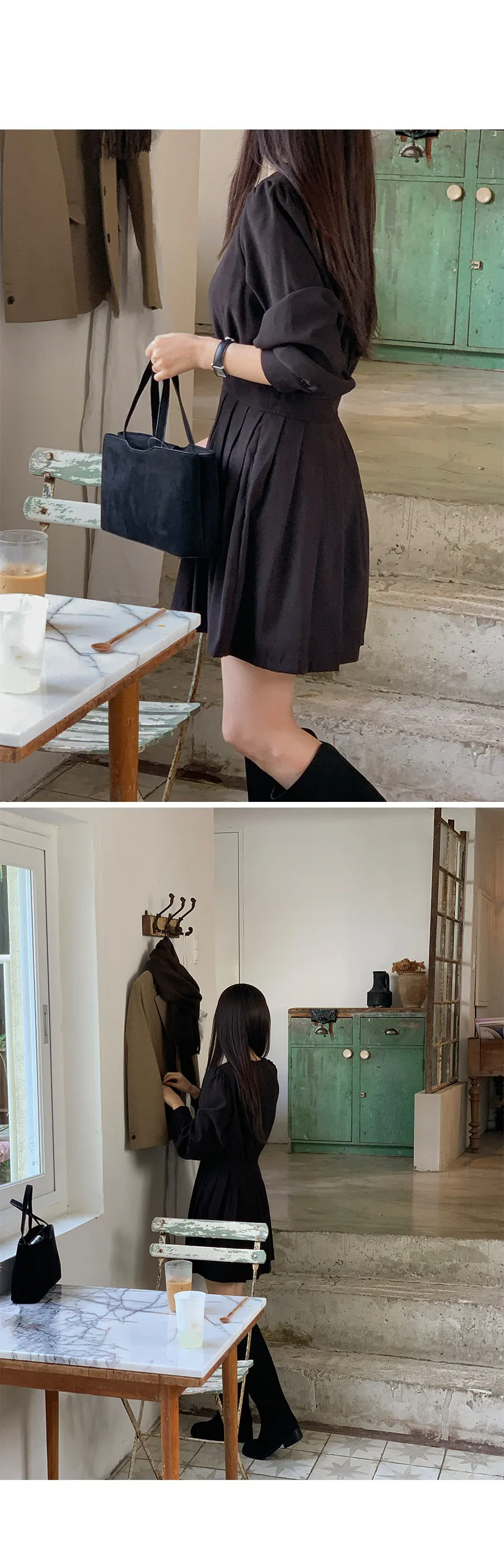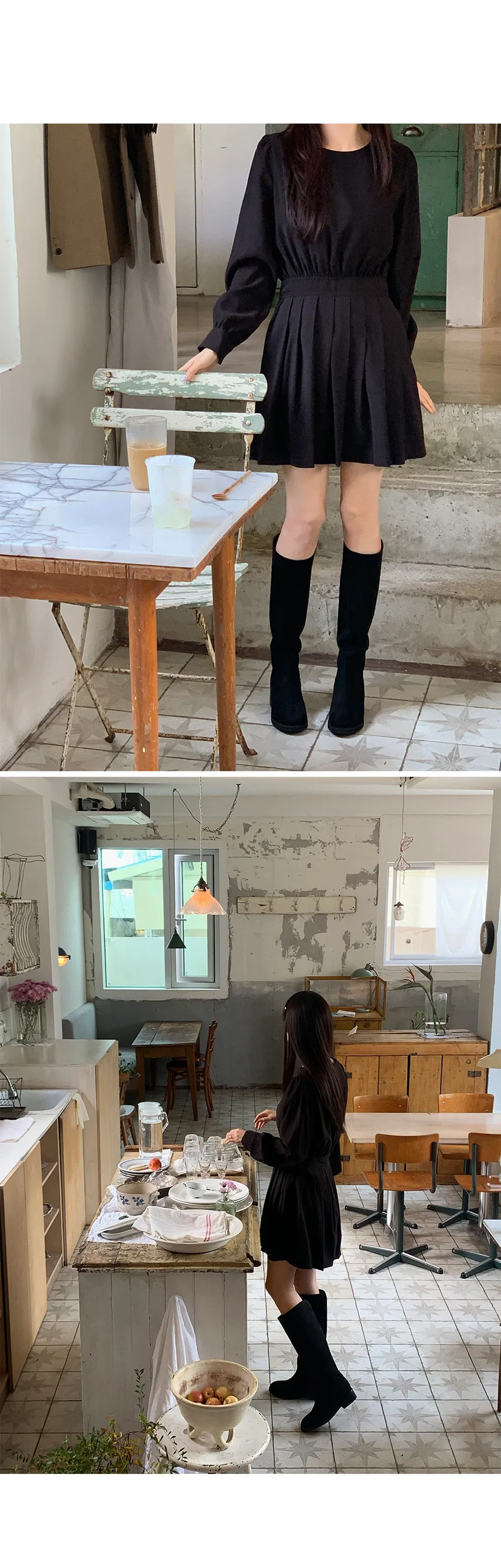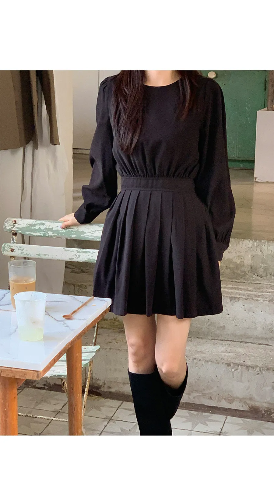 可愛廓形圓領褶皺腰線裙擺連身裙