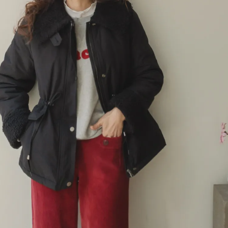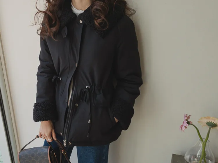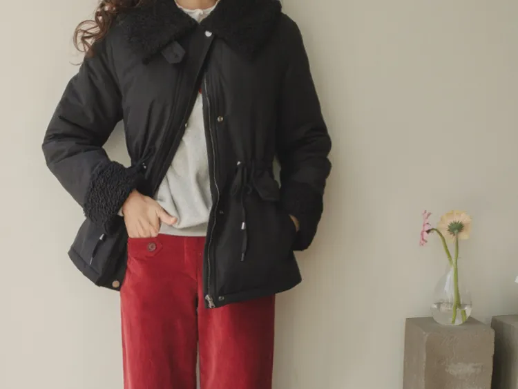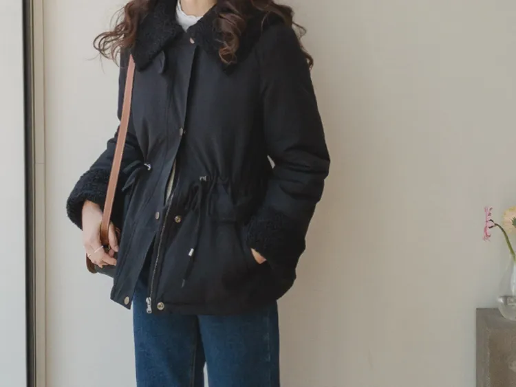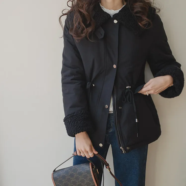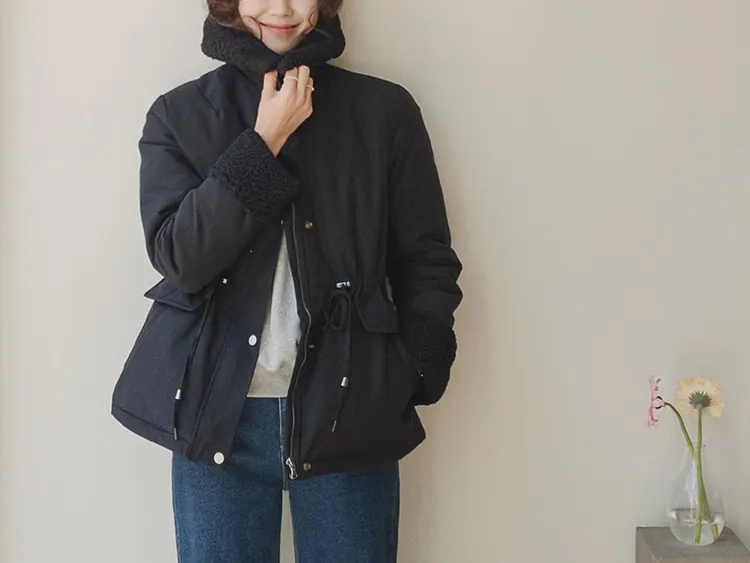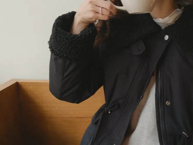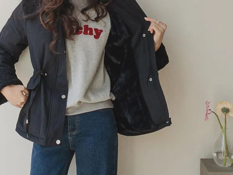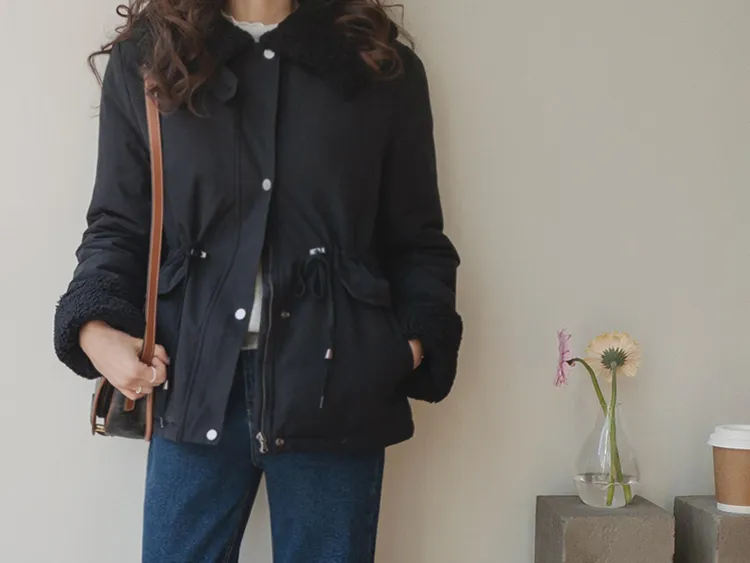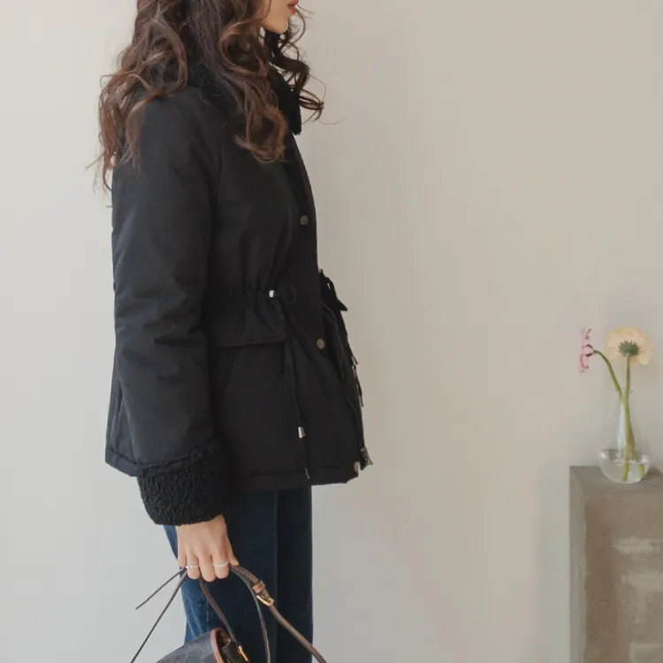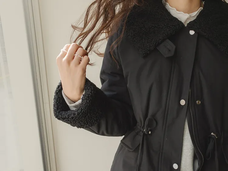溫暖配色領口袖末毛絨抽繩收腰外套