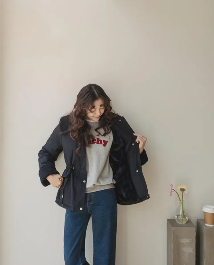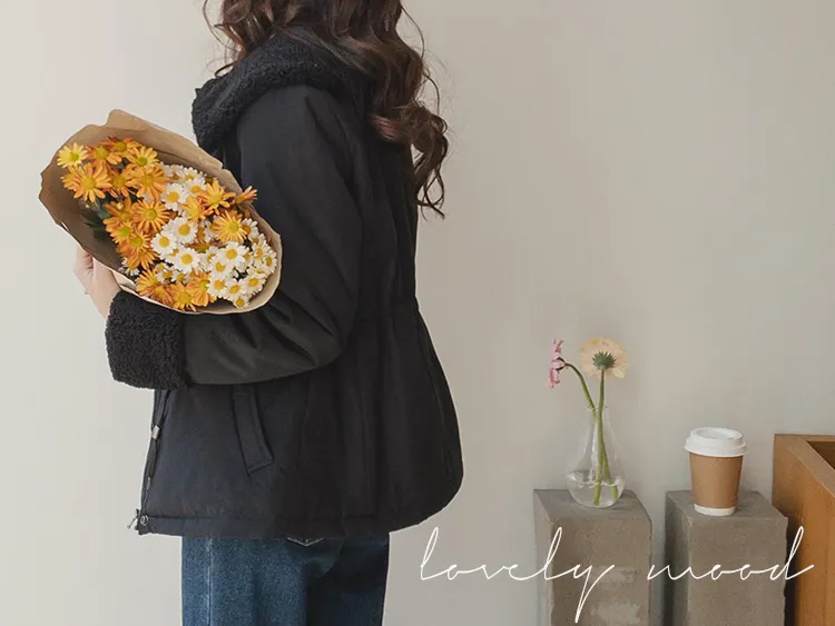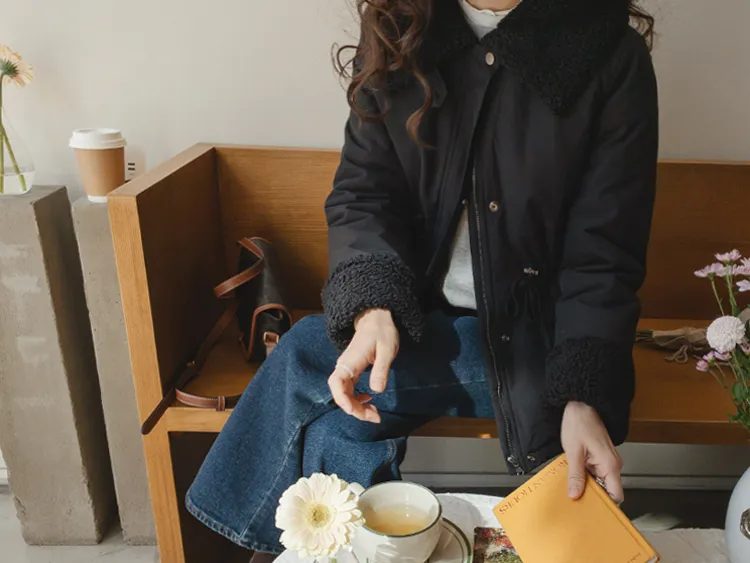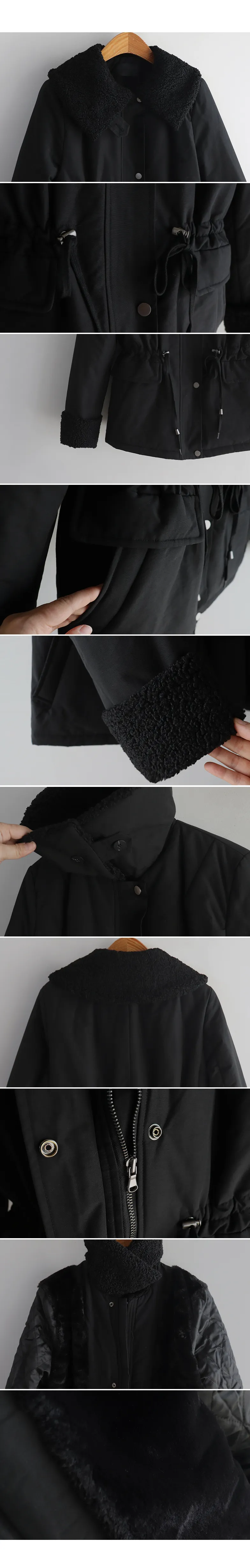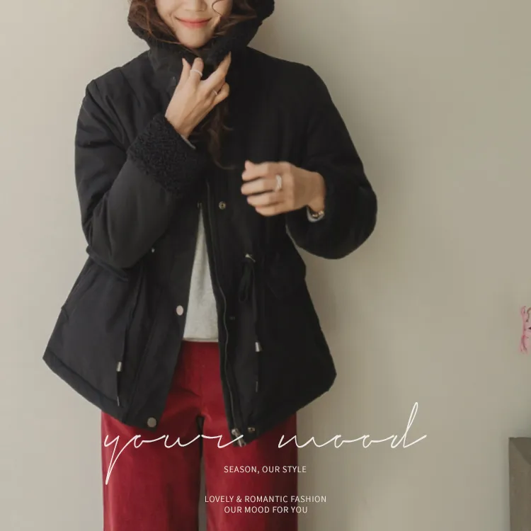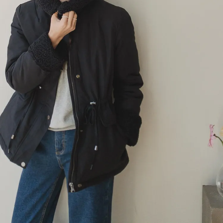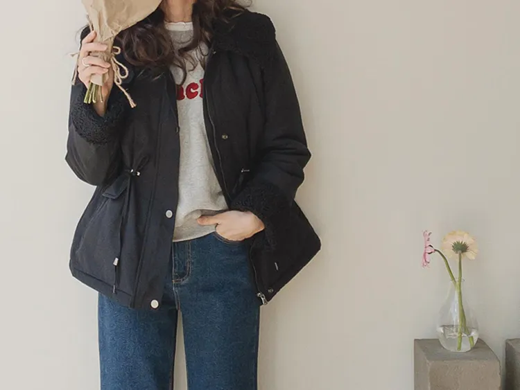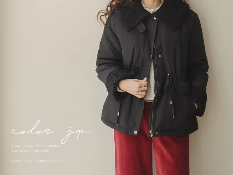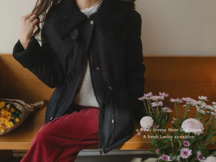 溫暖配色領口袖末毛絨抽繩收腰外套
