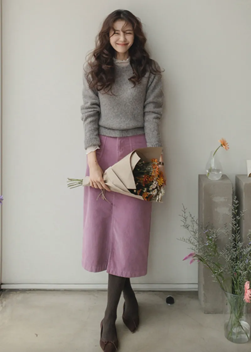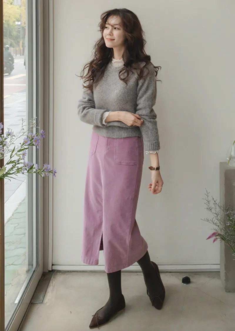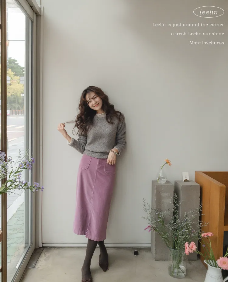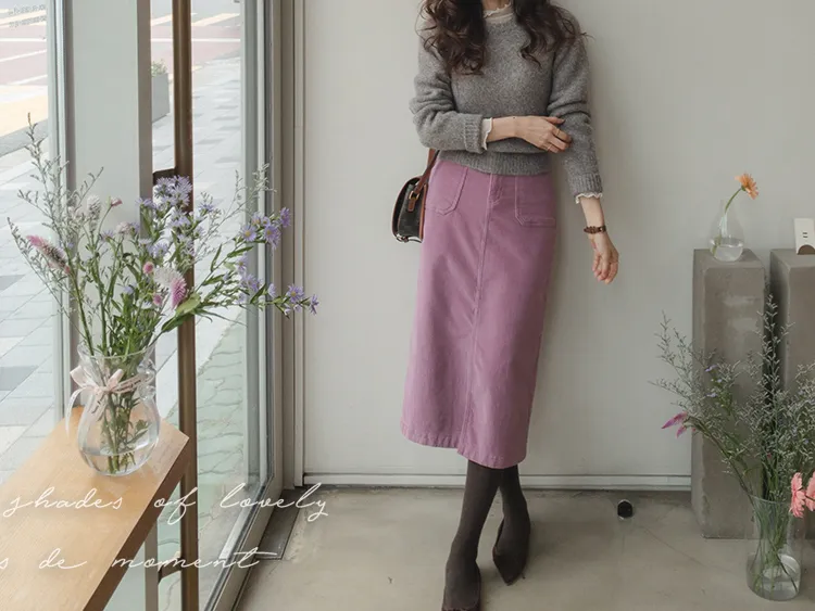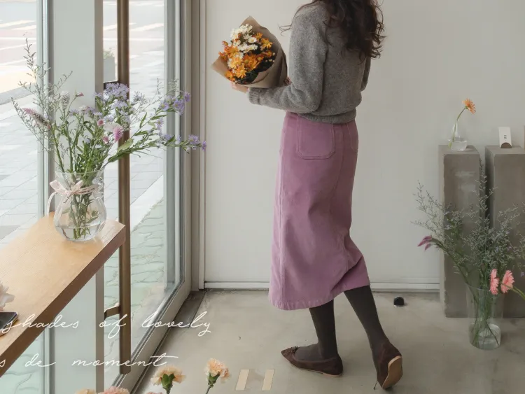 沉穩簡約H剪裁前開衩腰部隱藏鬆緊燈芯絨中長裙 現貨粉M