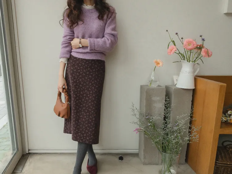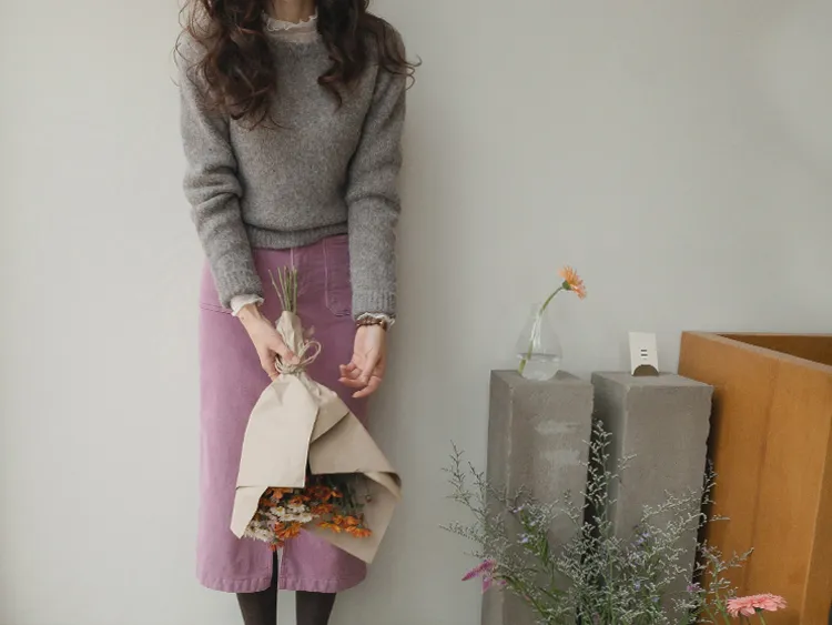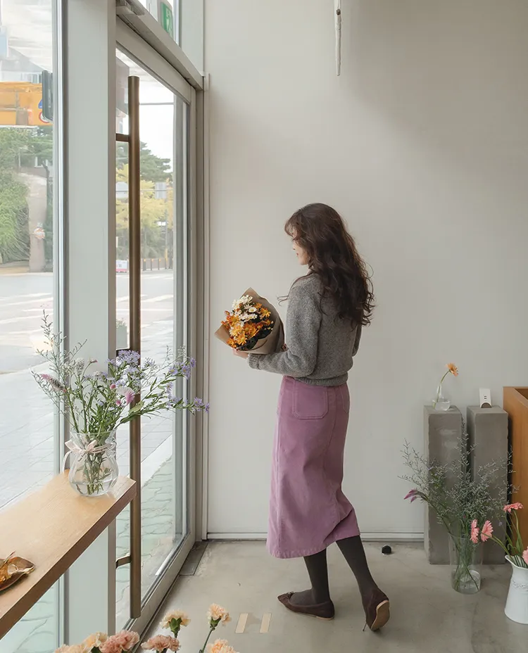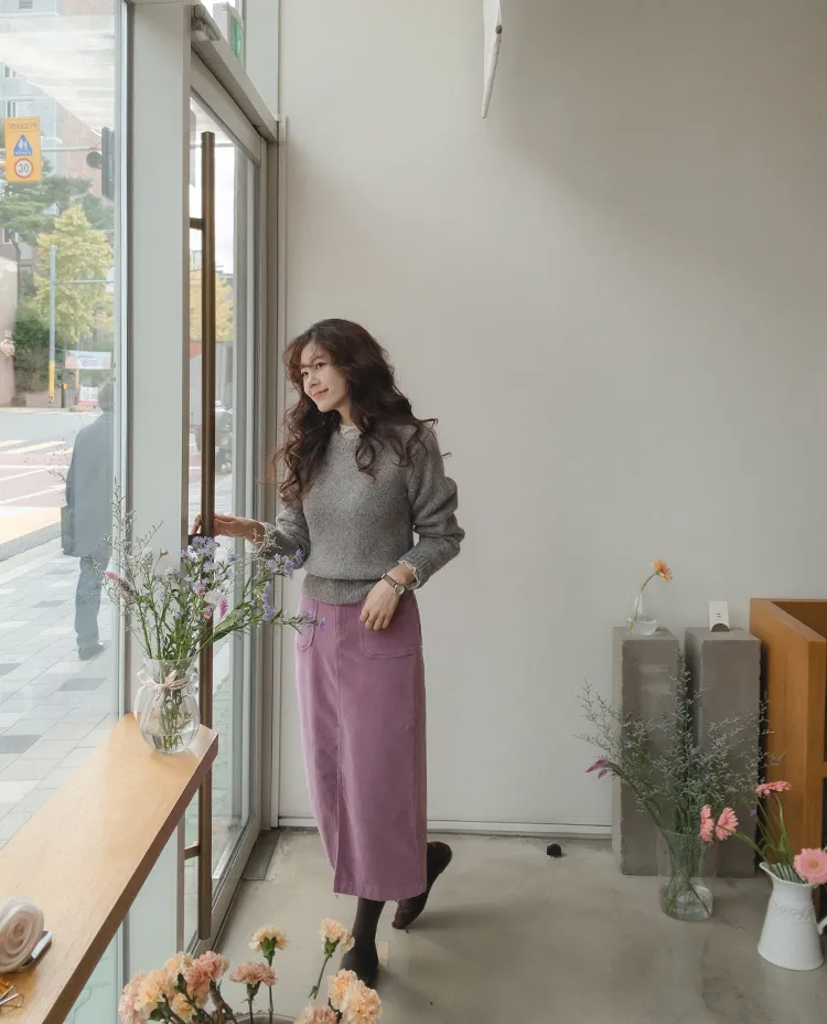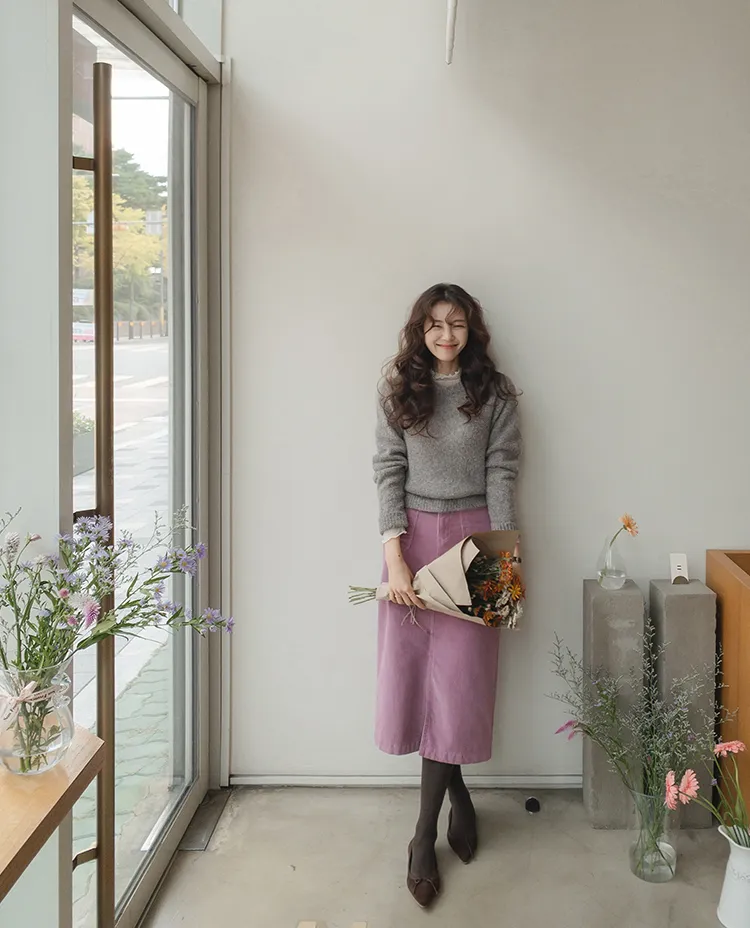 沉穩簡約H剪裁前開衩腰部隱藏鬆緊燈芯絨中長裙 現貨粉M