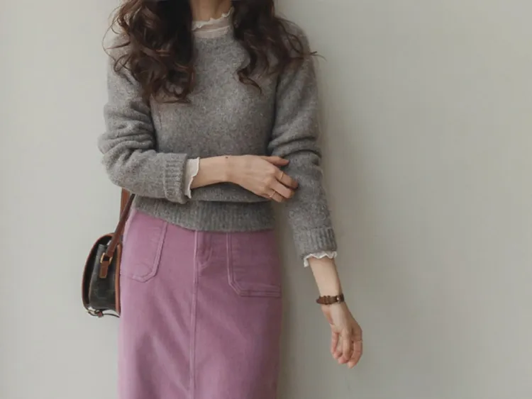 可愛微妙蕾絲線條波浪邊半高領內搭透膚上衣