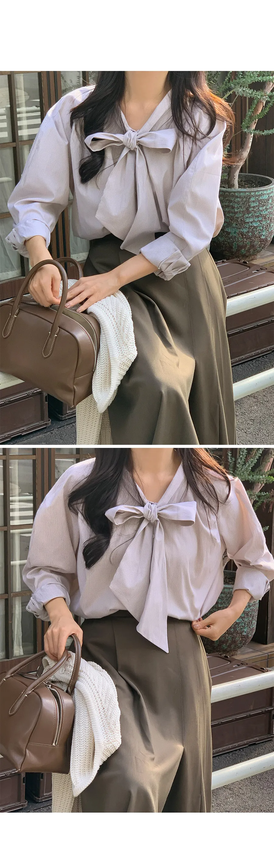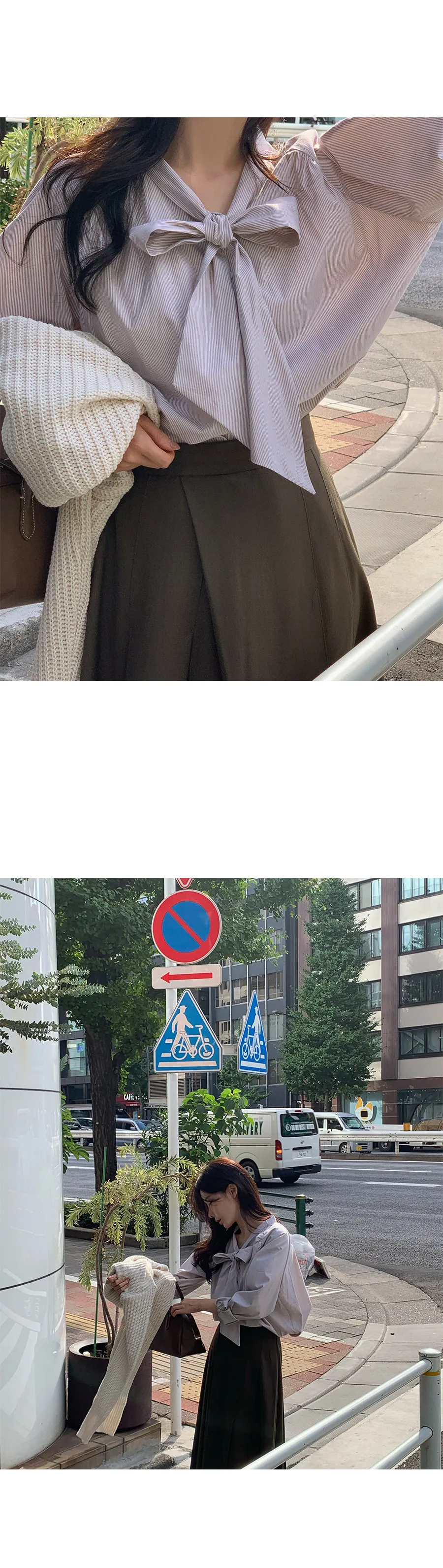 雅緻大領綁帶連肩設計條紋排扣上衣