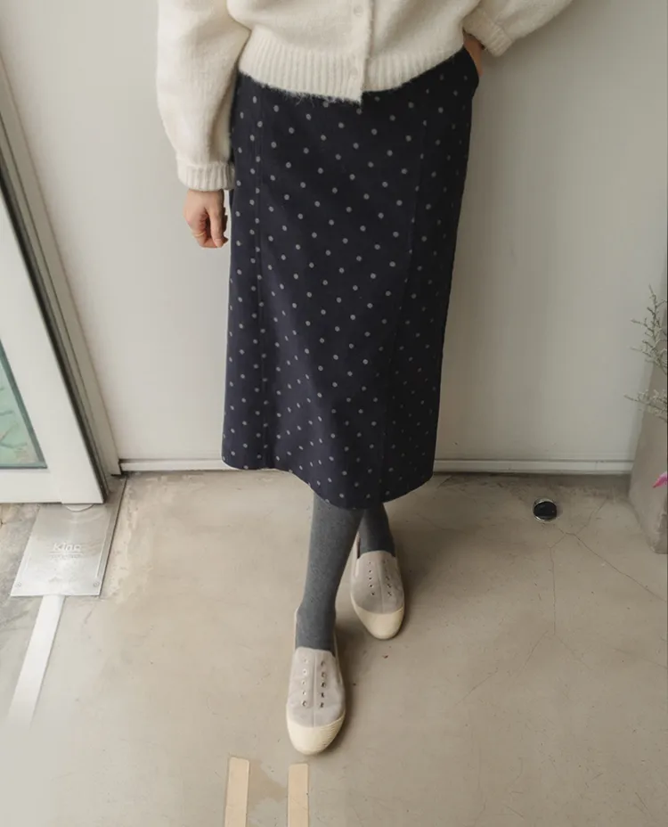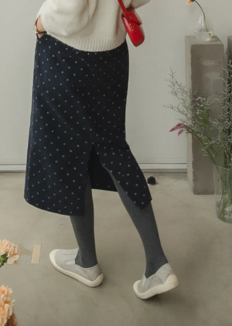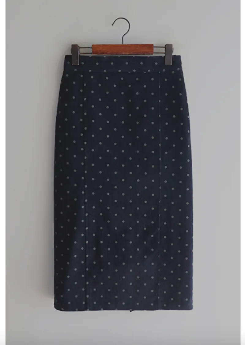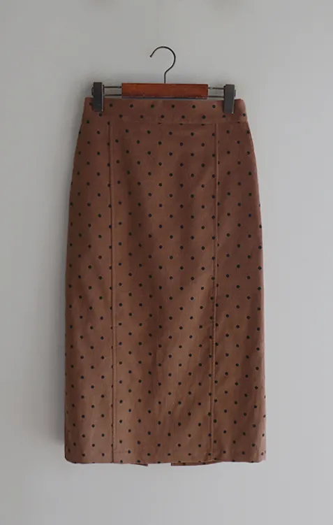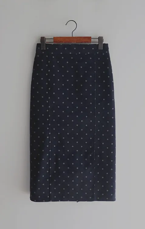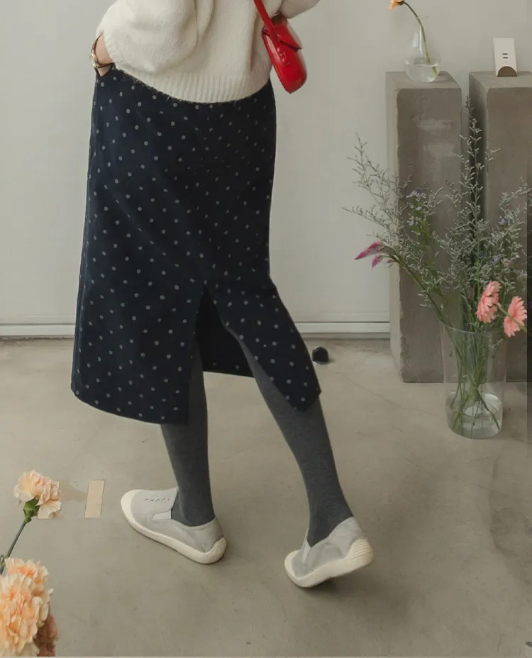 浪漫情調圓點點前縫線修身H剪裁後開衩燈芯絨中長裙