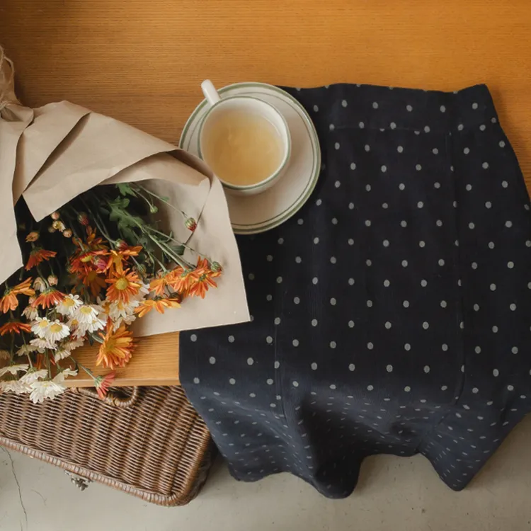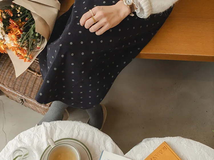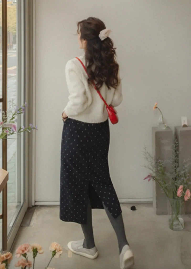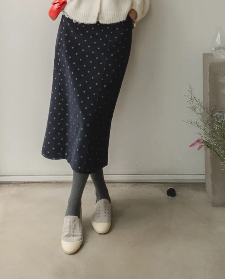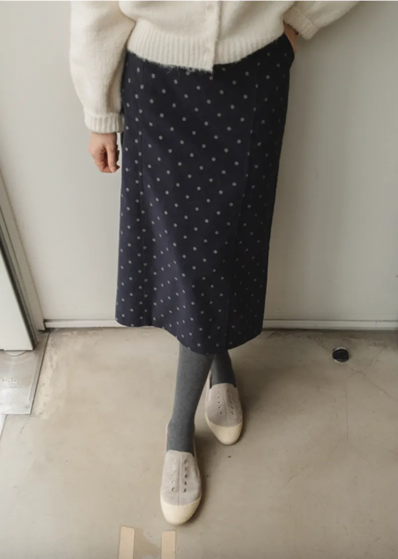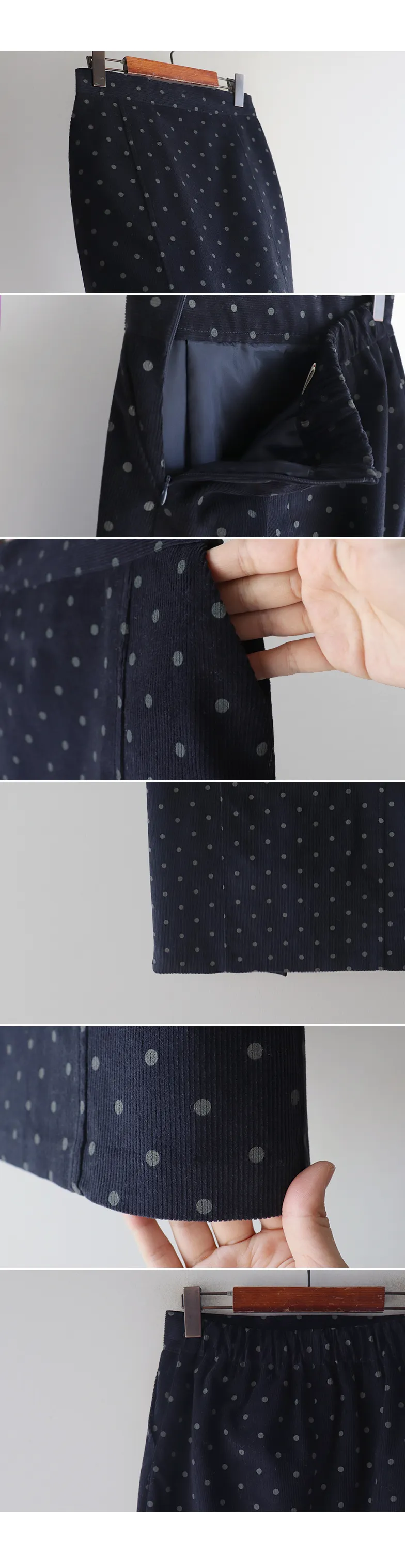 浪漫情調圓點點前縫線修身H剪裁後開衩燈芯絨中長裙