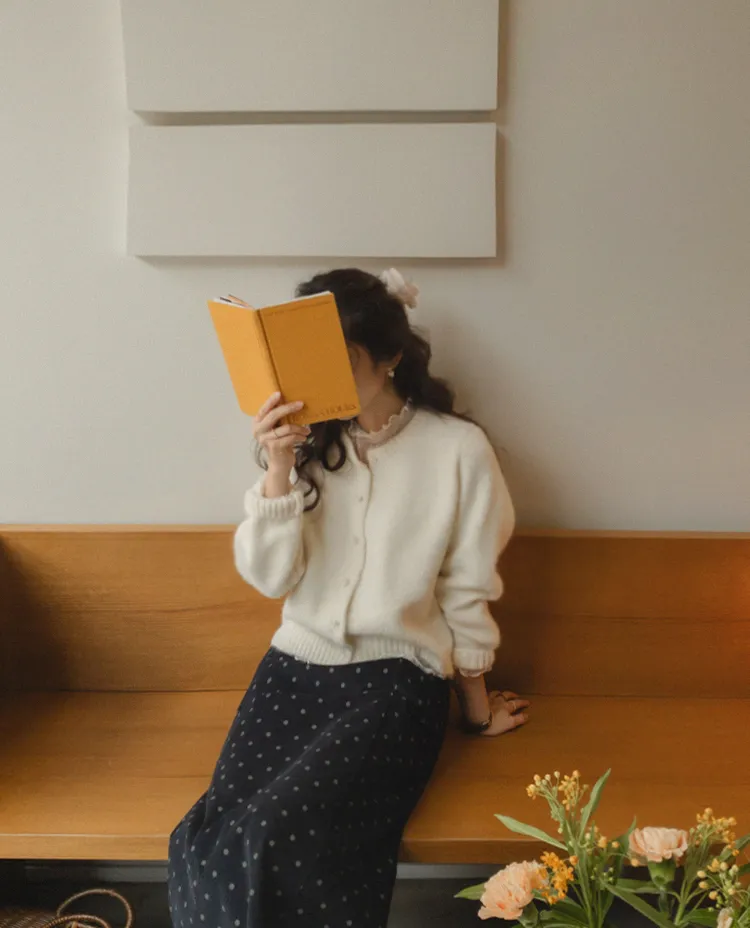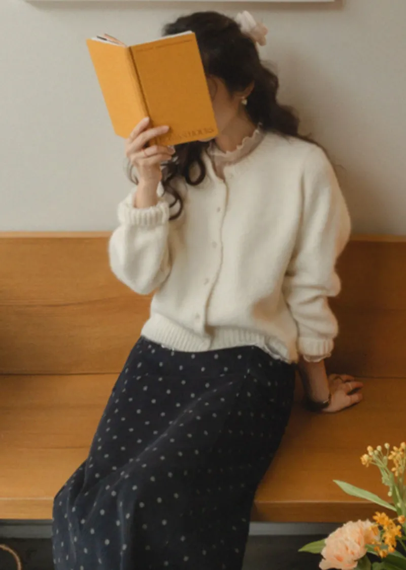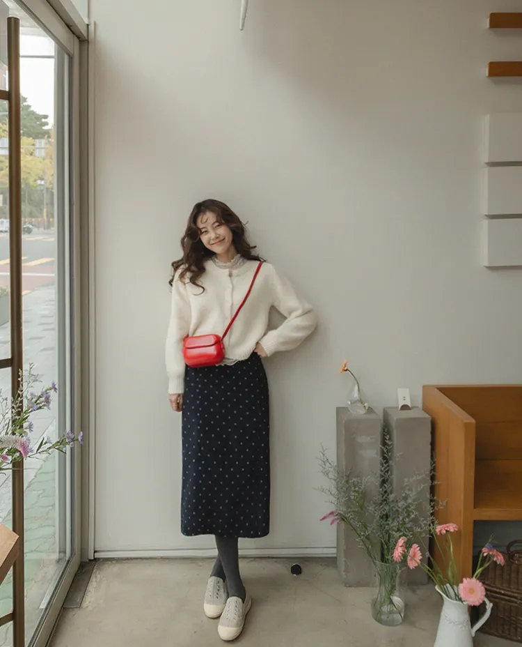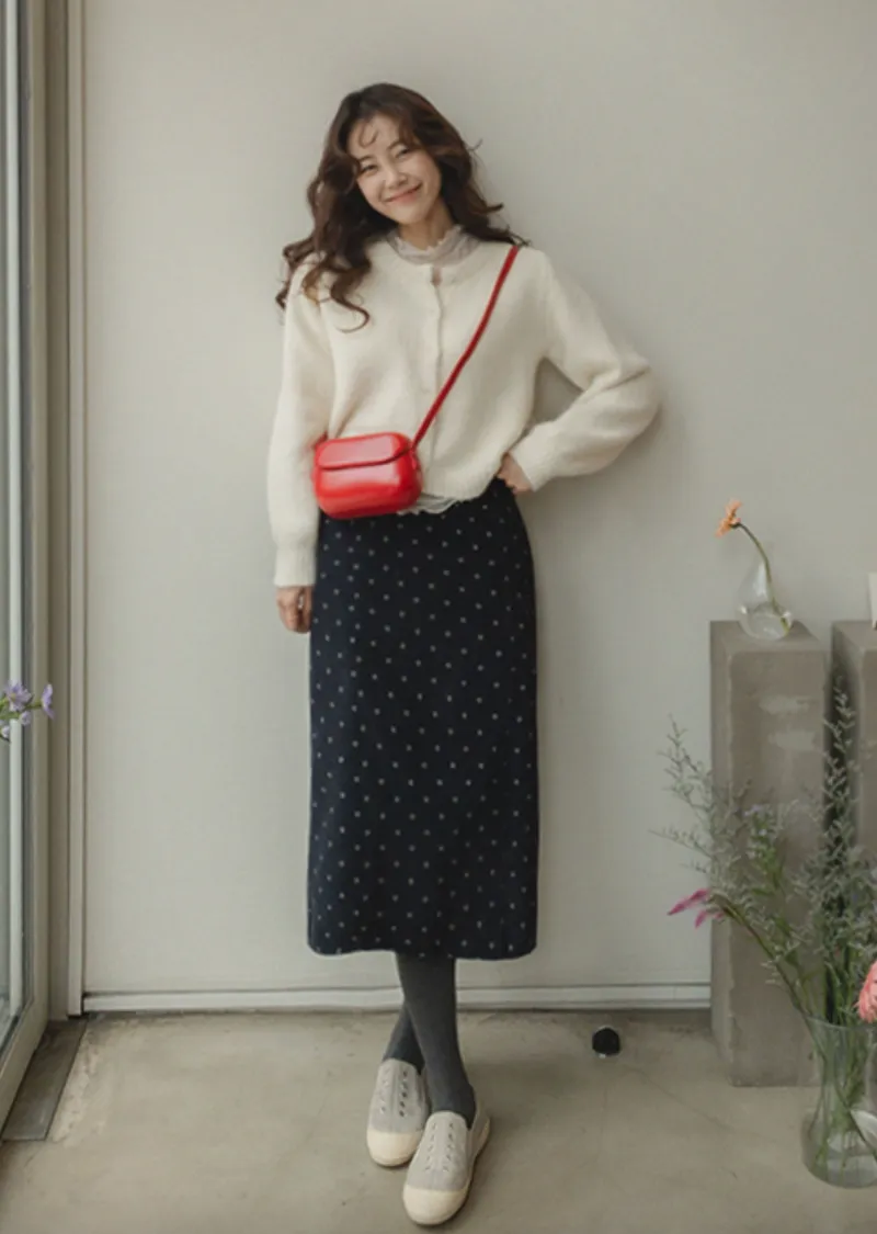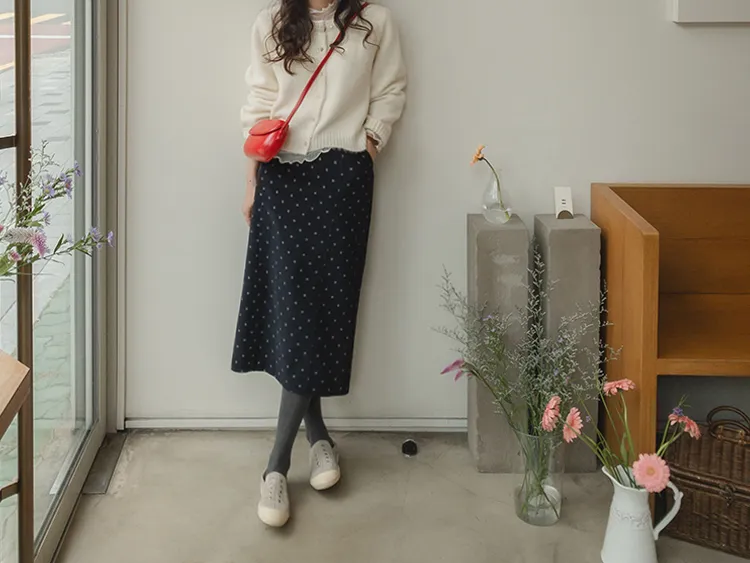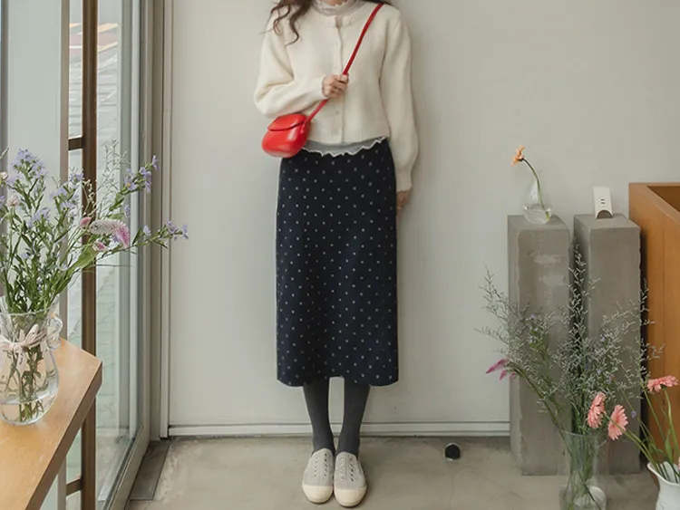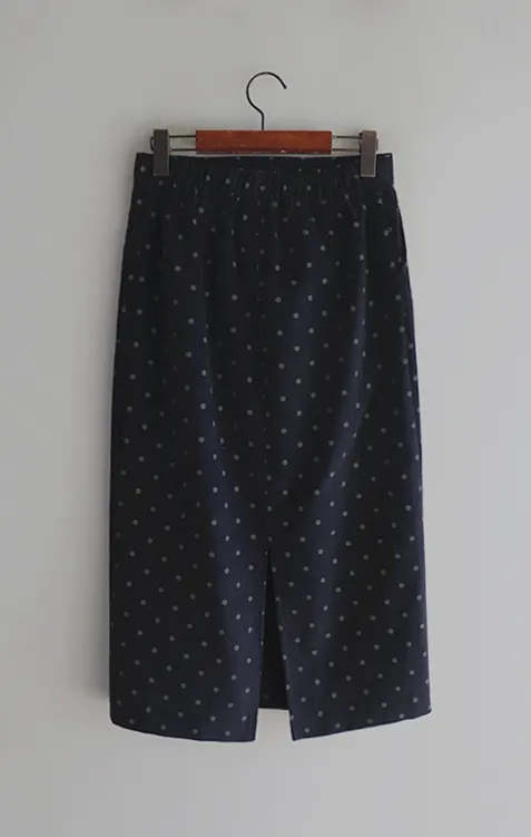 浪漫情調圓點點前縫線修身H剪裁後開衩燈芯絨中長裙