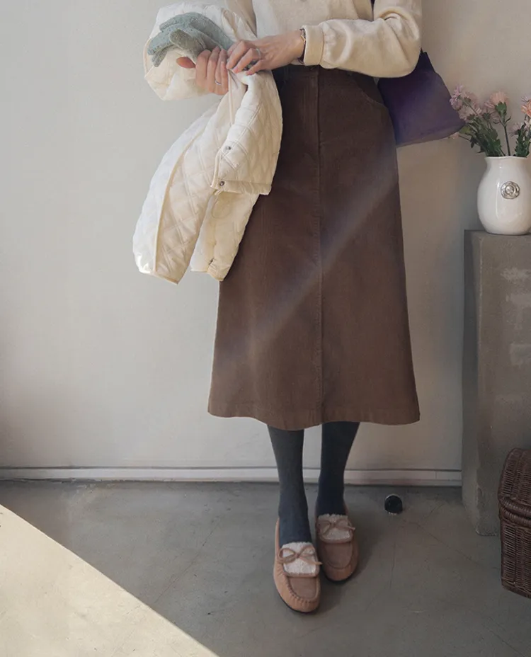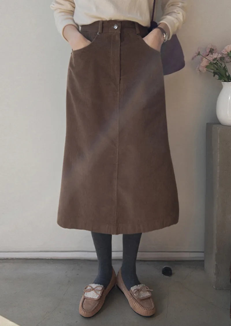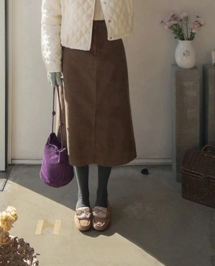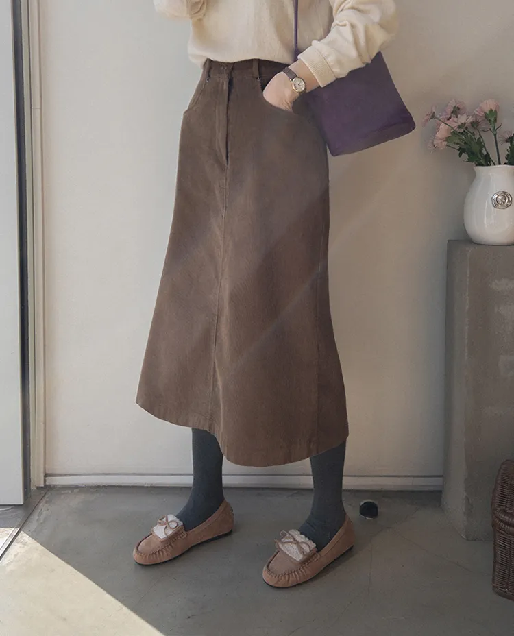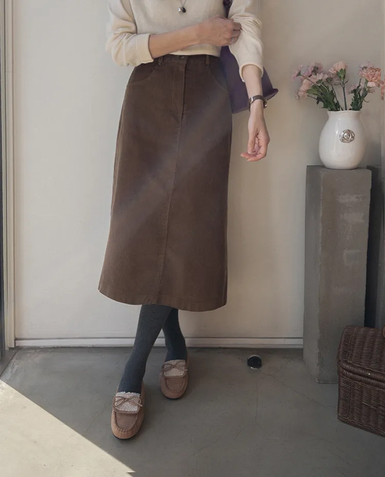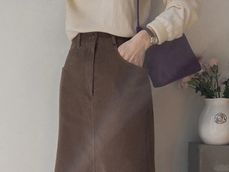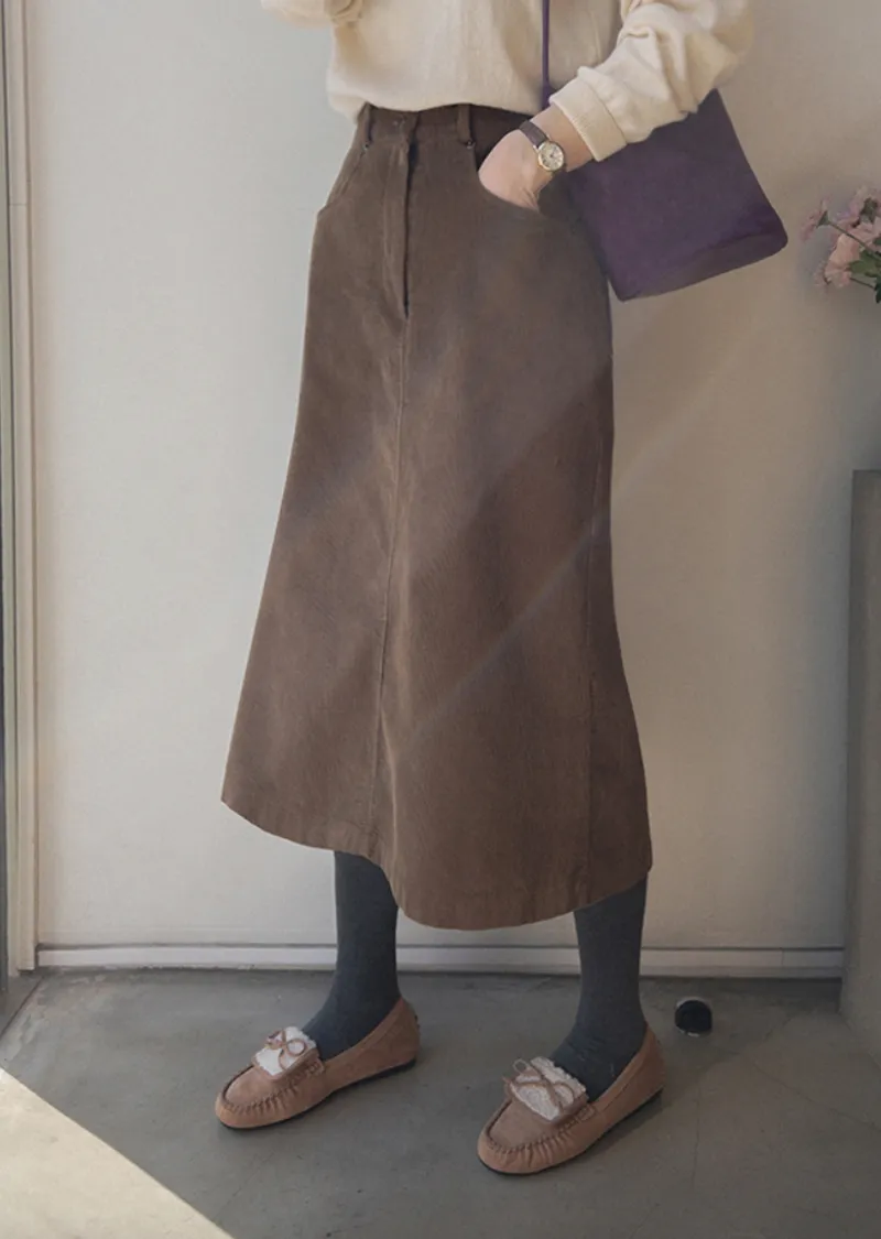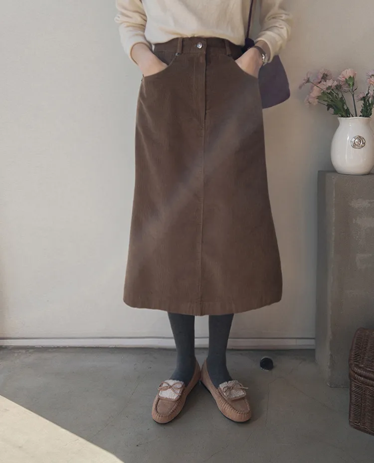 冬季舒適A字剪裁後開衩燈芯絨中長裙