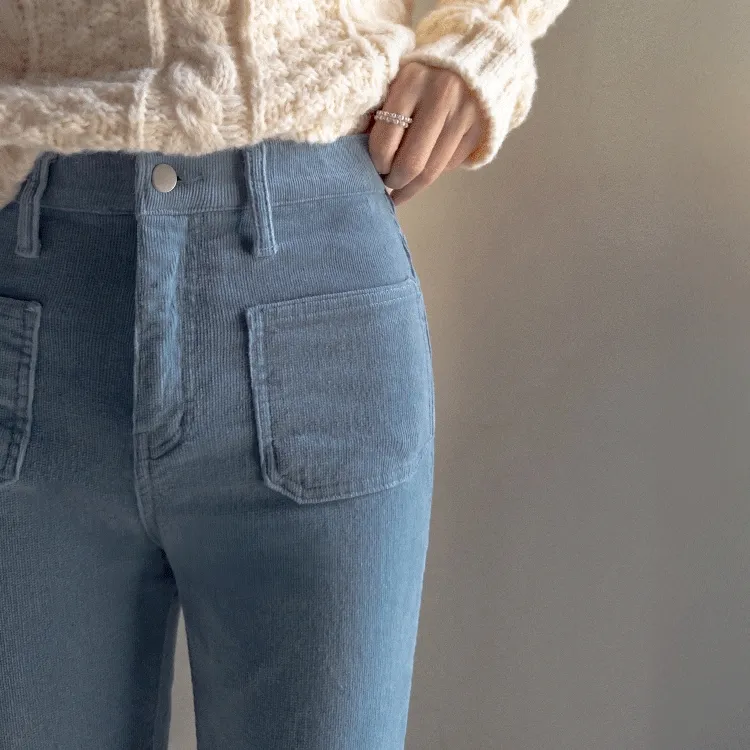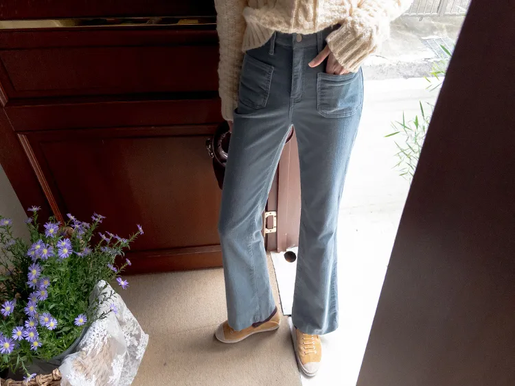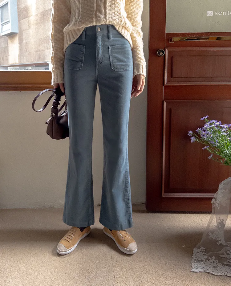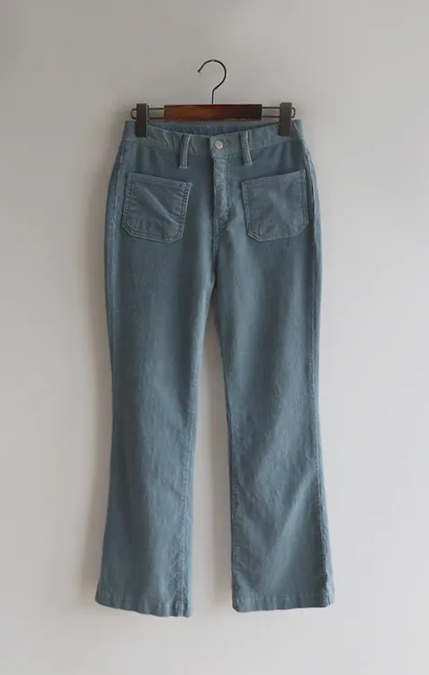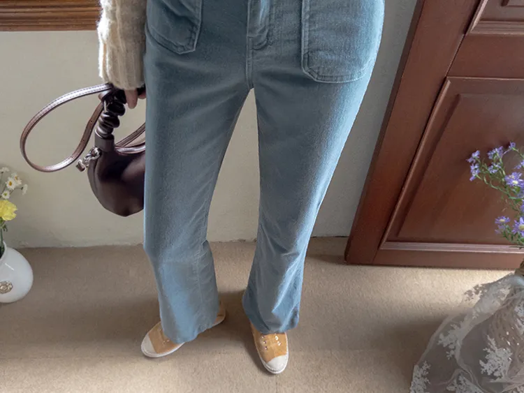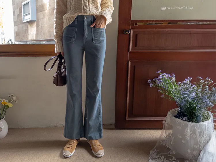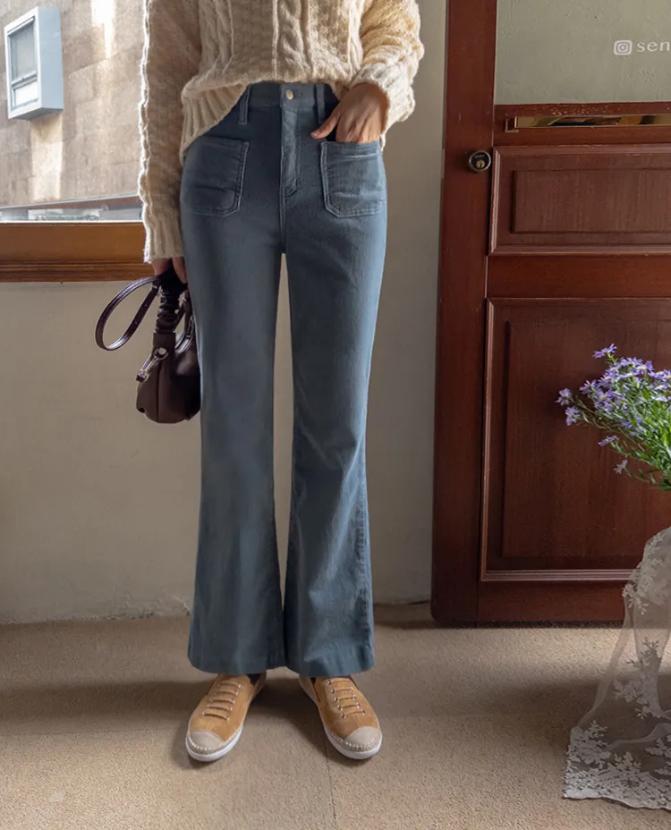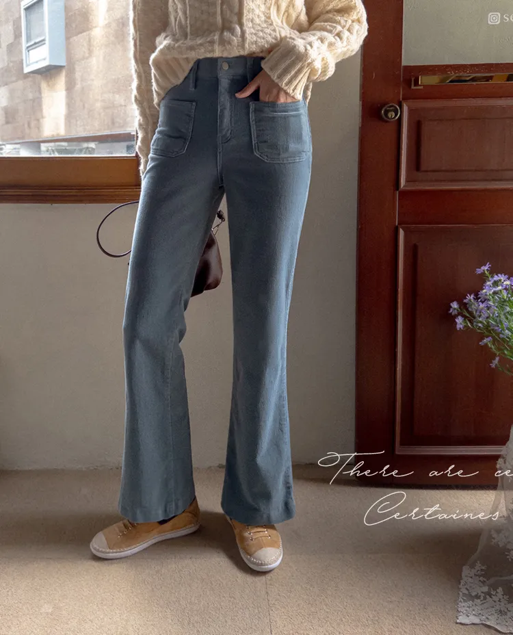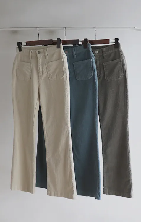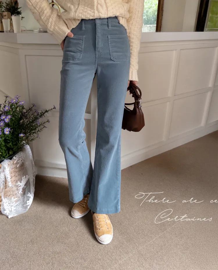 柔和色感方形口袋點綴靴型剪裁修身燈芯絨休閒褲