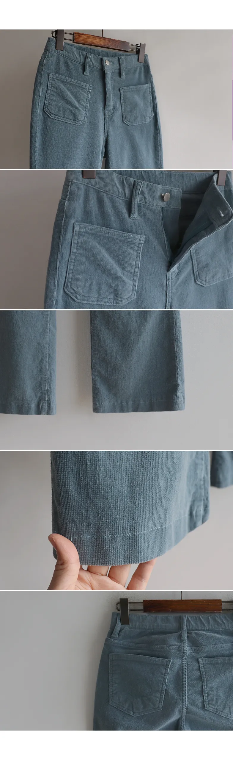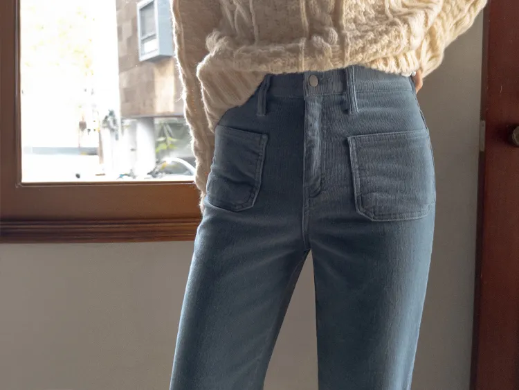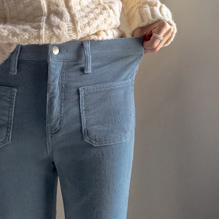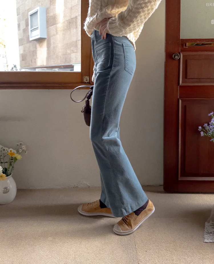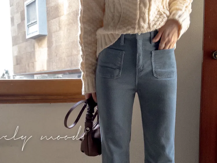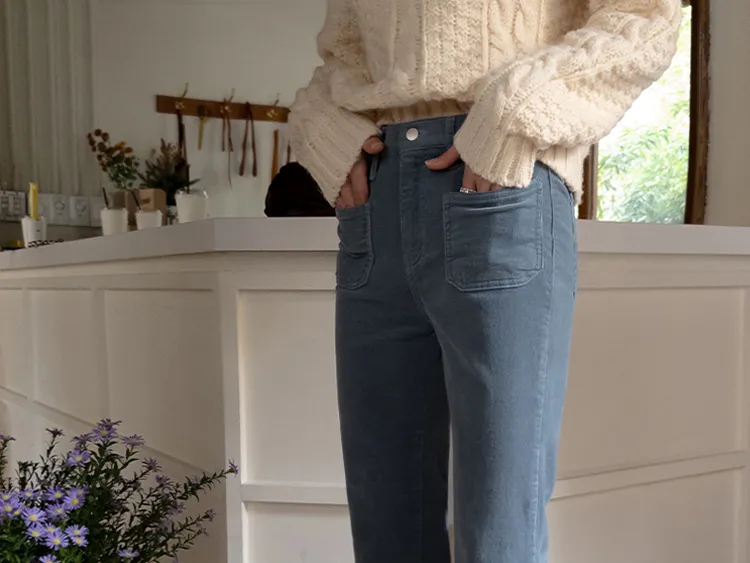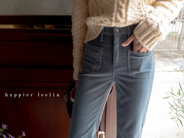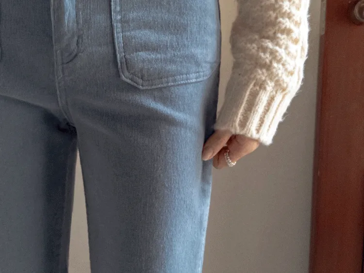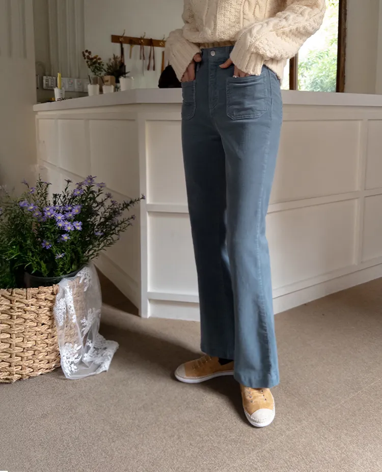 柔和色感方形口袋點綴靴型剪裁修身燈芯絨休閒褲