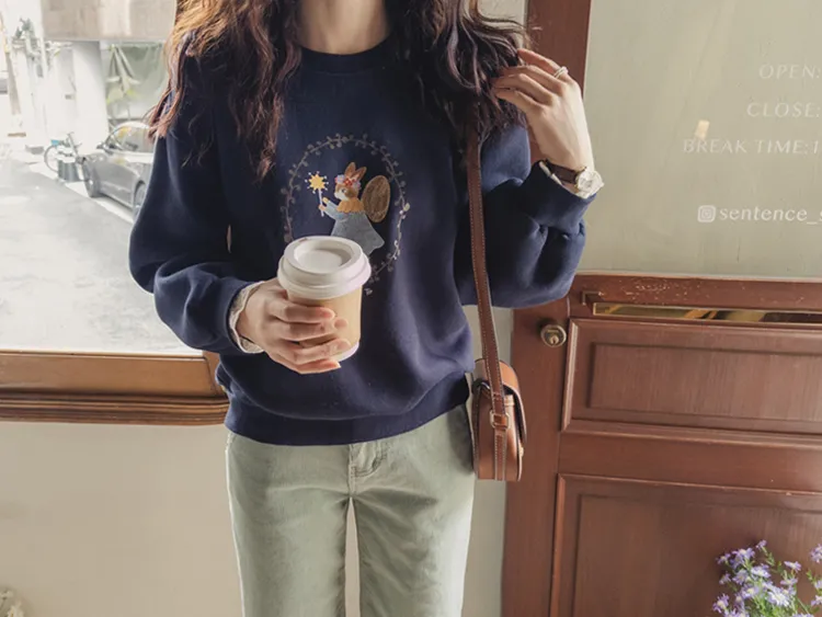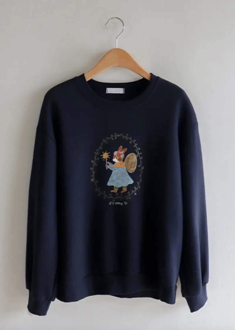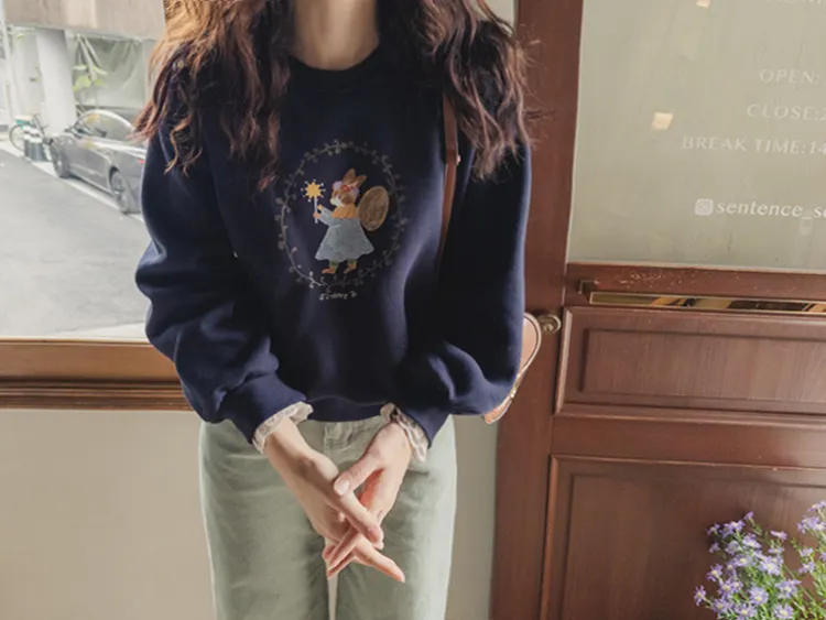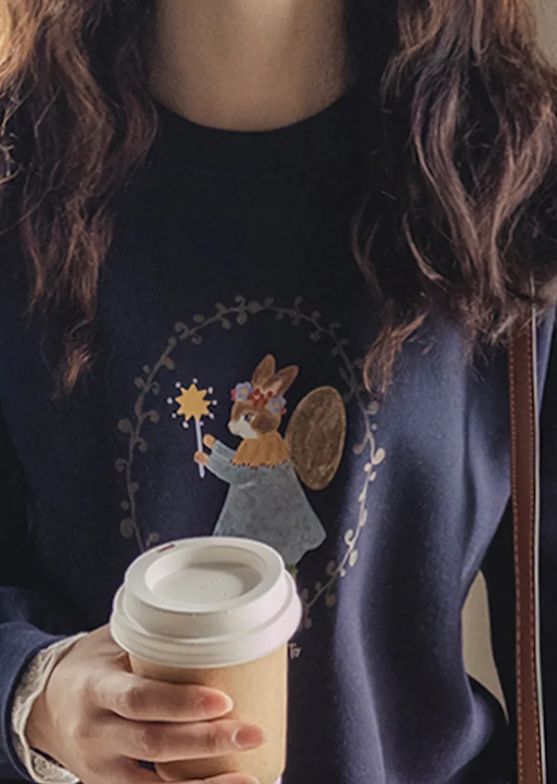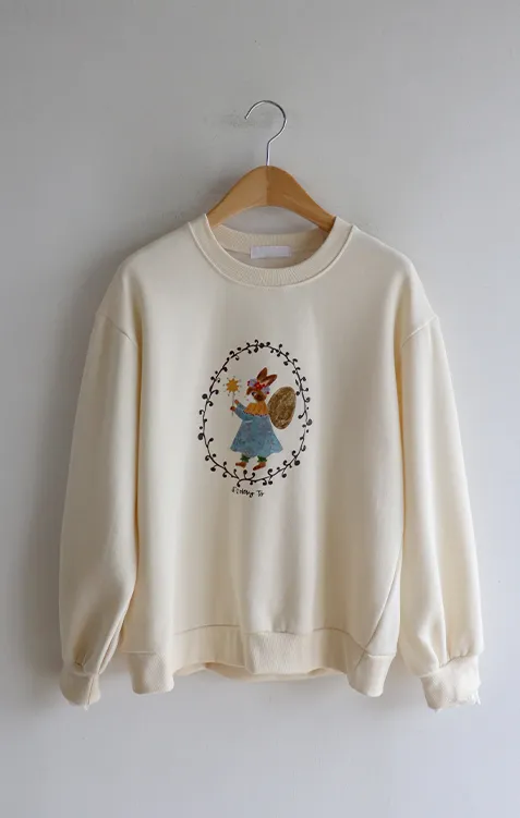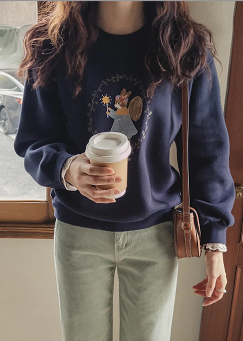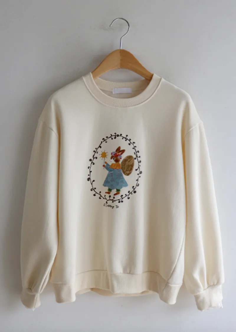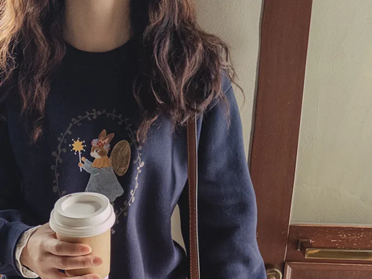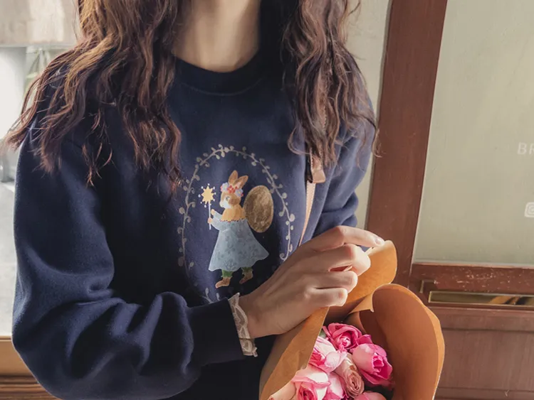 【袖子蕾絲設計增加可愛感-♥】【拉絨布料冬天也保暖】【可愛的兔子印花好可愛~>,<】【寬鬆廓形打造精緻合身~