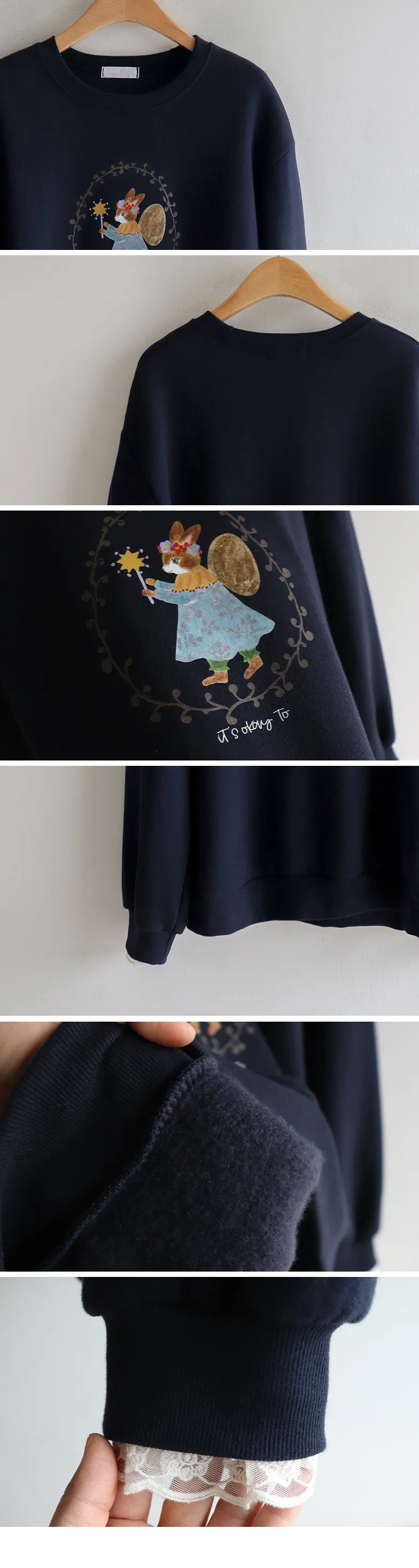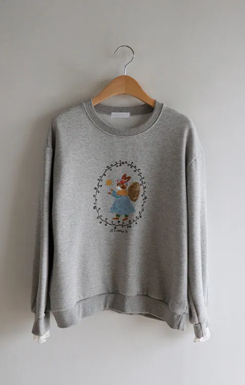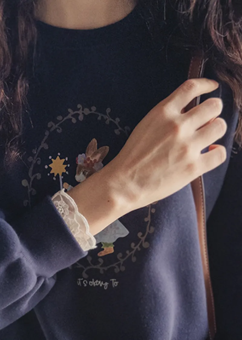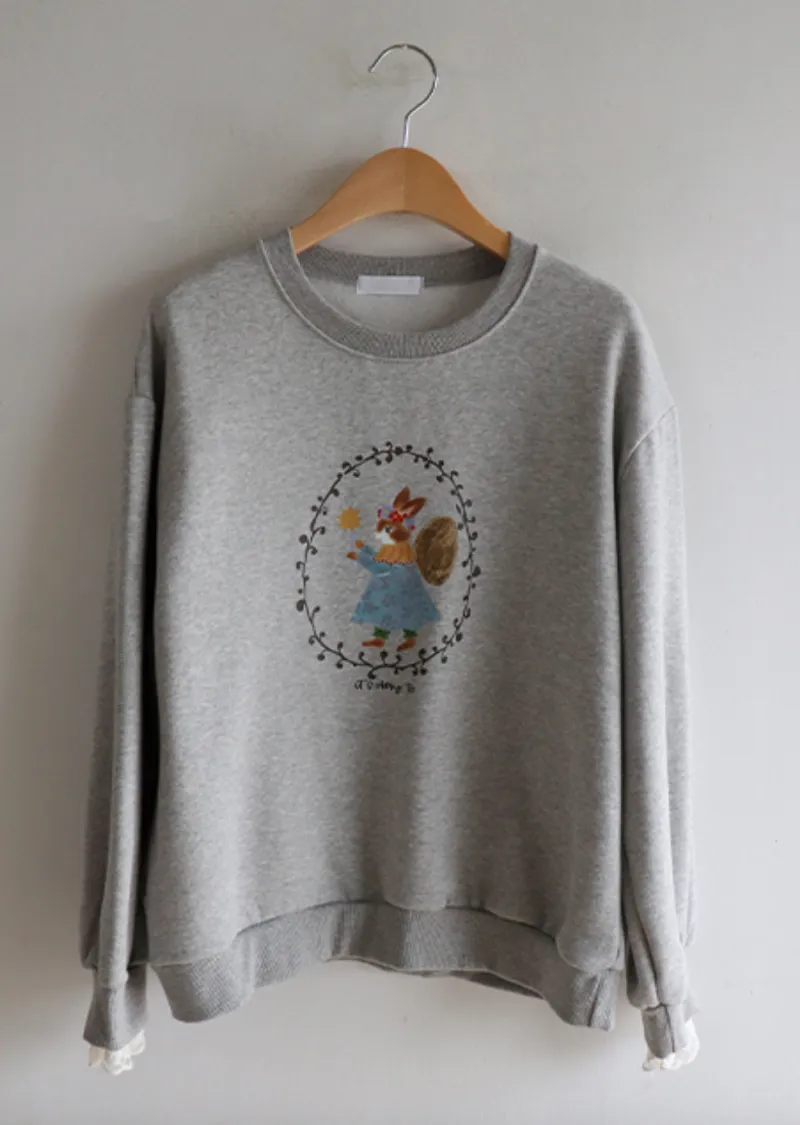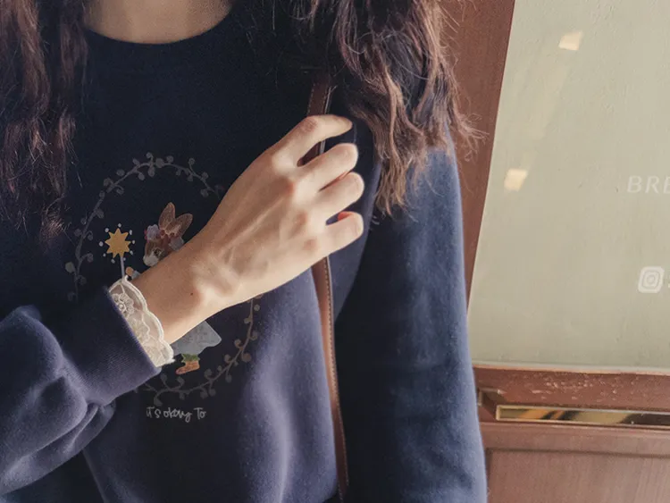 可愛兔子印花點綴袖末蕾絲刷毛上衣