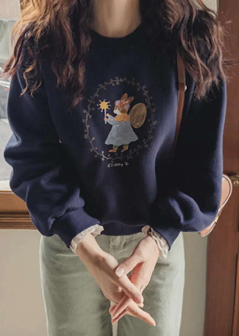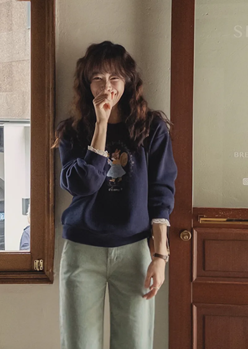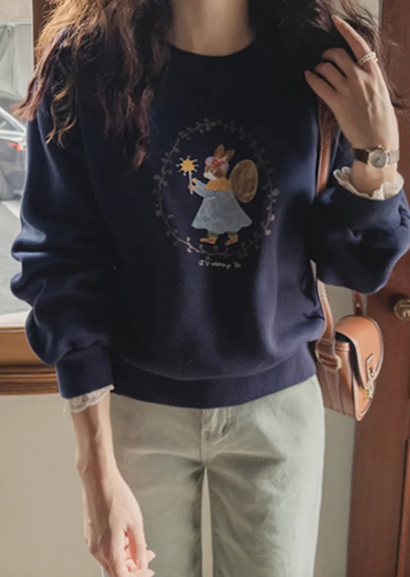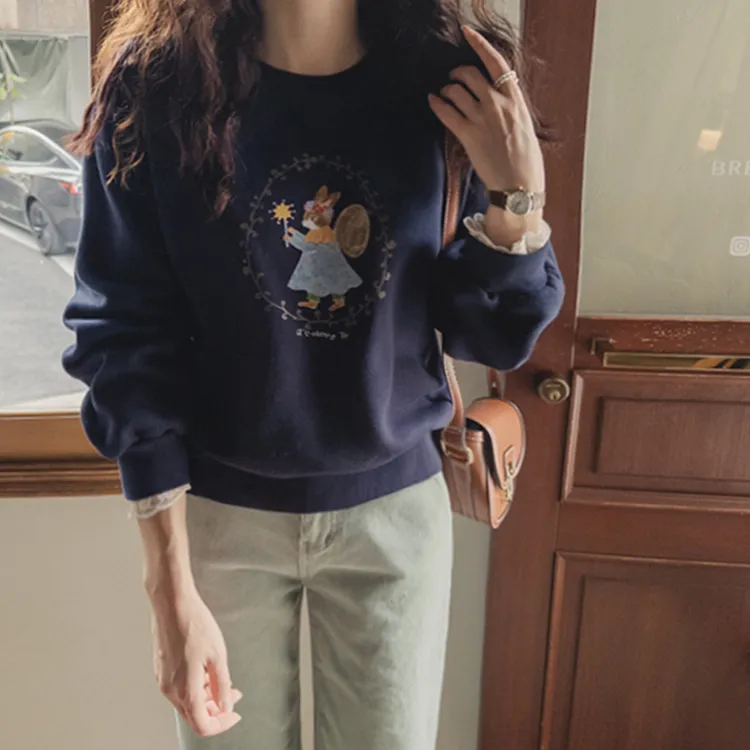 可愛兔子印花點綴袖末蕾絲刷毛上衣