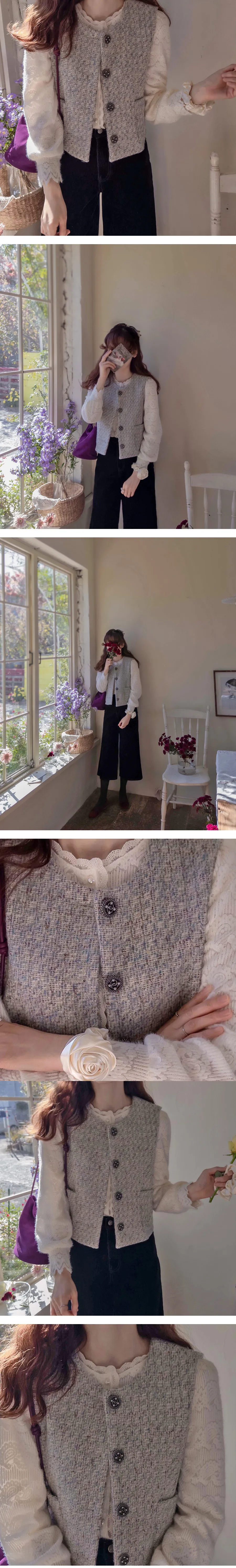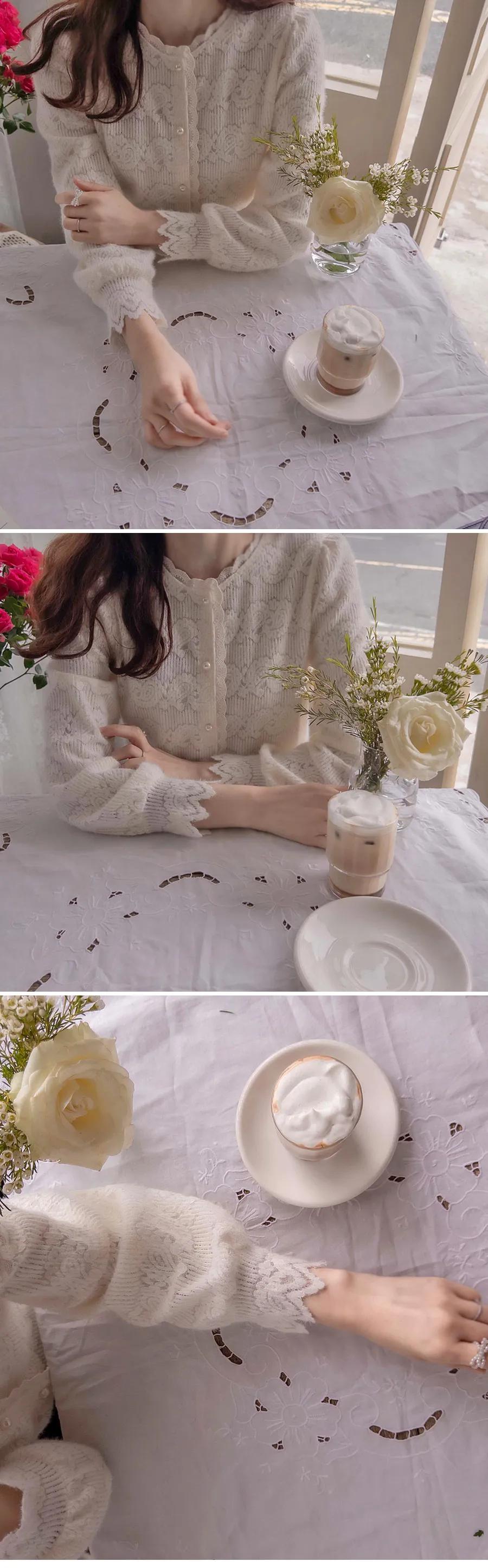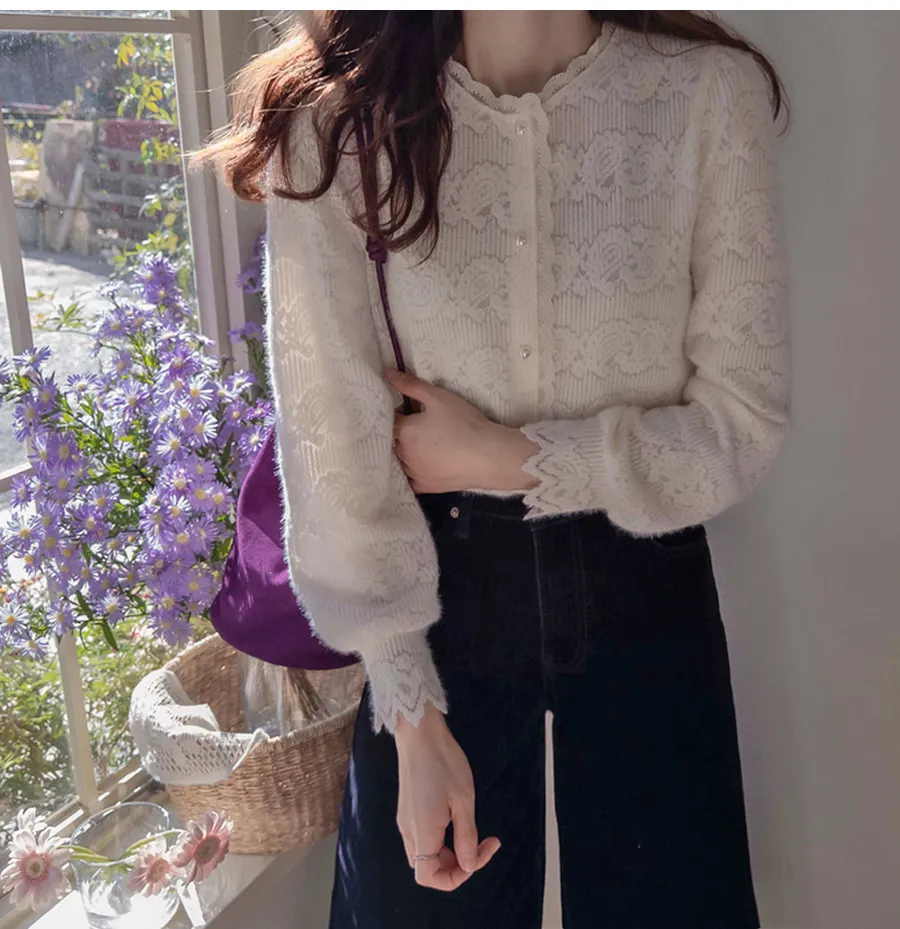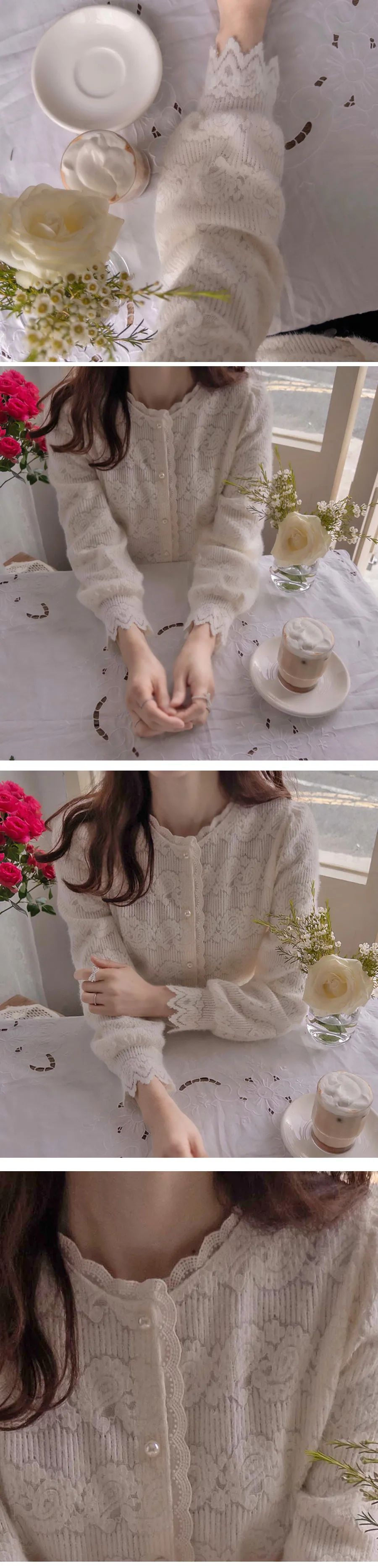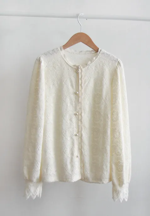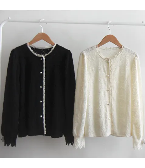 【非常可愛的排扣上衣,彈性拉絨蕾絲布料】【領口是波浪形蕾絲,給人一種優雅的感覺】【浪漫魅力推薦作為合身的拉絨排扣上衣