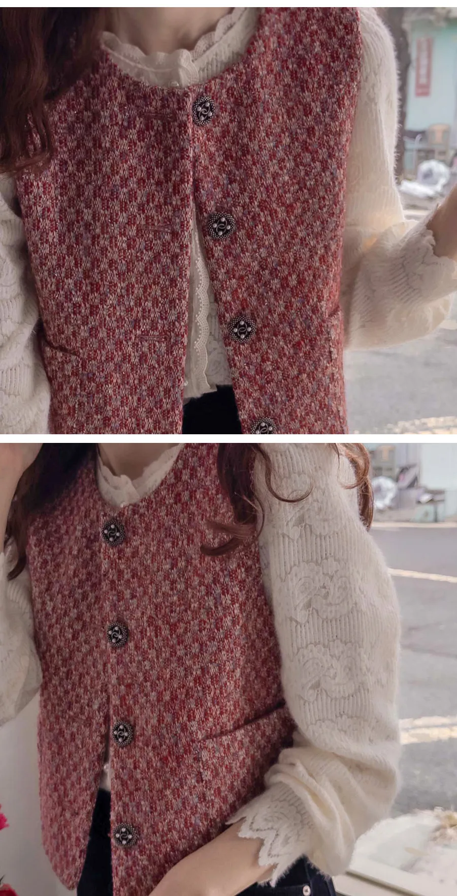 優雅波浪蕾絲領柔軟刷毛排扣上衣