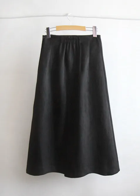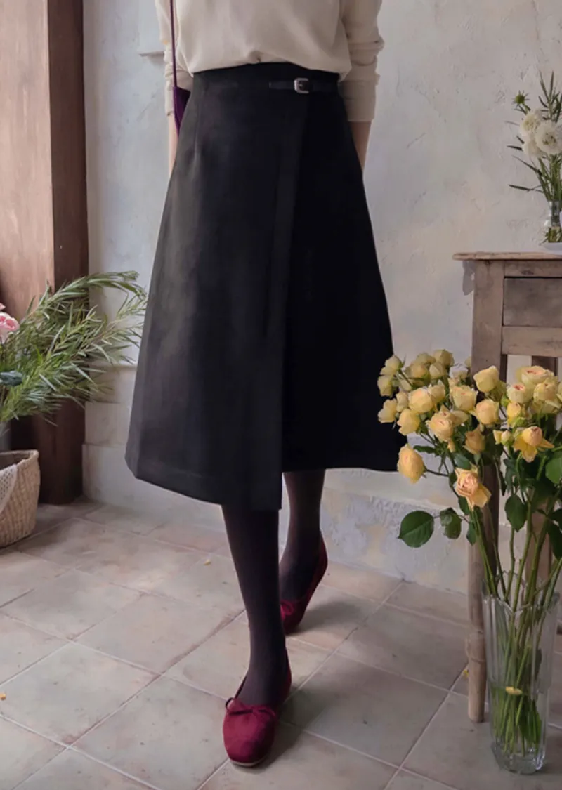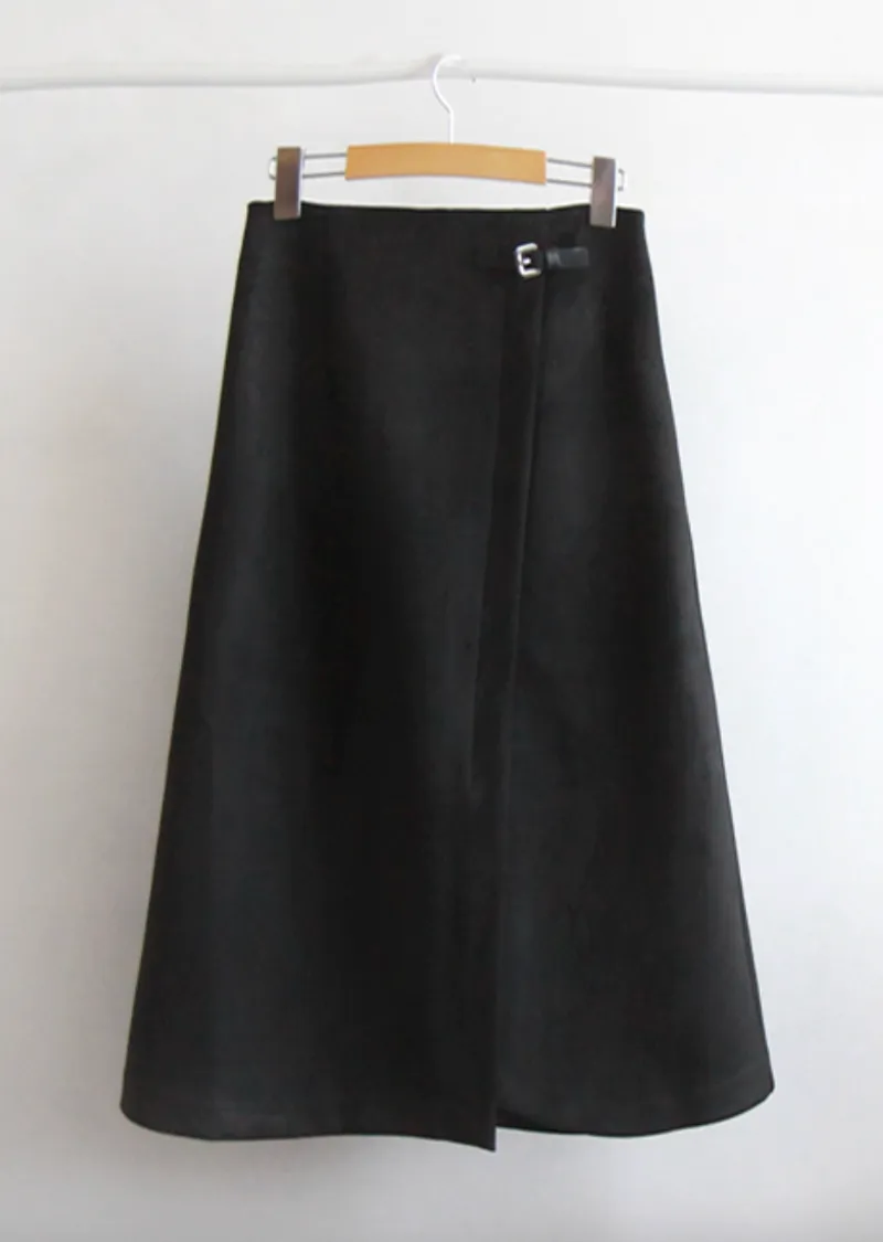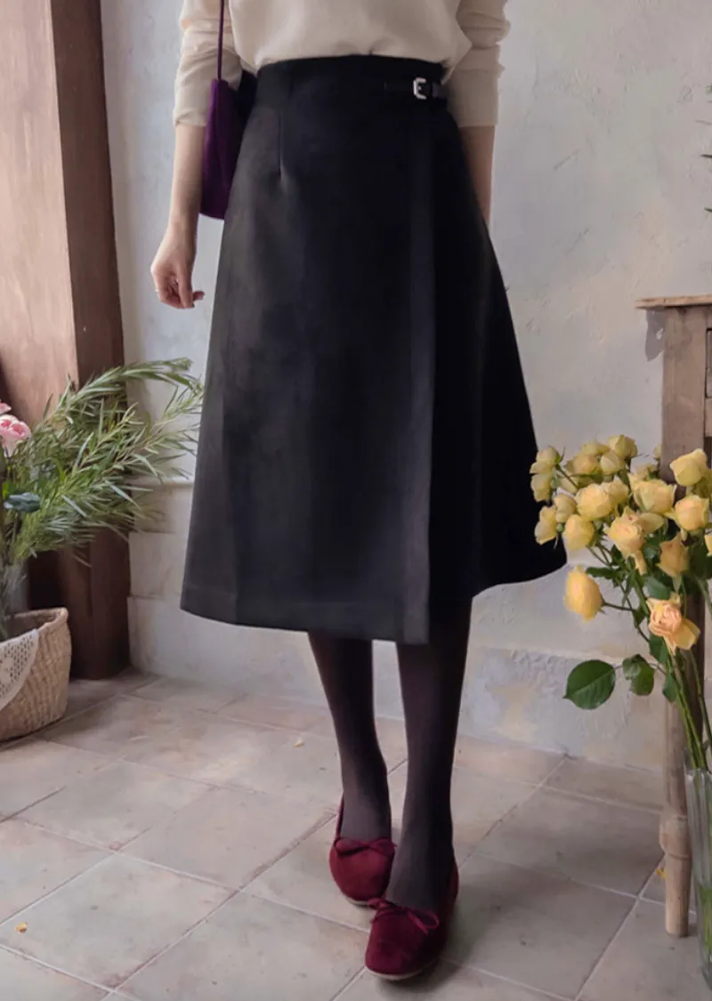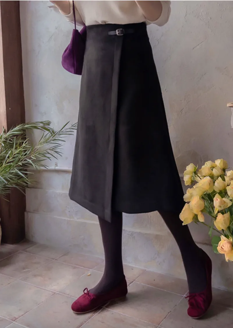 古典情調側釦裝飾線條剪裁麂皮中長裙