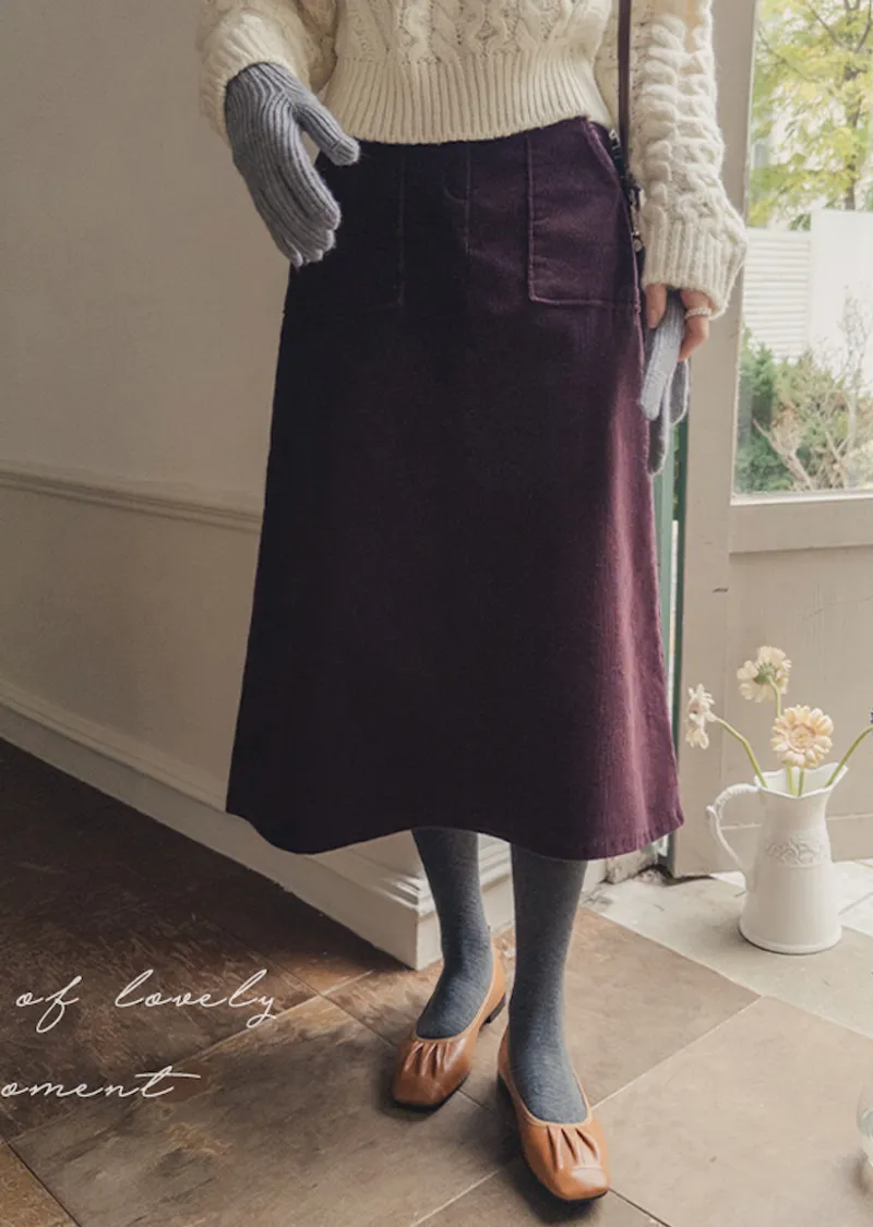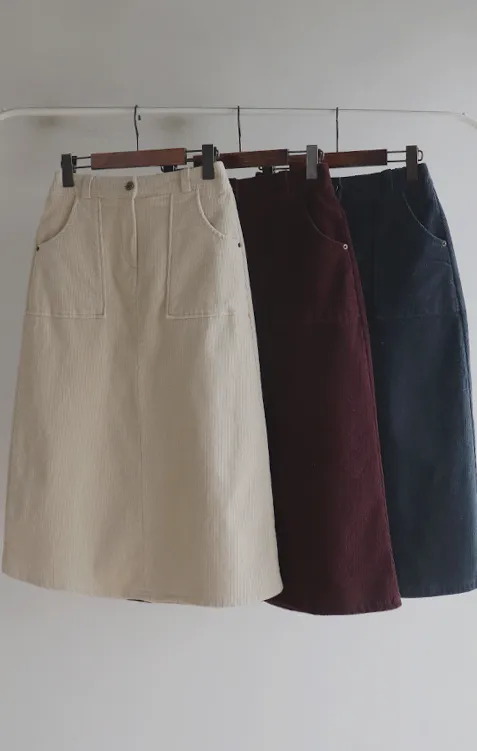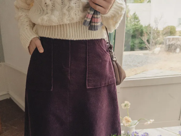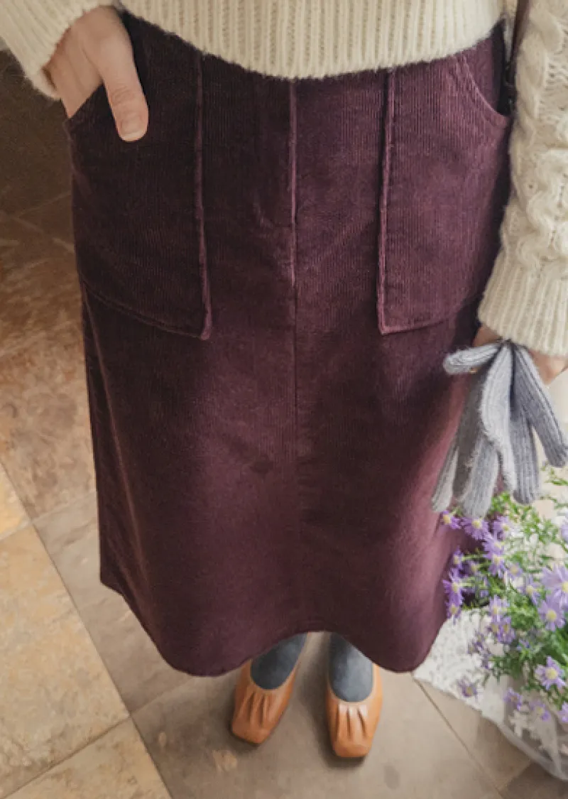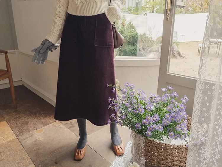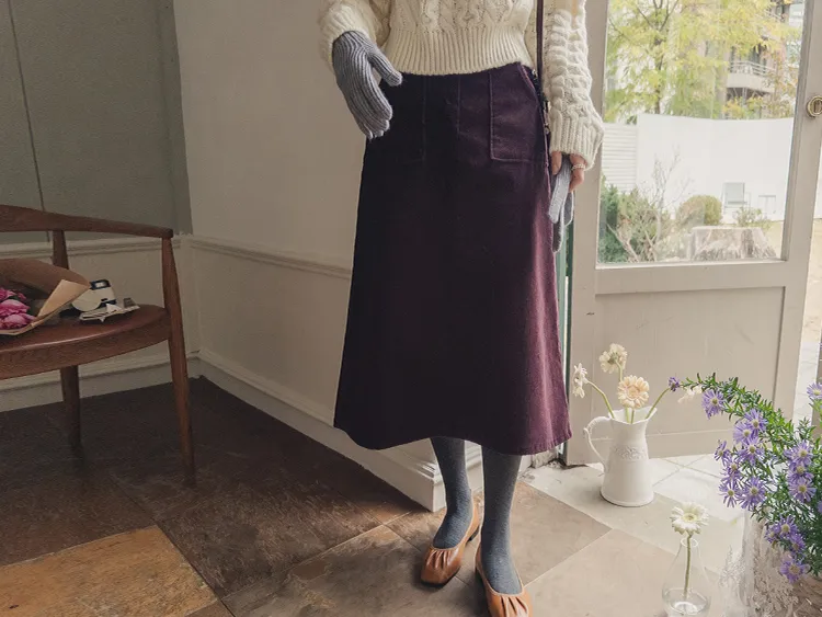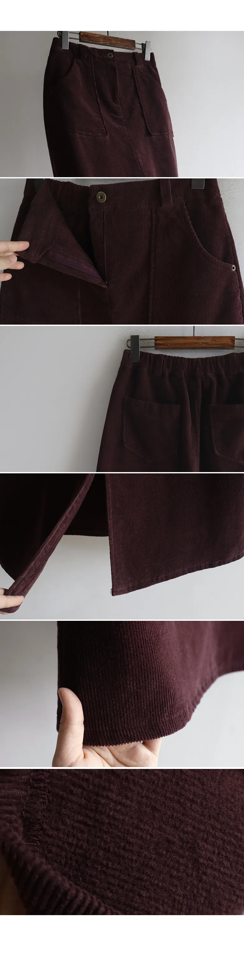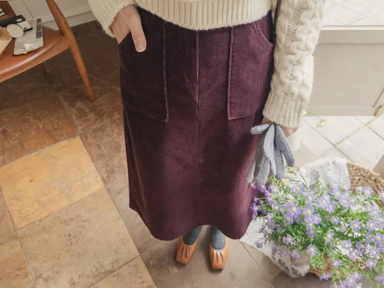 迷人A字剪裁後開衩方形口袋燈芯絨中長裙