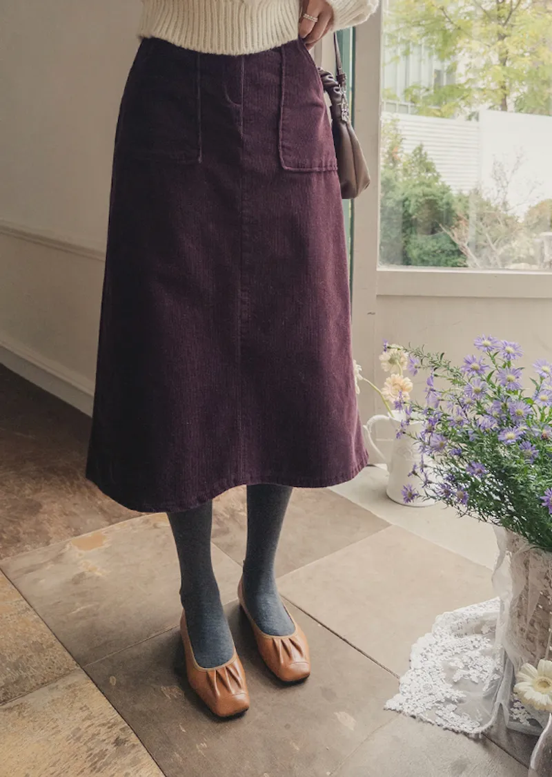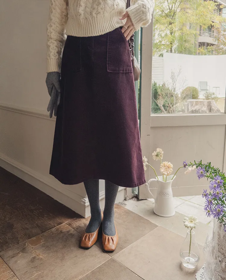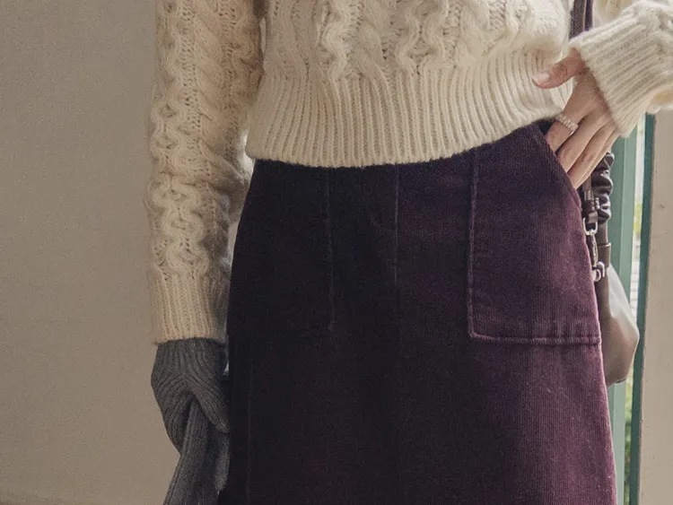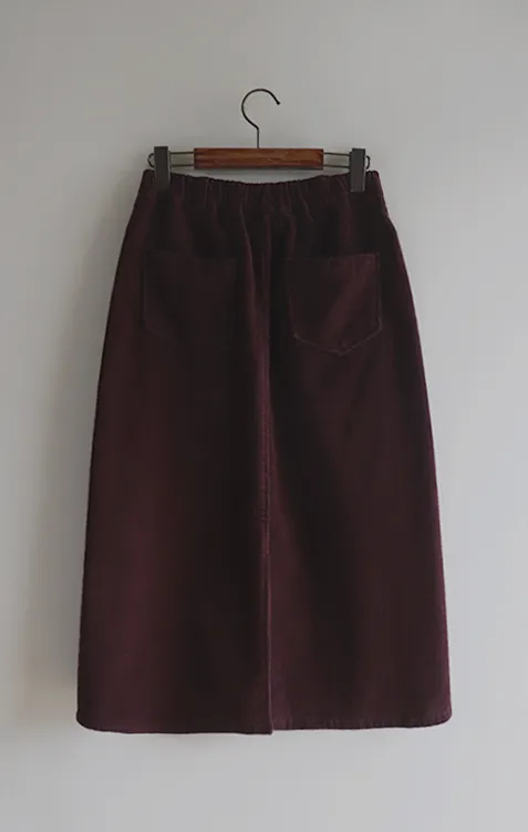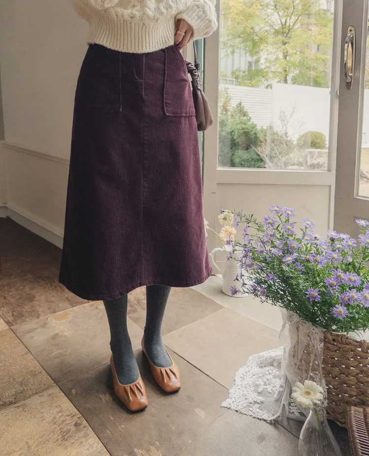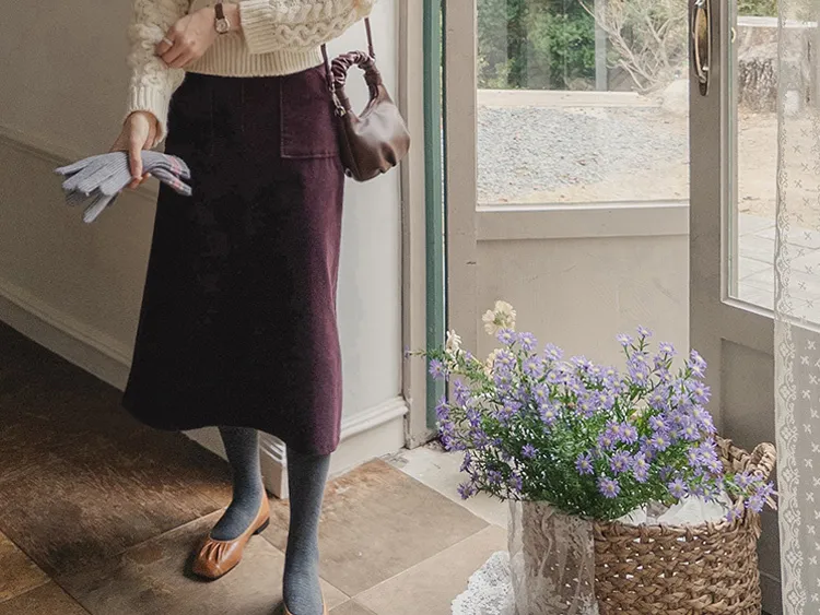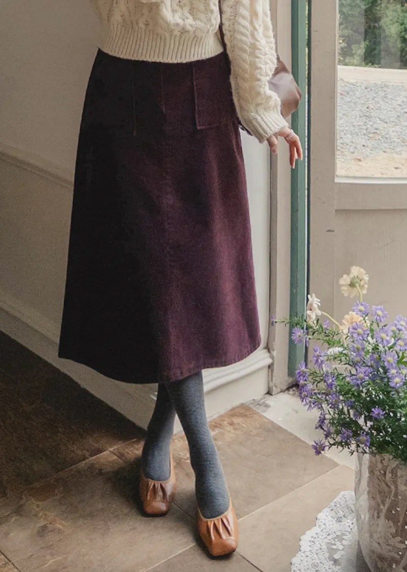 迷人A字剪裁後開衩方形口袋燈芯絨中長裙