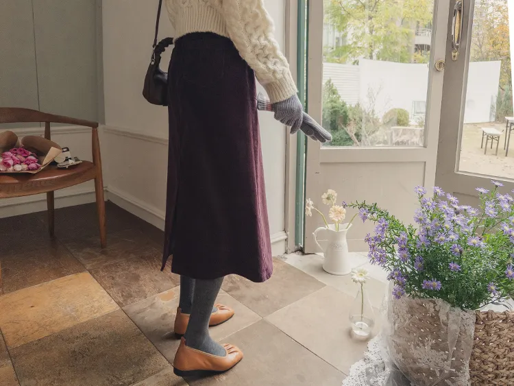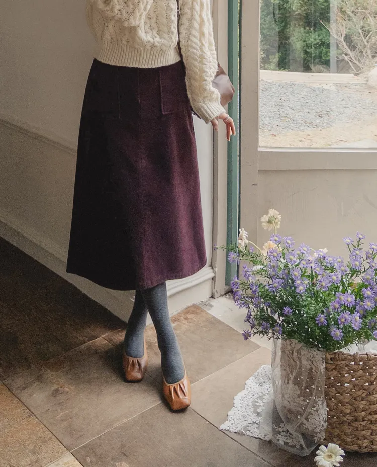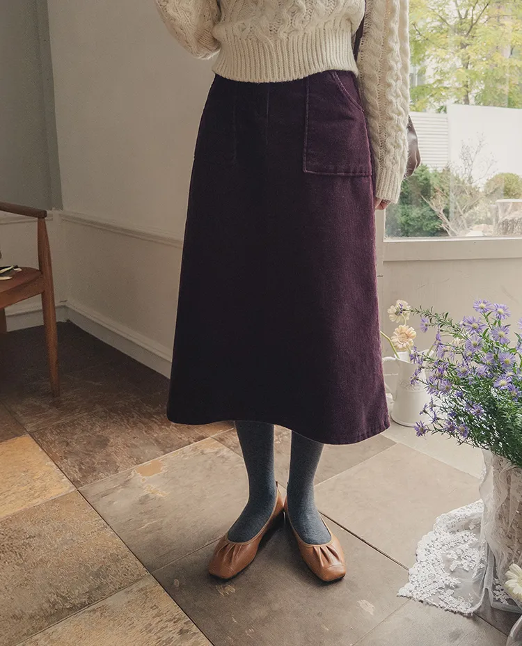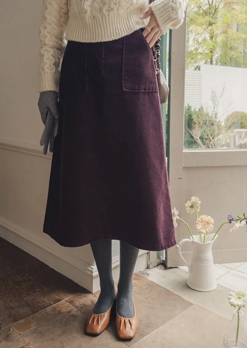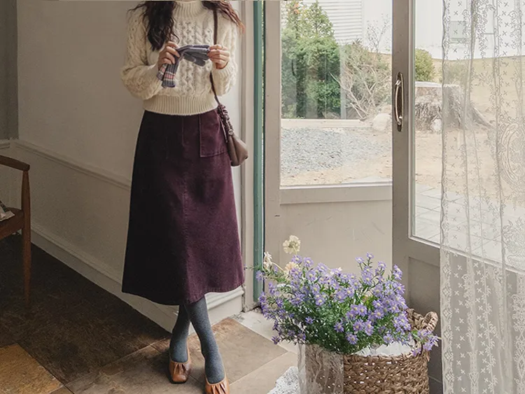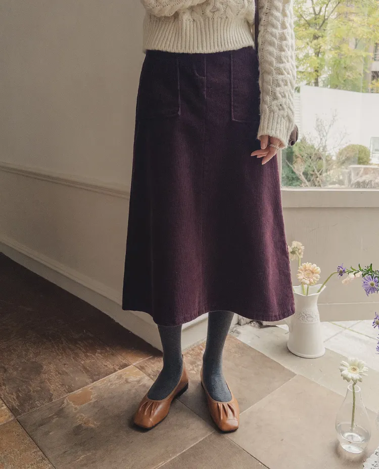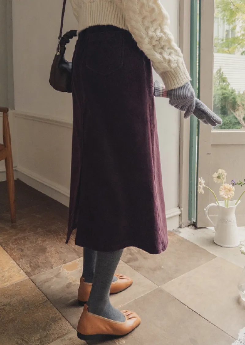 迷人A字剪裁後開衩方形口袋燈芯絨中長裙