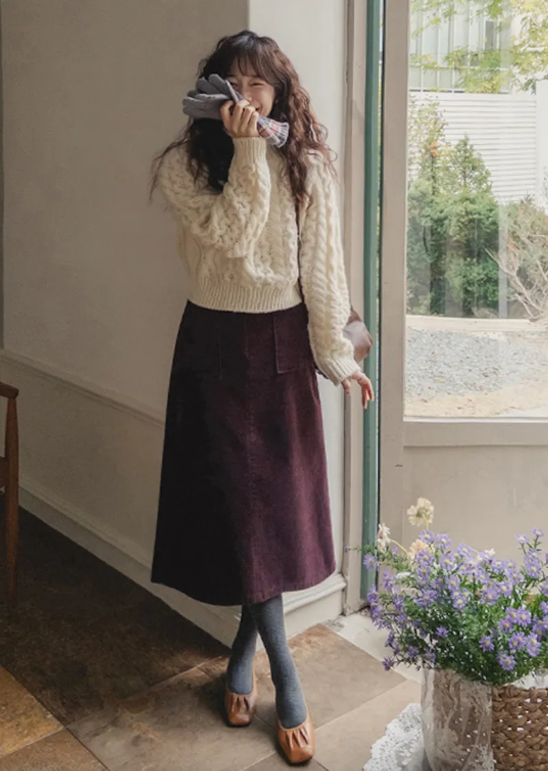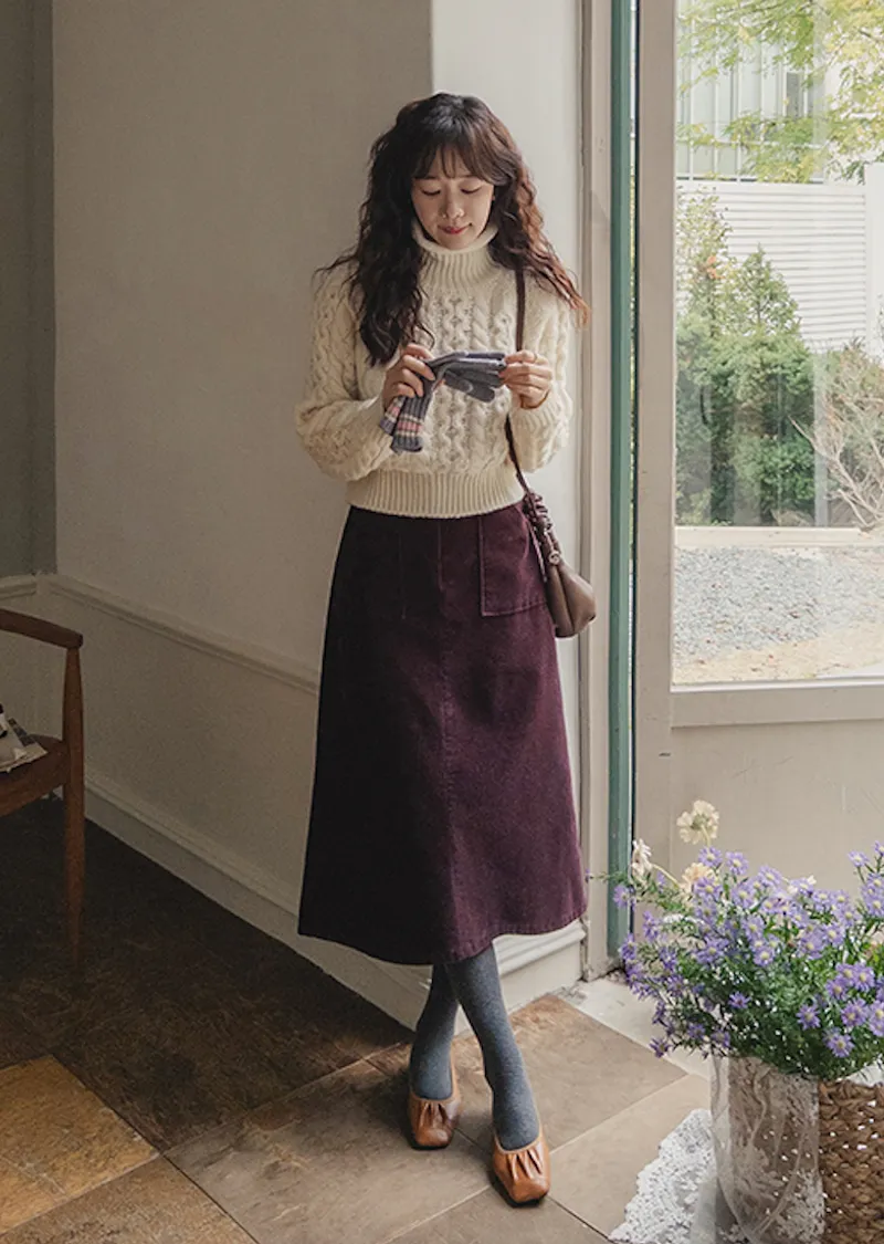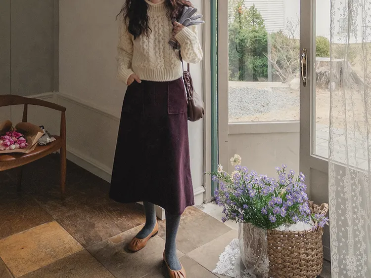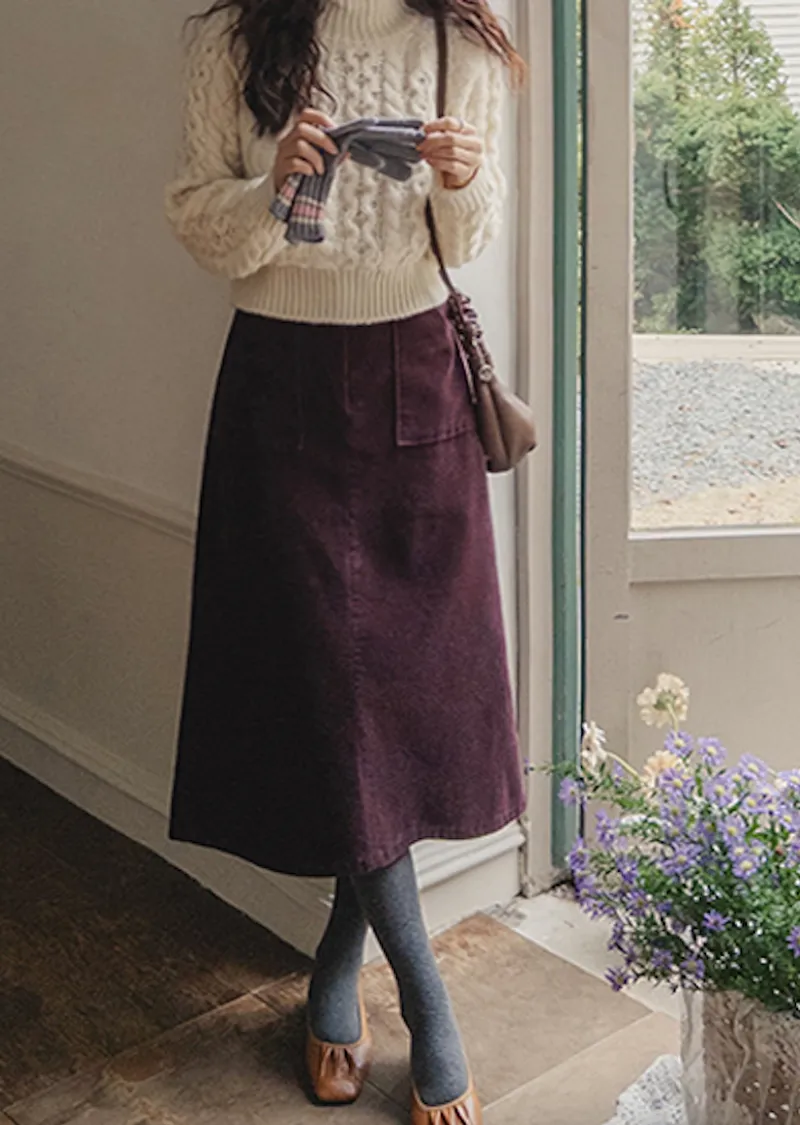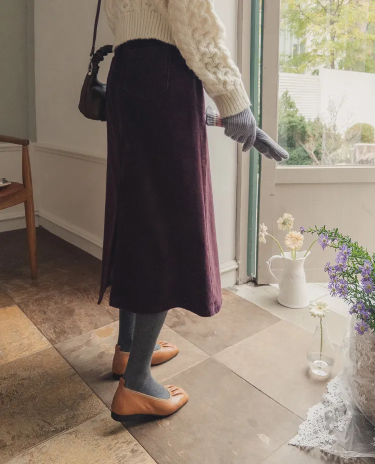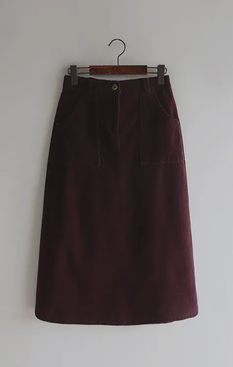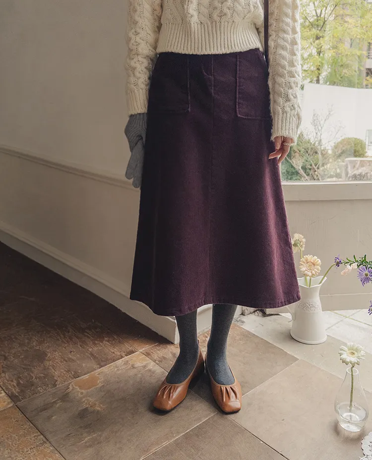 迷人A字剪裁後開衩方形口袋燈芯絨中長裙