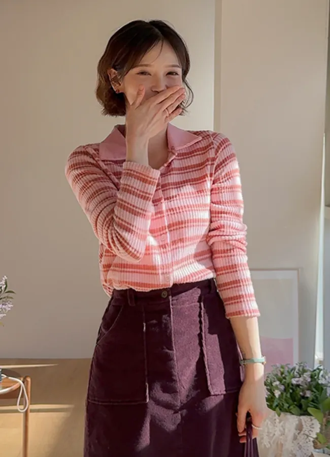 清新活潑翻領柔軟羅紋條紋針織開衫