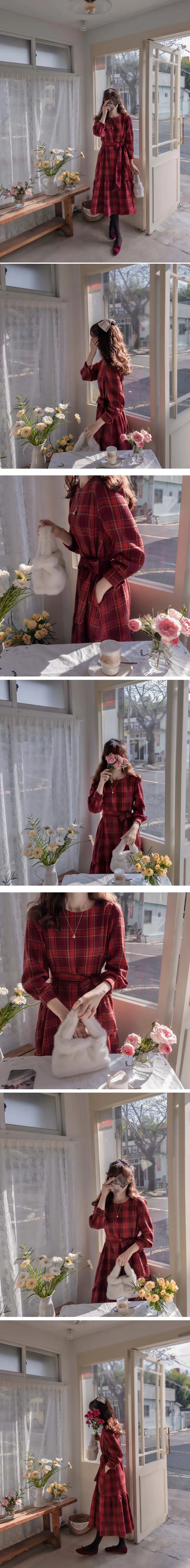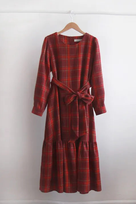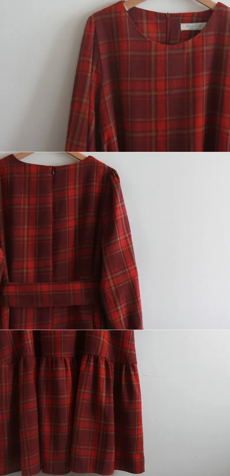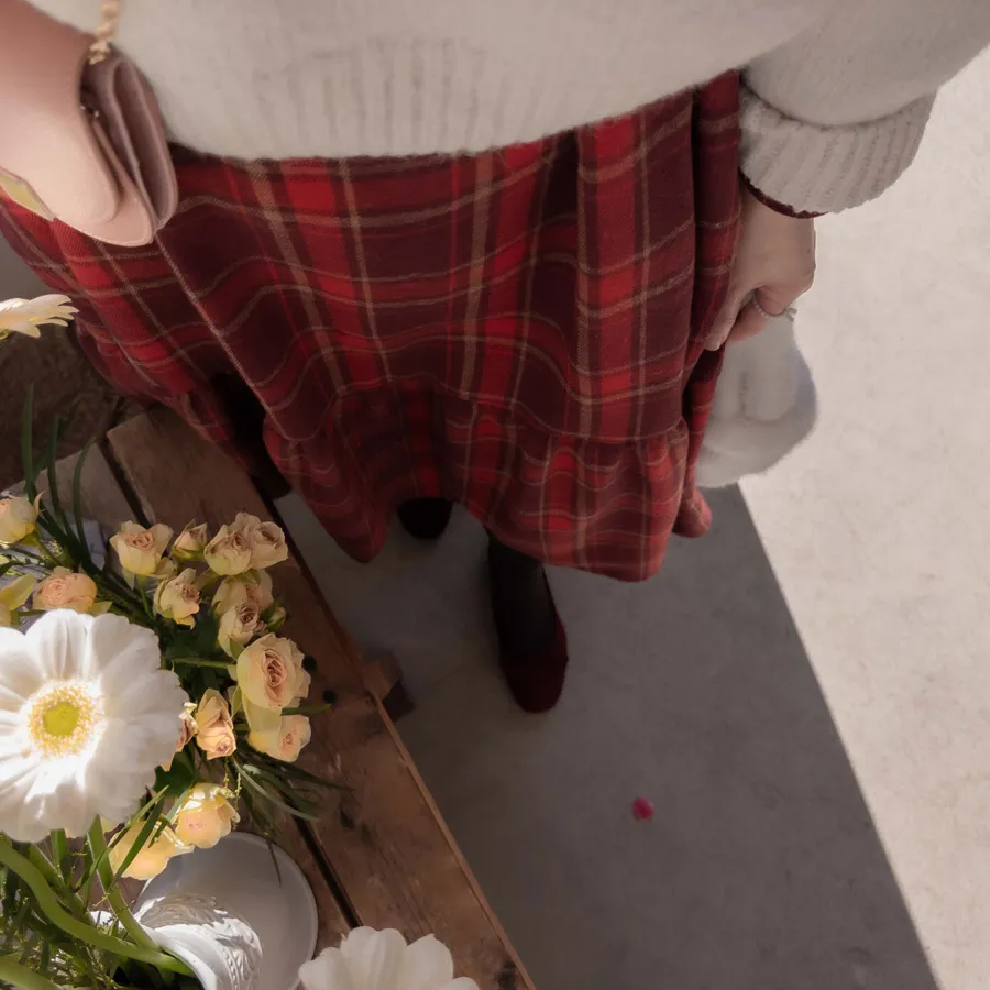 [後拉鍊結構] [腰帶組:可拆卸-邊緣貼合] [裙子下部剪裁線條,設計可愛] [採用柔軟的拉絨面料製成,帶有格紋圖案,打造出一種可愛的感覺。] [一種時尚穿搭,可以增強風格,同時又有優雅感]