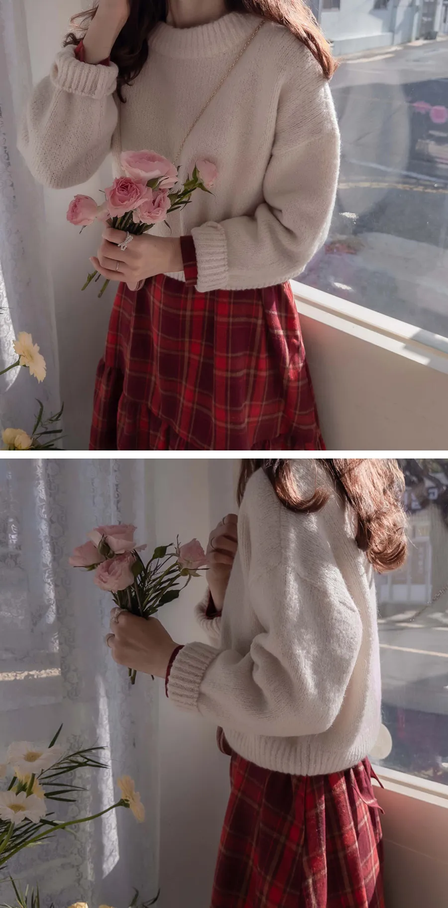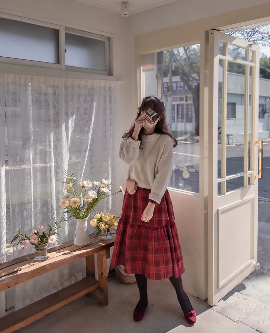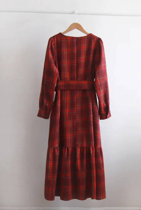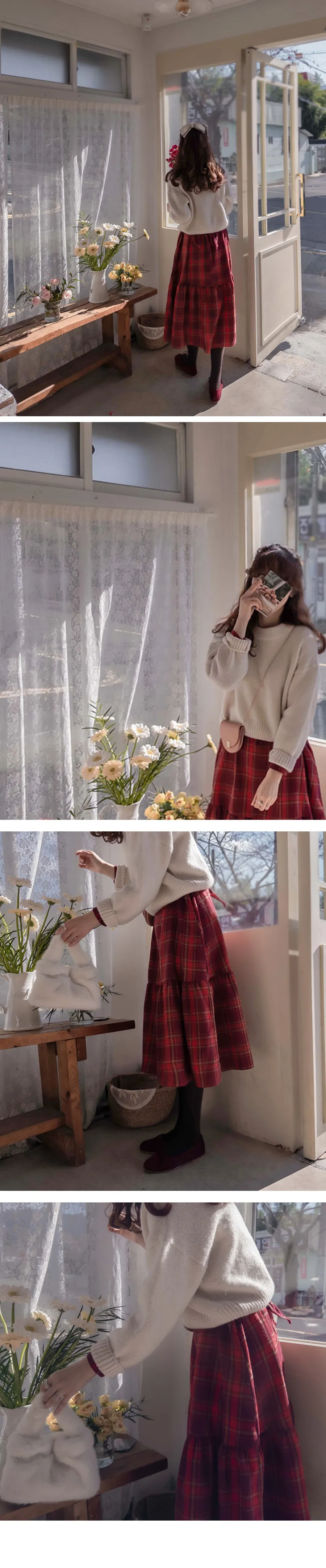 [後拉鍊結構] [腰帶組:可拆卸-邊緣貼合] [裙子下部剪裁線條,設計可愛] [採用柔軟的拉絨面料製成,帶有格紋圖案,打造出一種可愛的感覺。] [一種時尚穿搭,可以增強風格,同時又有優雅感]