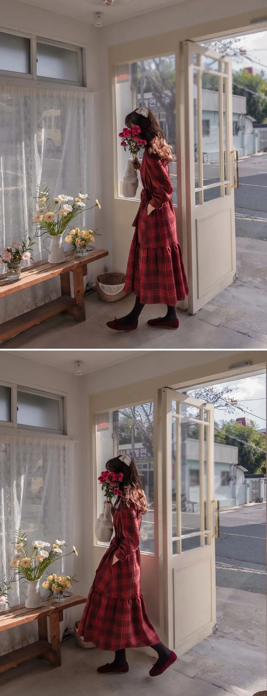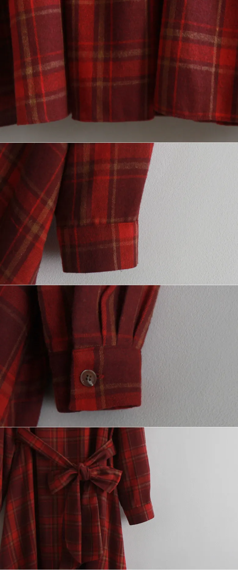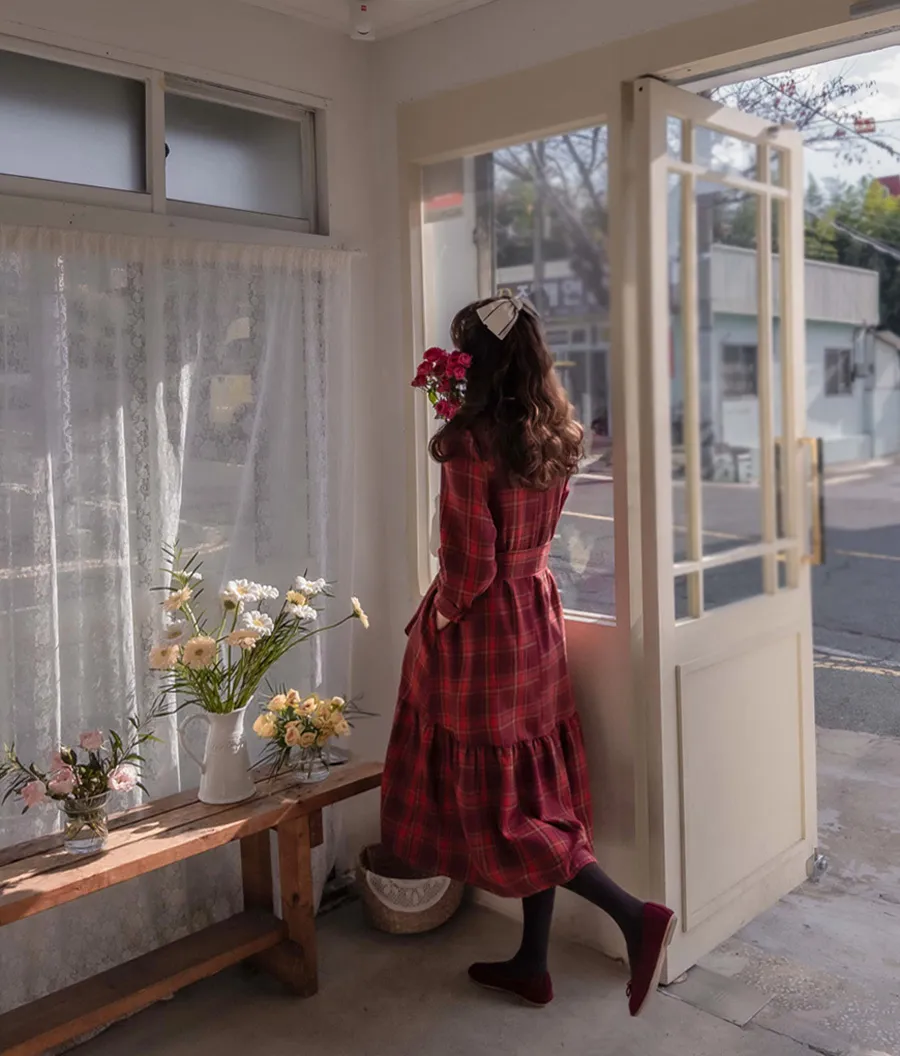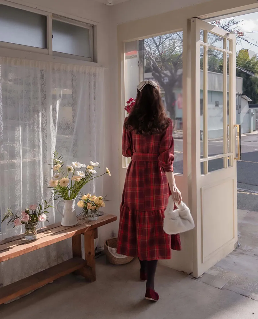 可愛裙子剪裁設計附綁帶絨質格紋連身裙