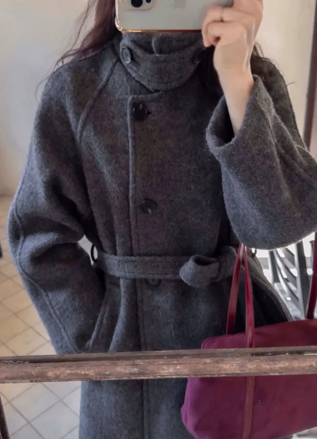 優雅剪裁領扣設計有腰帶質感半身長款羊毛外套