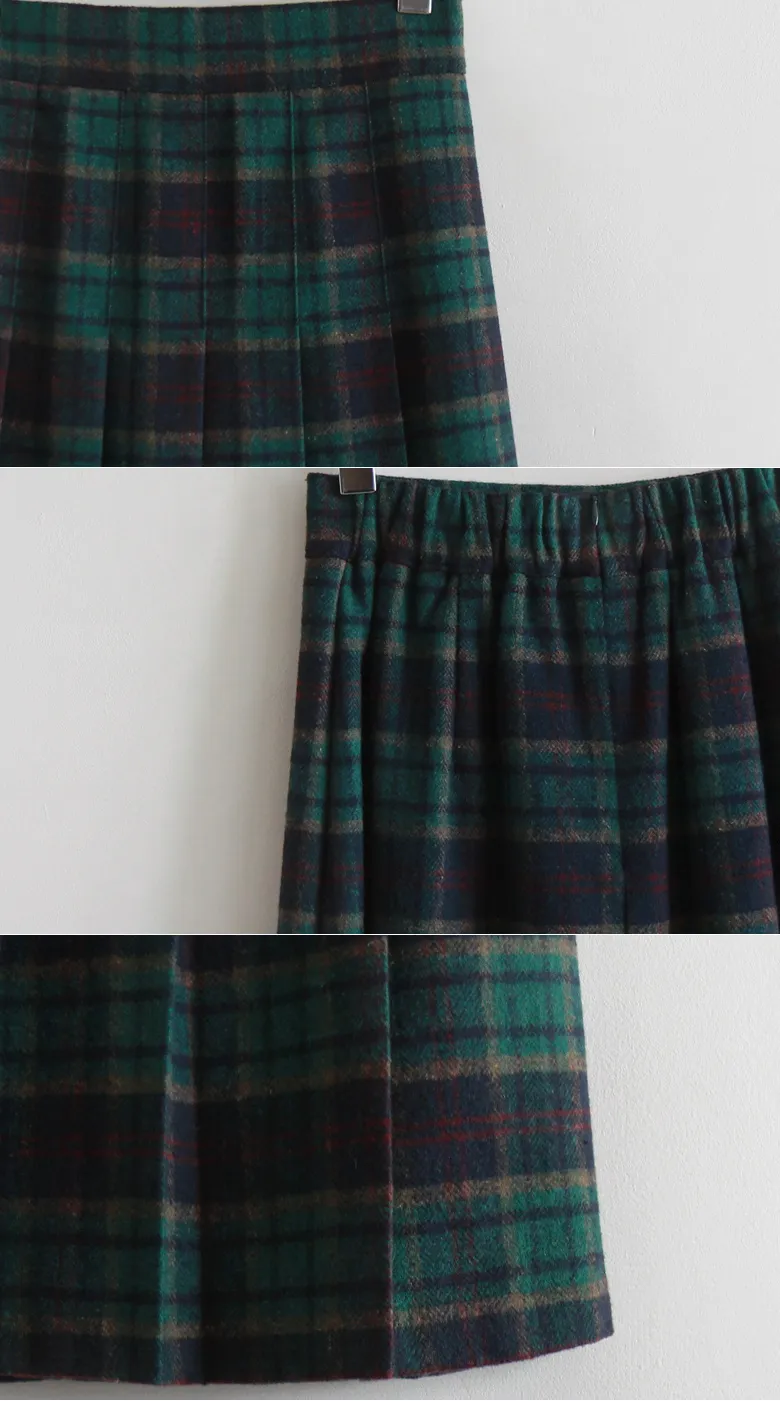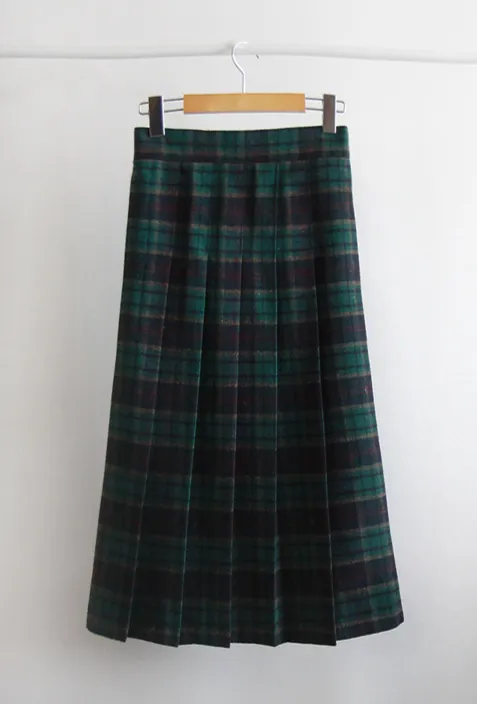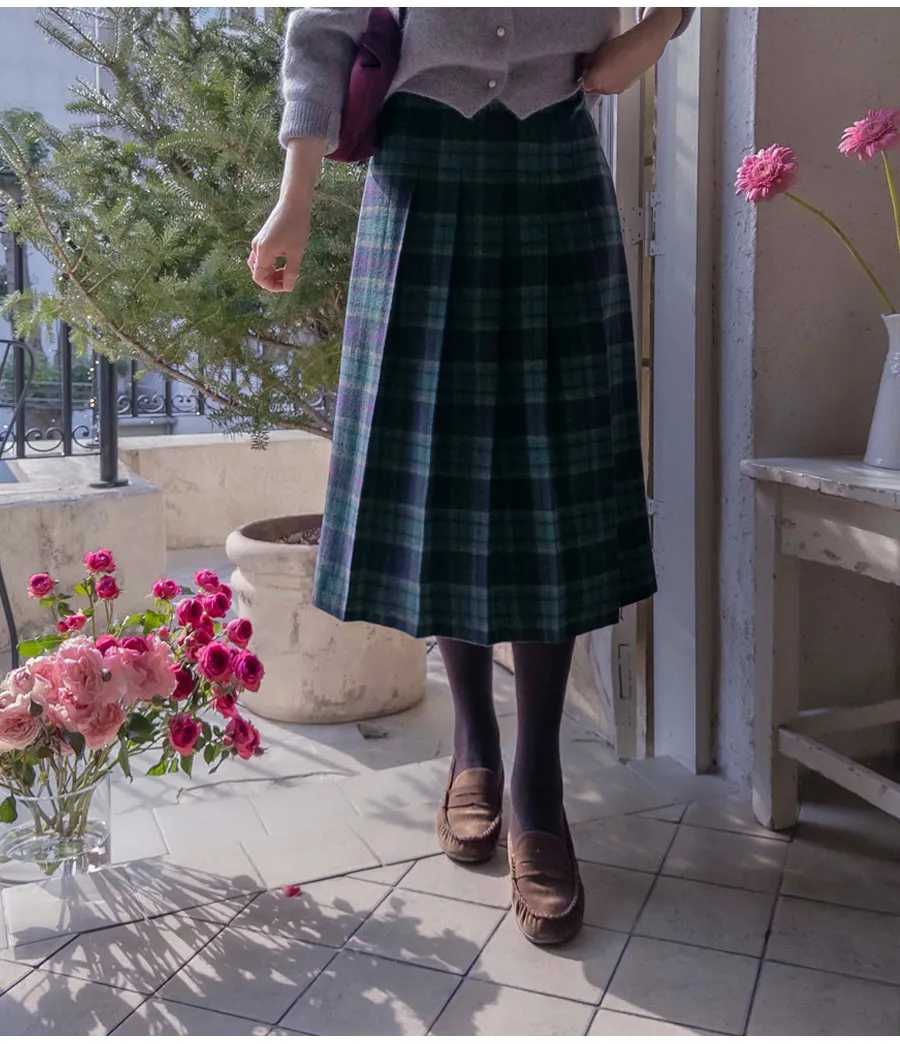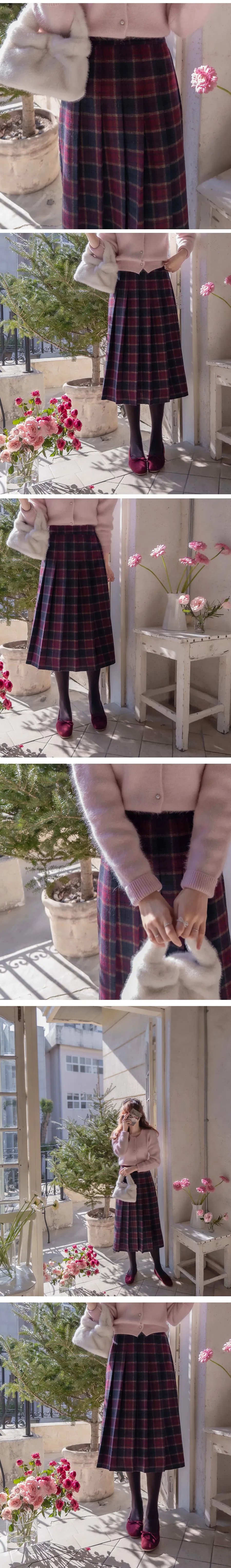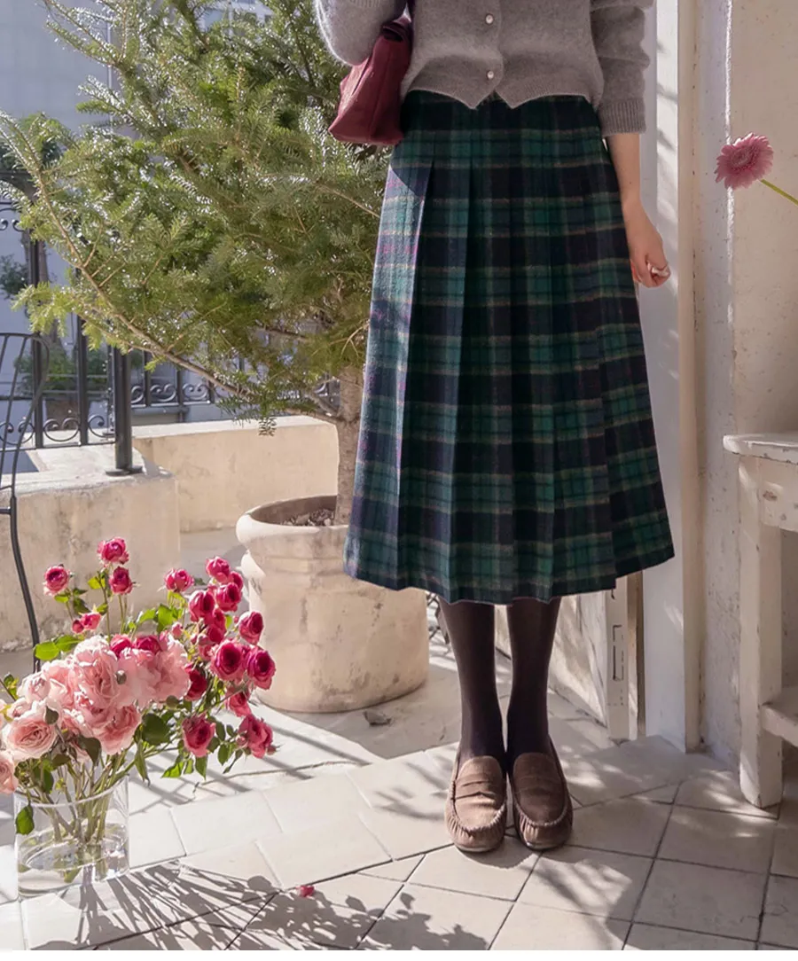 漂亮線條秋冬深色柔軟絨質百褶格紋中長裙