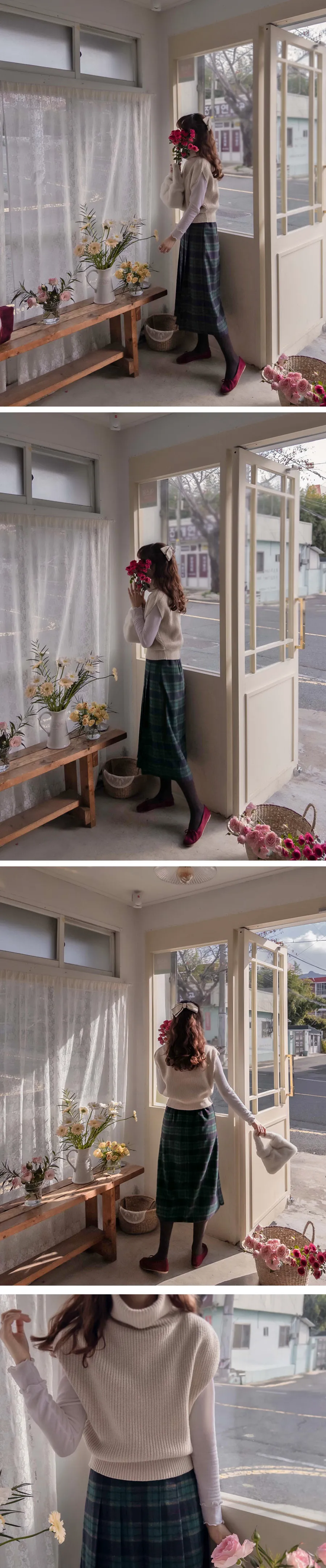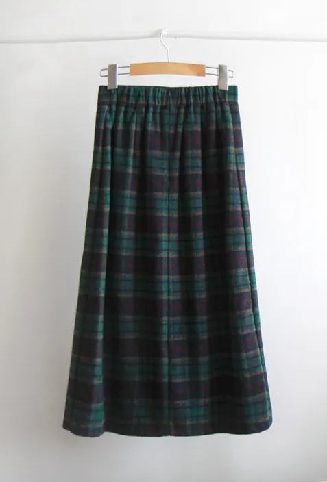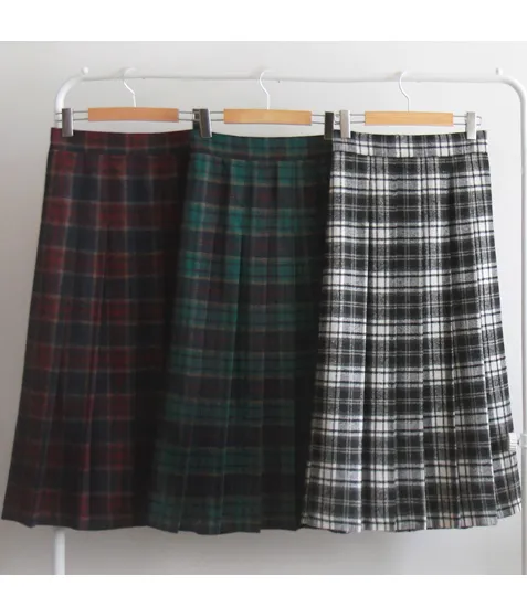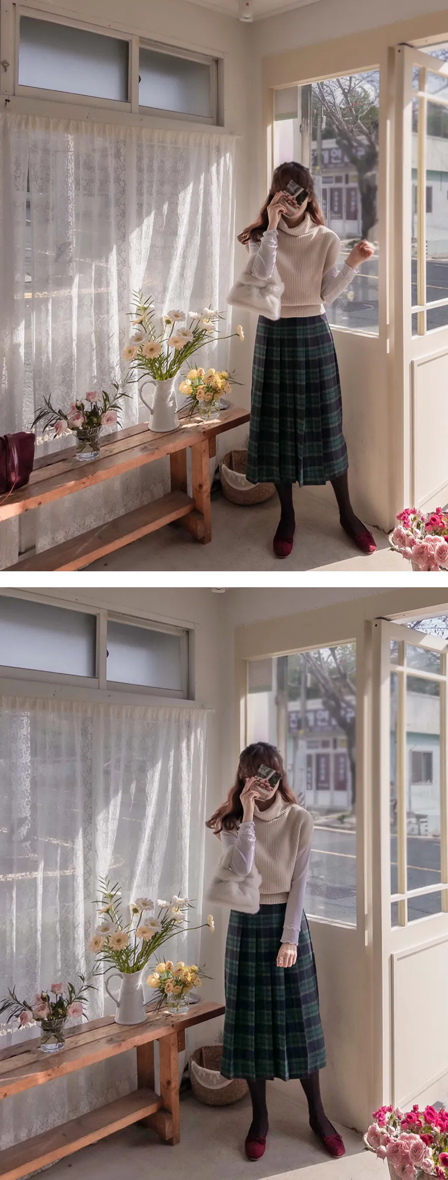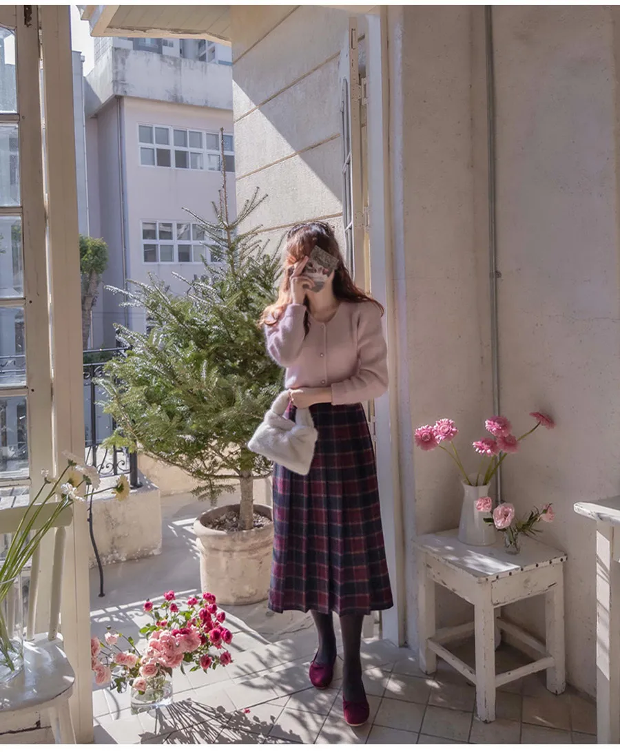 漂亮線條秋冬深色柔軟絨質百褶格紋中長裙