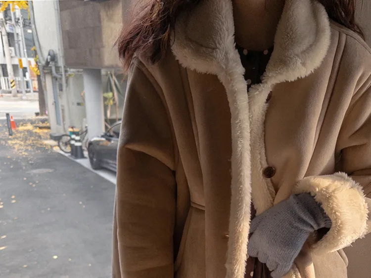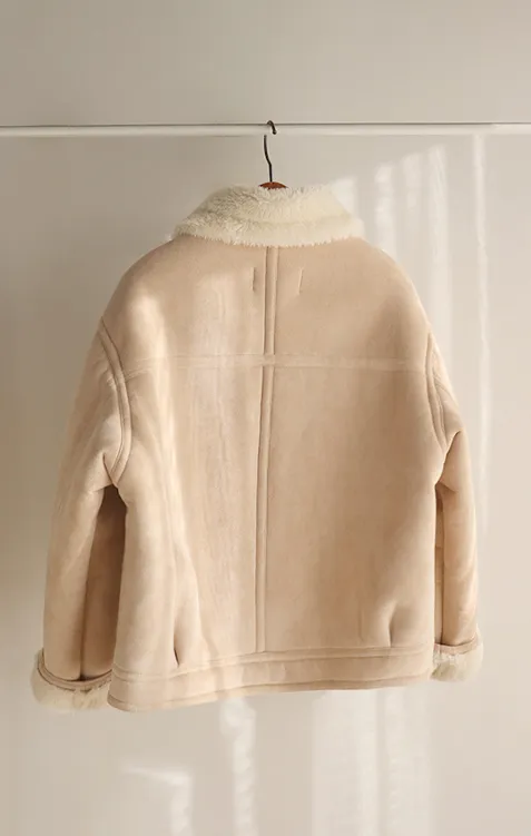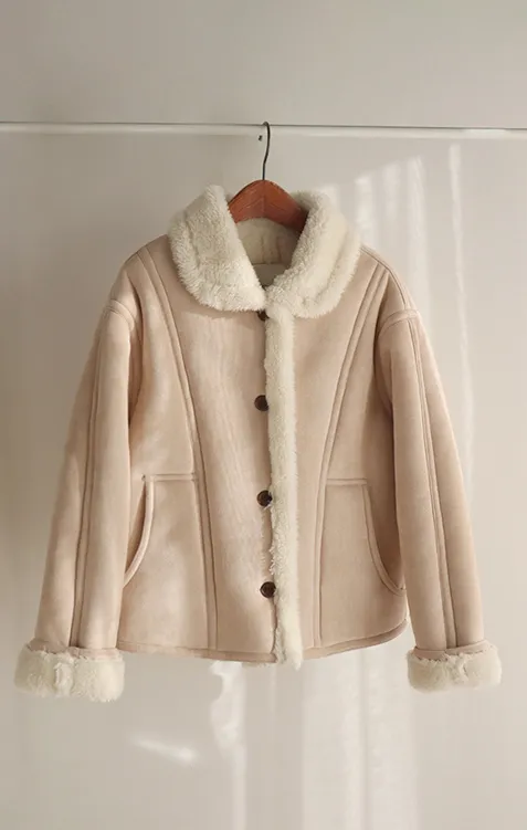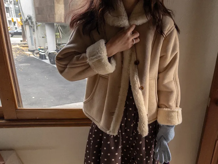柔和米色柔軟厚實溫暖麂皮外套 棕色現貨