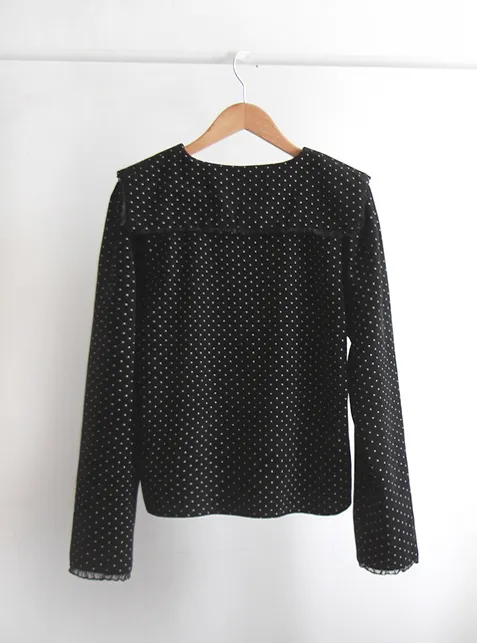 [可愛的圓點燈芯絨上衣][柔軟的燈芯絨面料][領口飾有剪裁裝飾][可愛的領子][柔軟的羅紋面料舒適貼合][袖子末端也有剪裁裝飾很漂亮][作為柔軟燈芯絨排扣上衣]