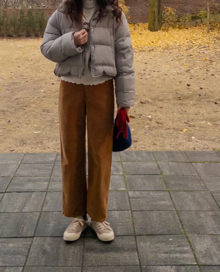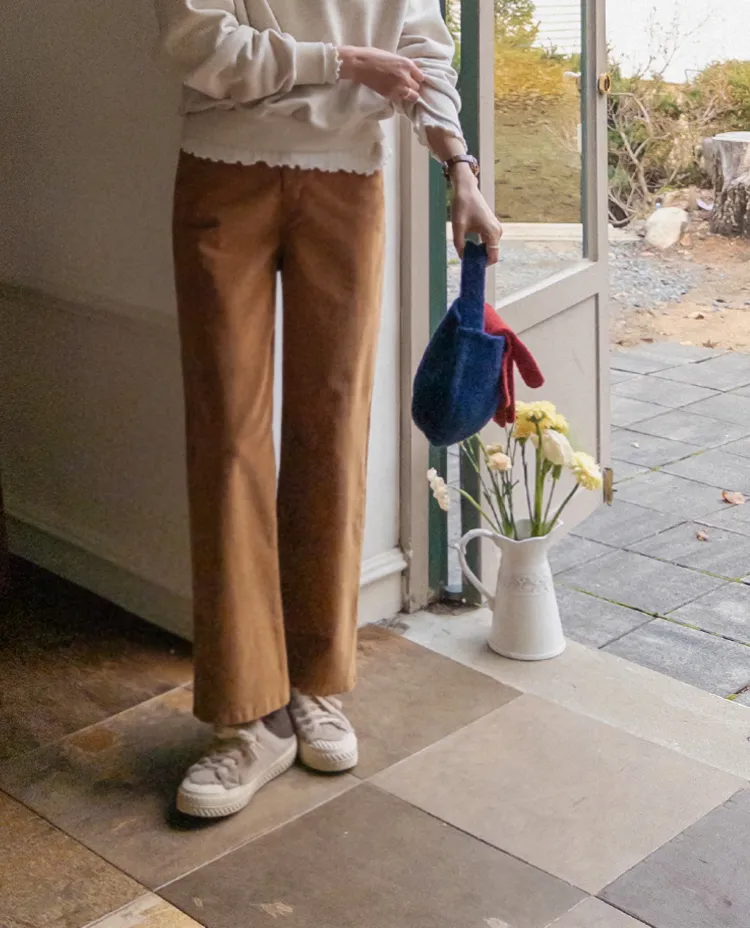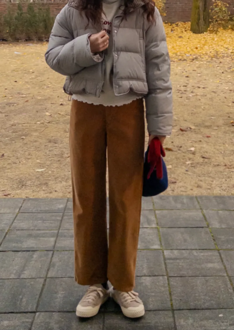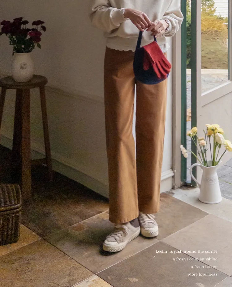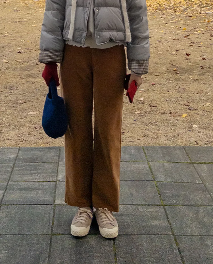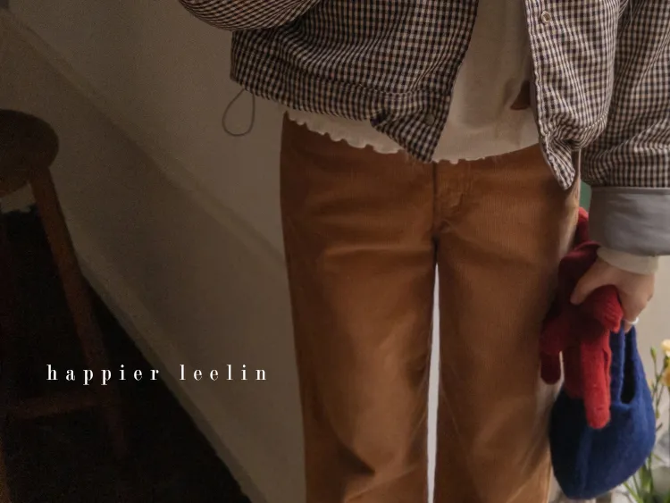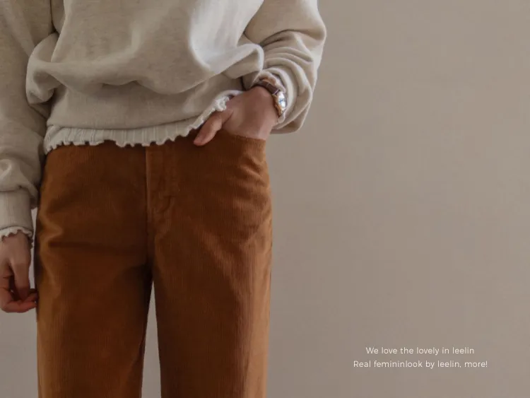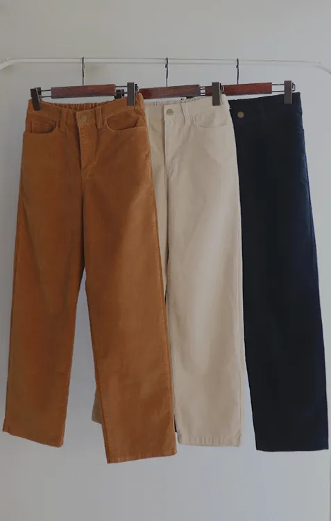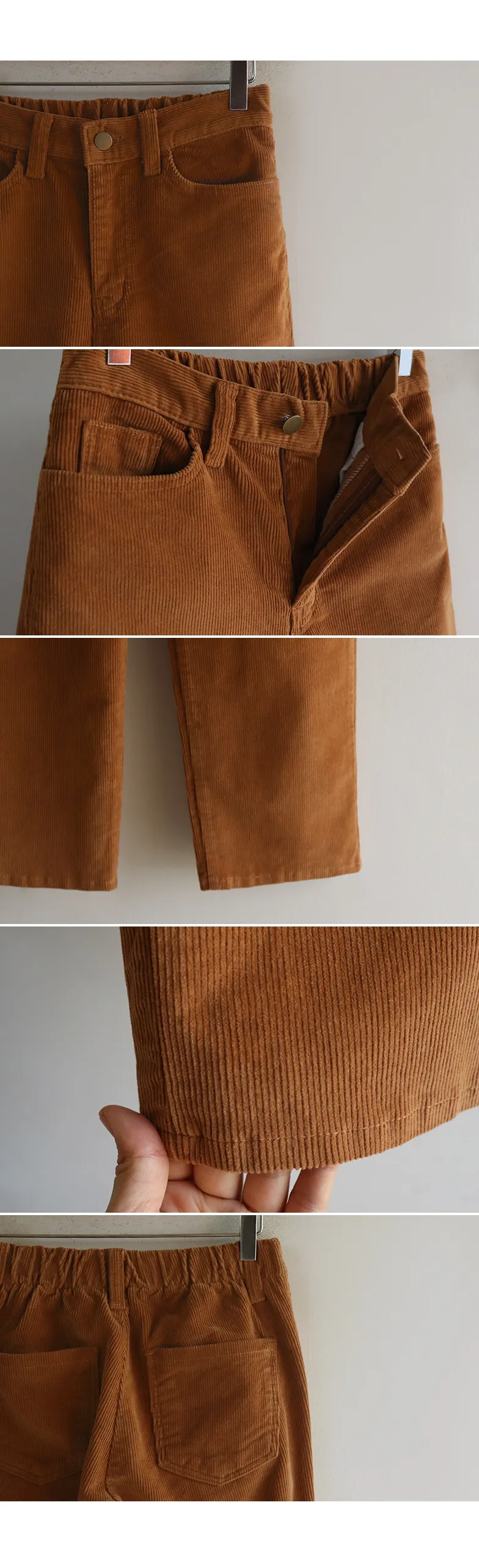 [燈芯絨布料,整個冬天穿起來既漂亮又溫暖] [基本設計很漂亮,顏色點綴] [3% 氨綸和後腰帶,全天舒適 ~] [直長,遮蓋腿部線條貼合]