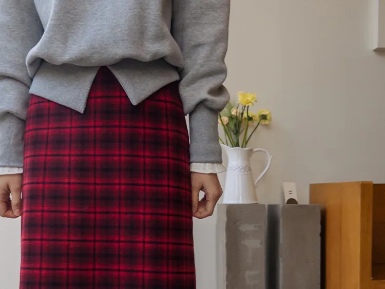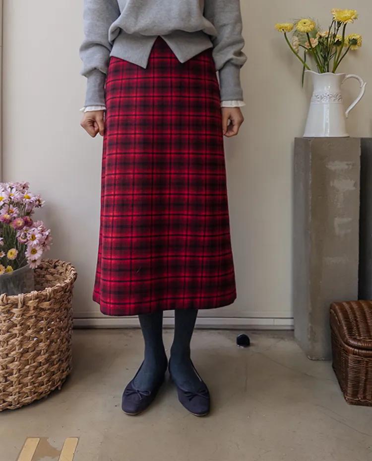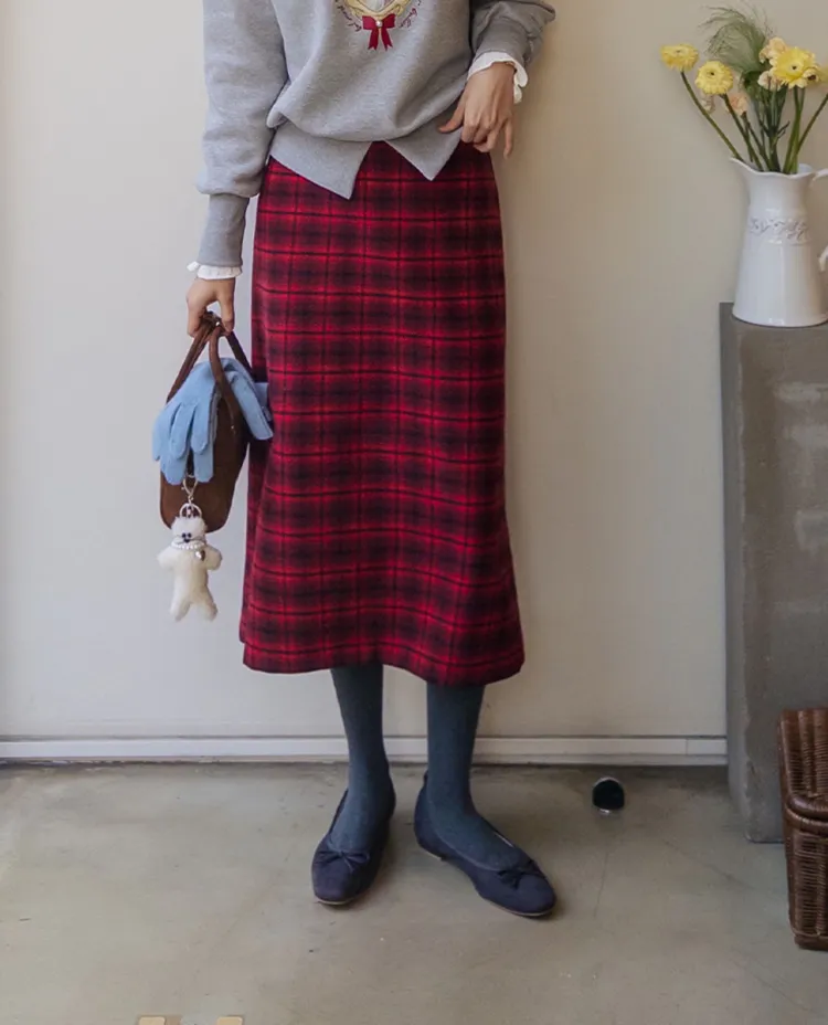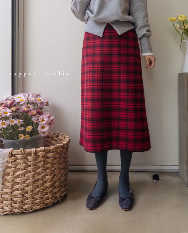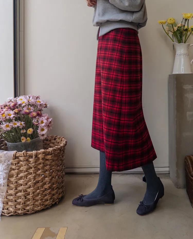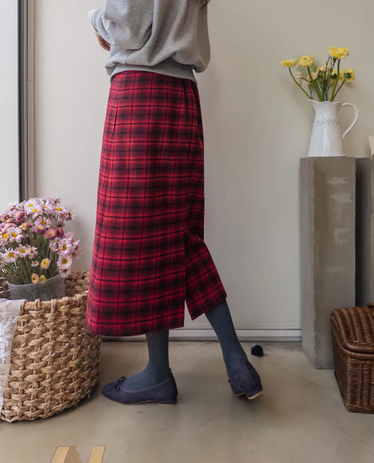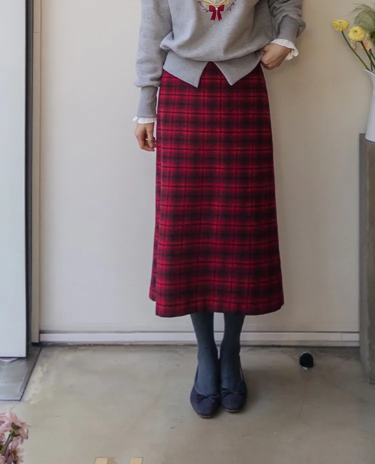 【格紋最適合年終造型♥】【厚實的羊毛材質非常適合冬天穿~】【下擺開衩細節和後腰綁帶增加舒適度! 】【半A字+長款完美下半身線條