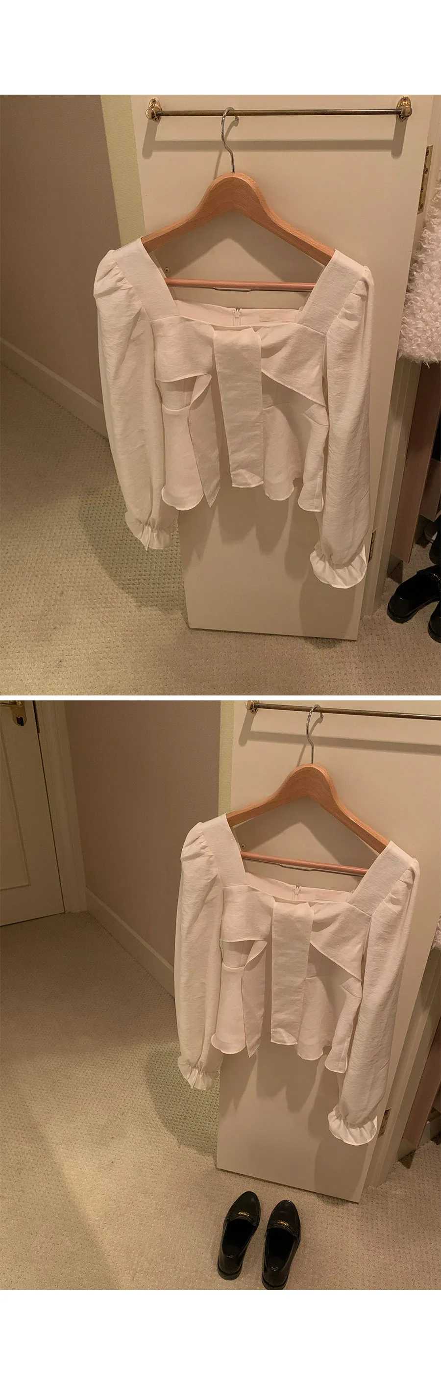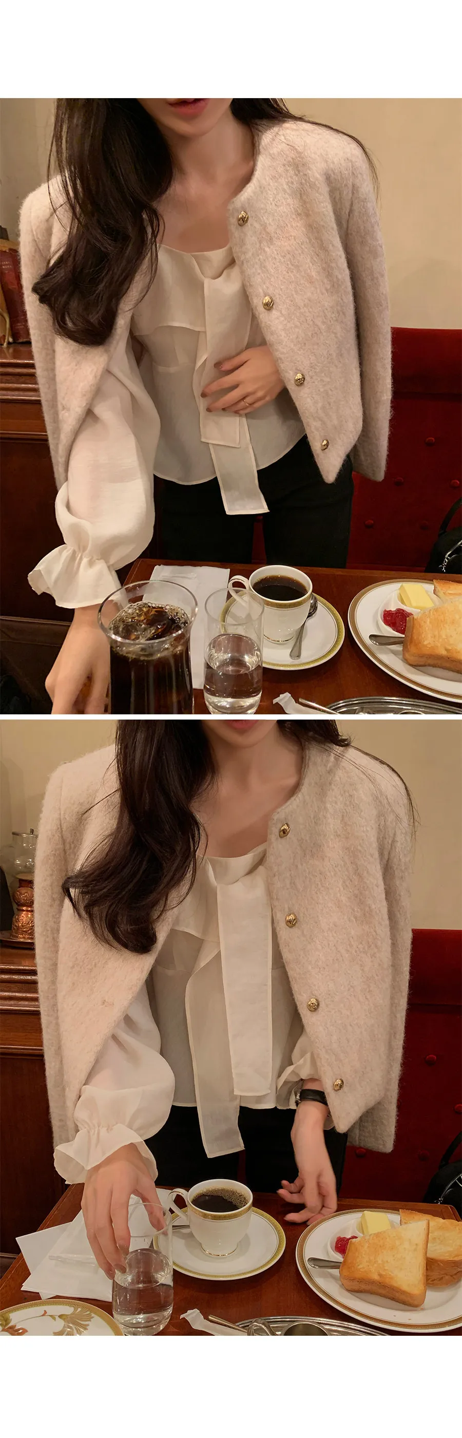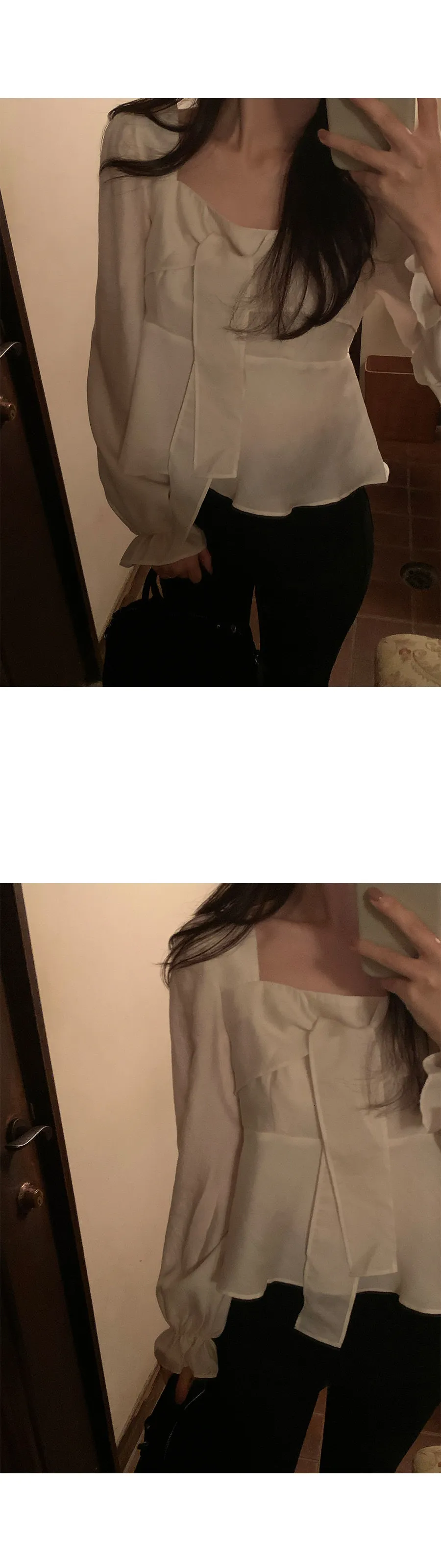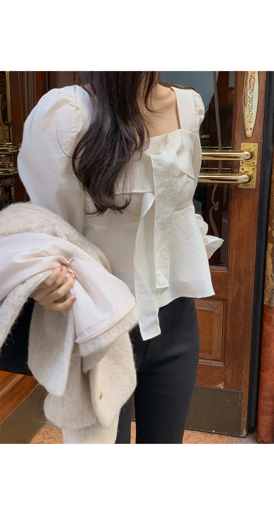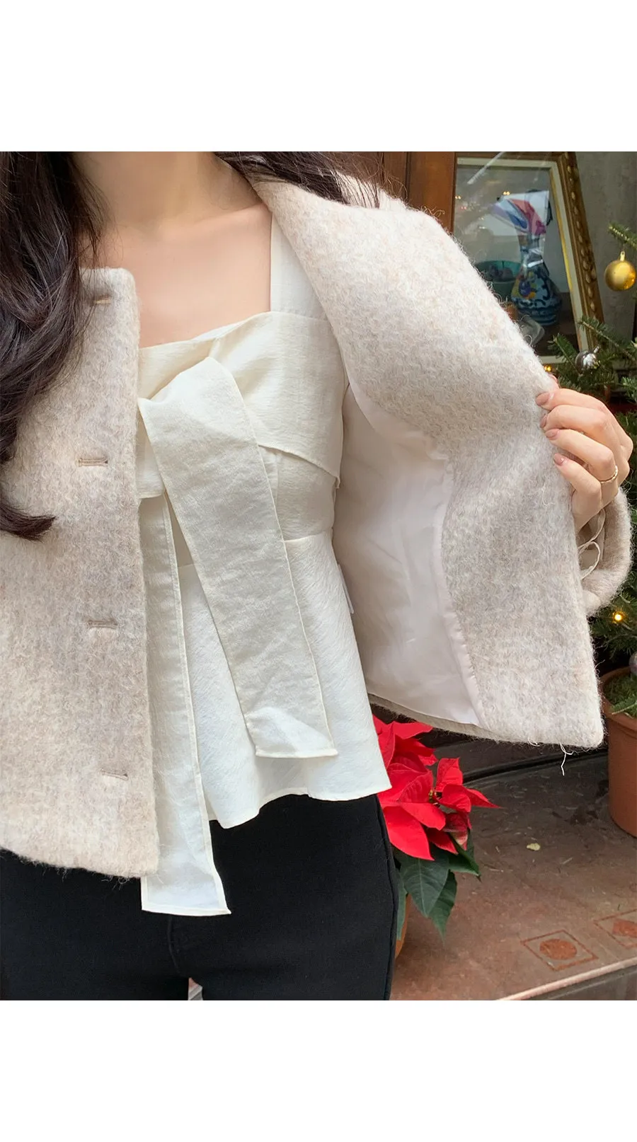 奢華氛圍微光側領綁帶肩線針褶排扣上衣