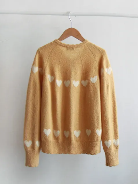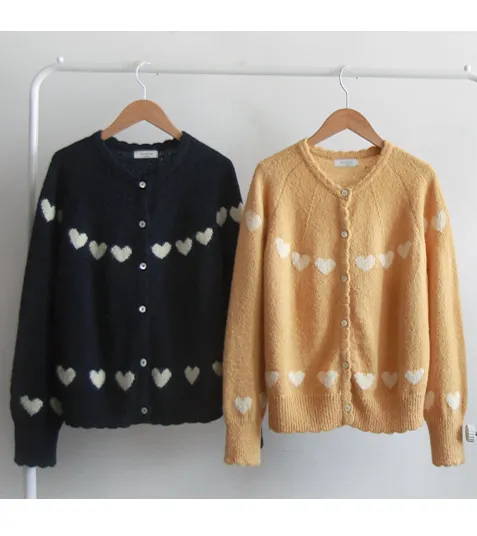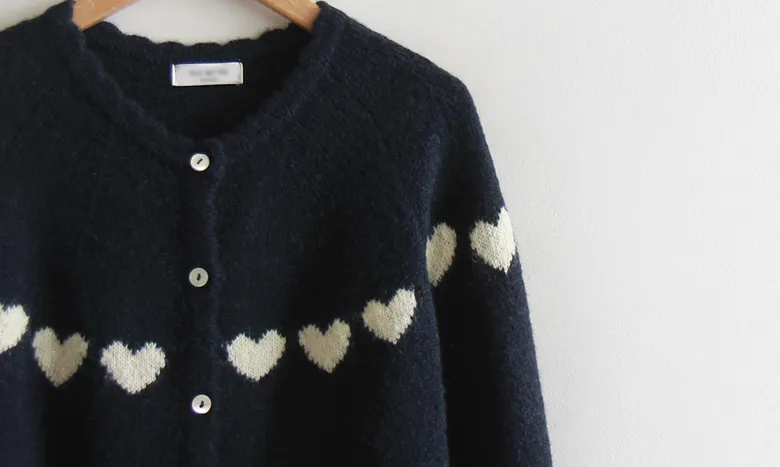 [含有5% 羊駝毛和21% 羊毛] [精緻的心形圖案設計] [領口採用波浪形狀,給人一種可愛的心情] [舒適合身,柔和的色彩] [推薦作為日常開衫,非常適合][推薦搭配的時尚開衫]