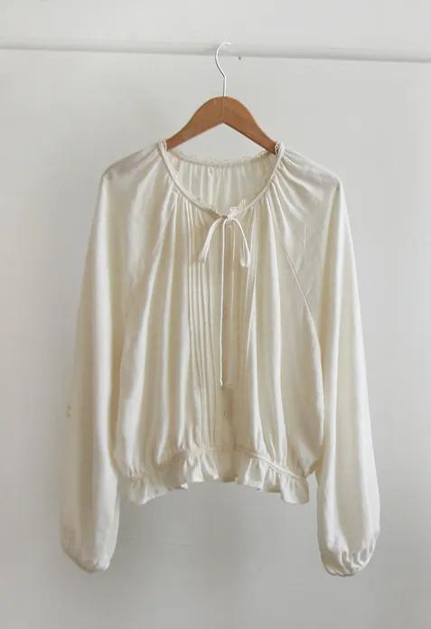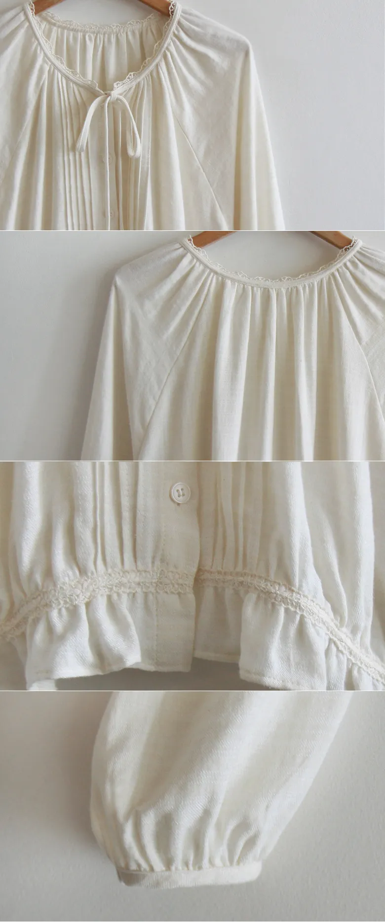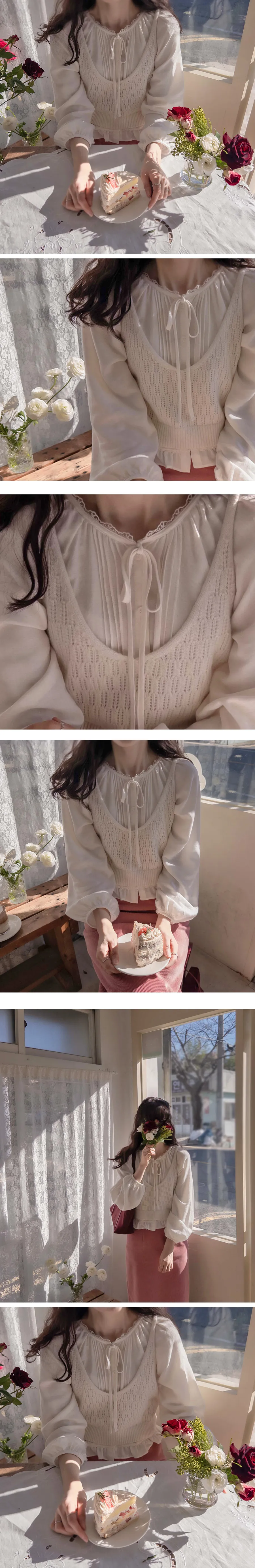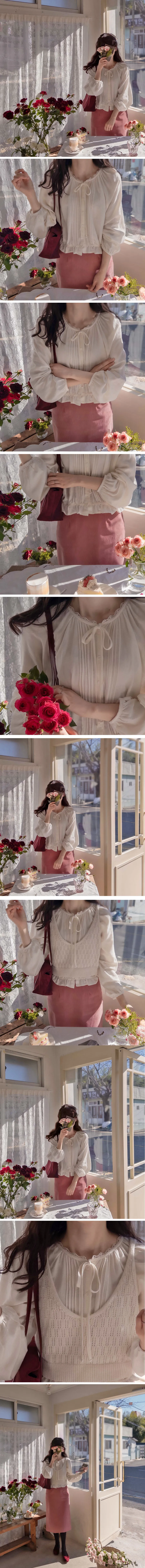 優雅蕾絲領口針摺綁帶下擺摺邊排扣上衣 現貨