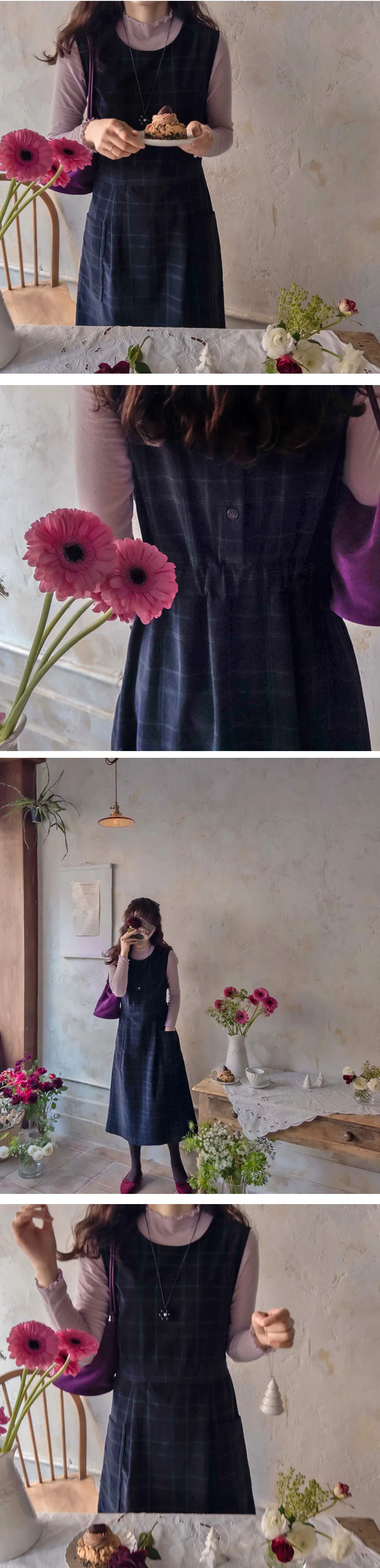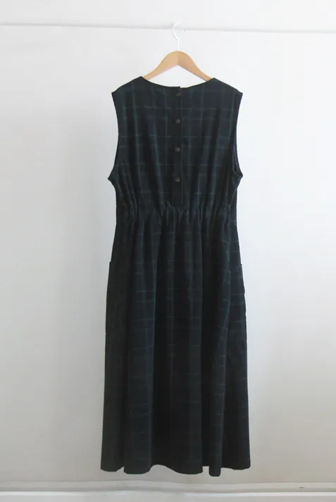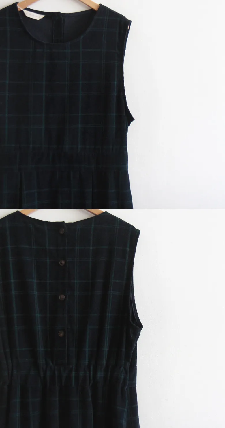 優雅腰線舒適修身後背排扣燈芯絨格紋連身裙