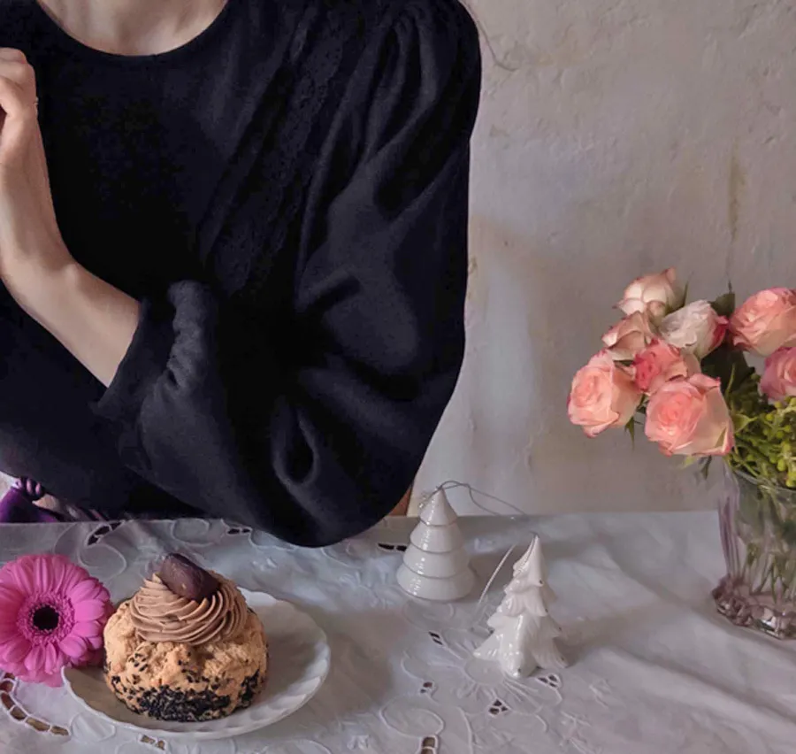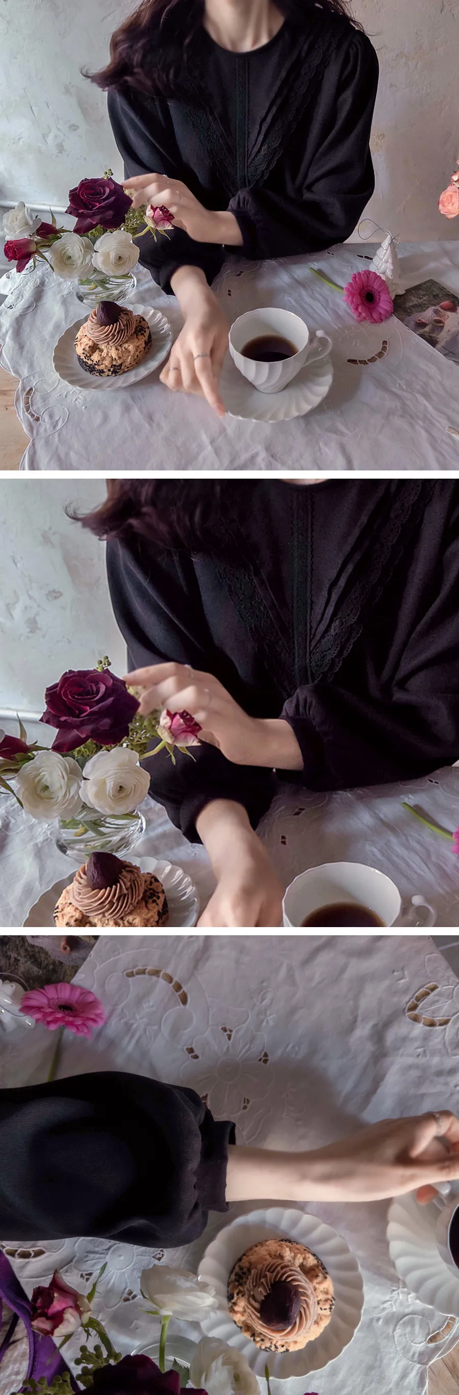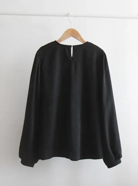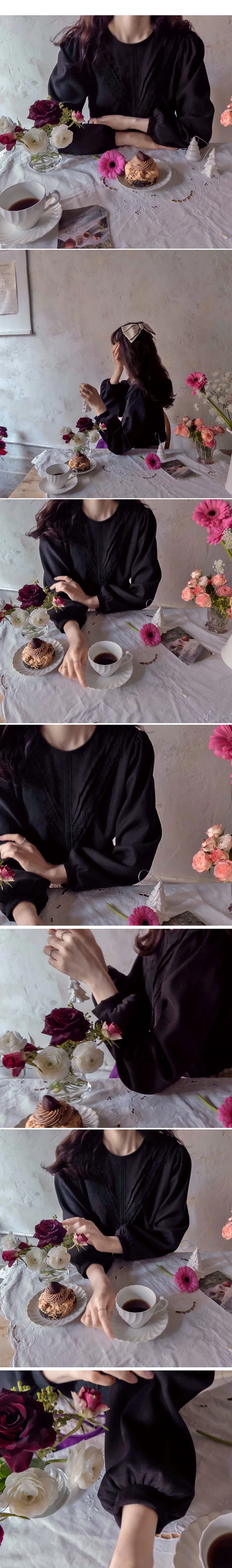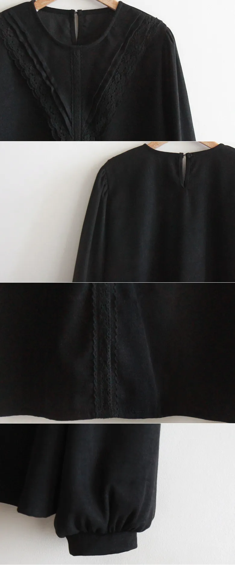 [拉絨面料][蕾絲展開的可愛設計][肩部有微妙的剪裁,搭配泡泡袖看起來很漂亮][蕾絲和V針褶皺營造出可愛的氣氛][推薦作為當季的穿搭上衣]