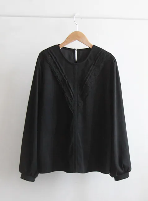 優雅V字線條蕾絲襯邊肩線剪裁絨質上衣