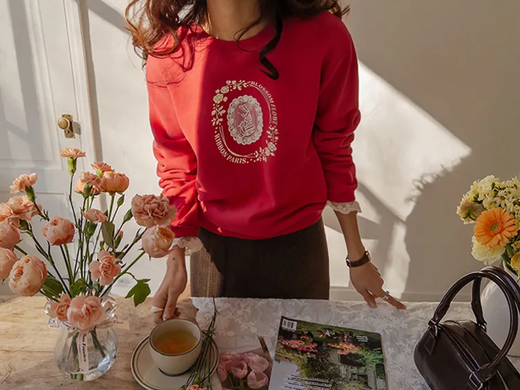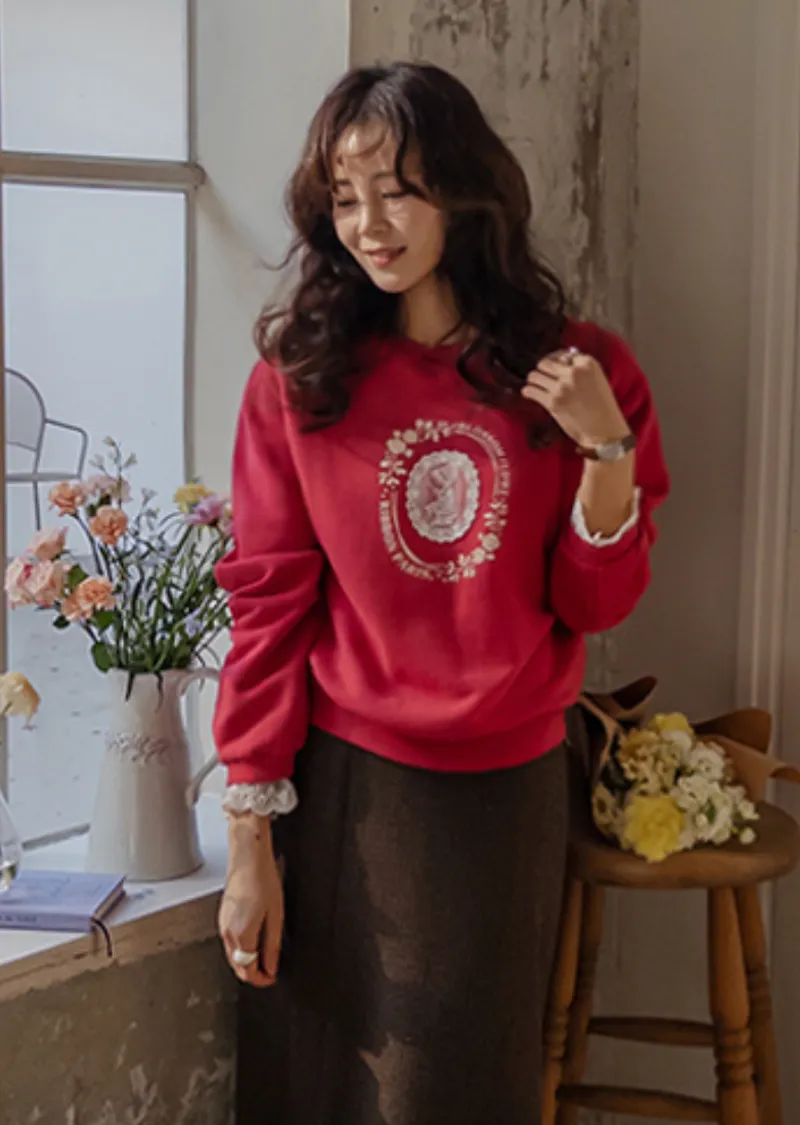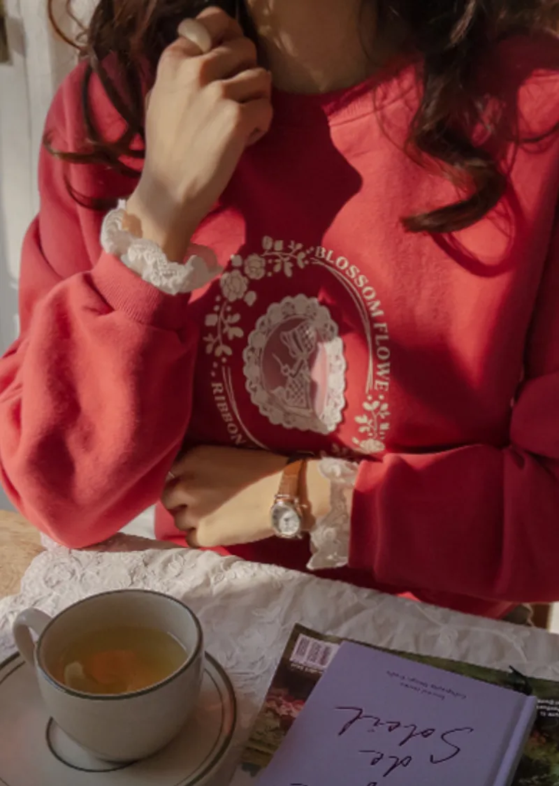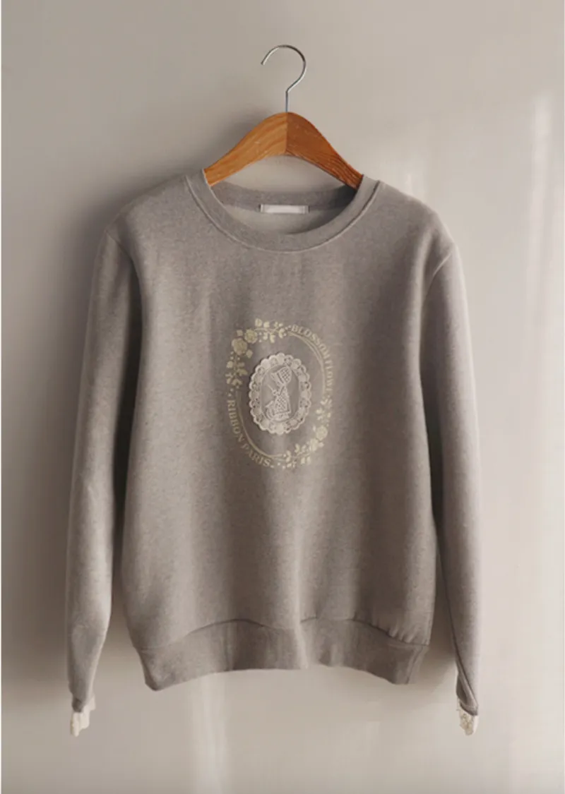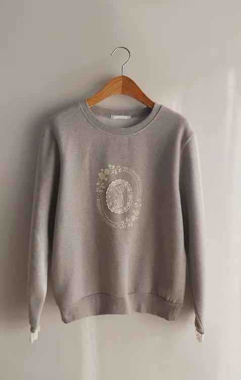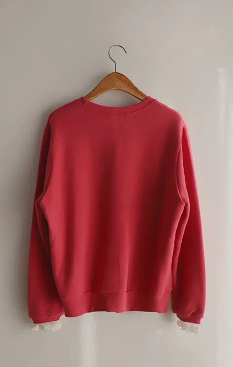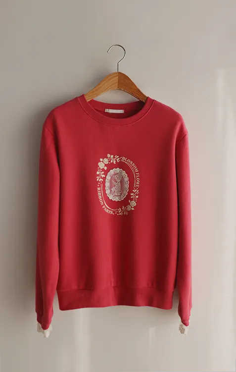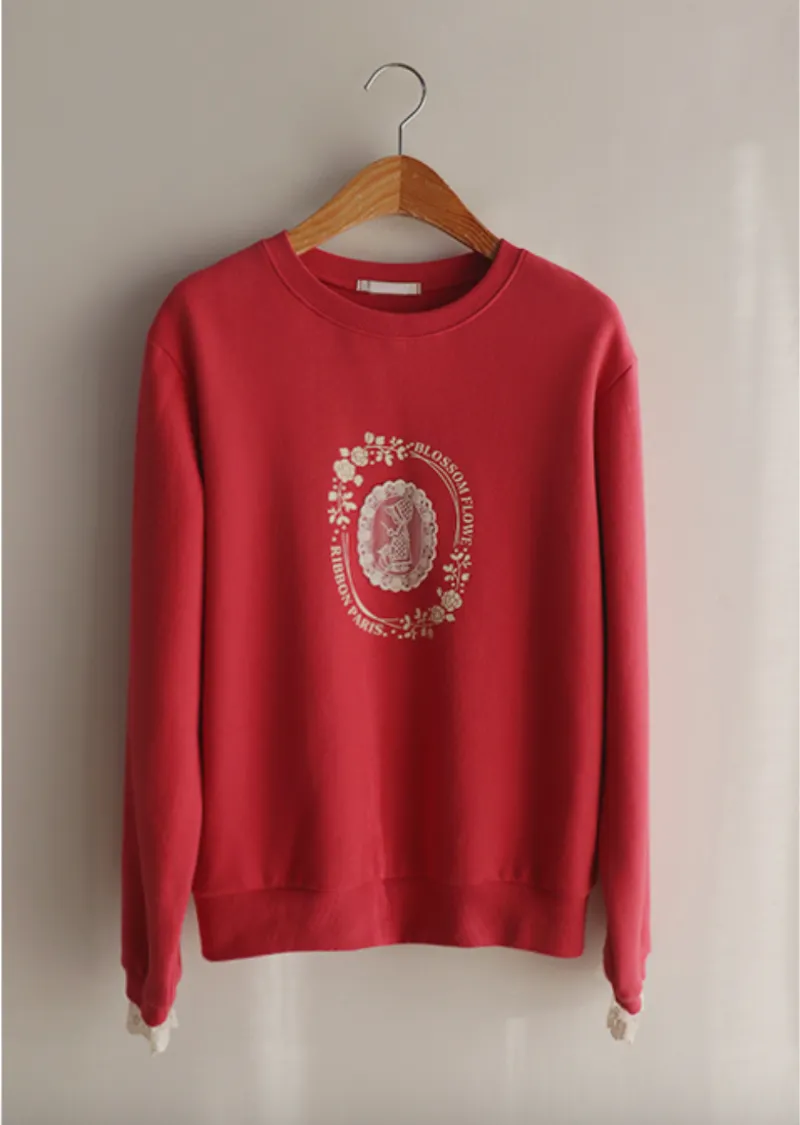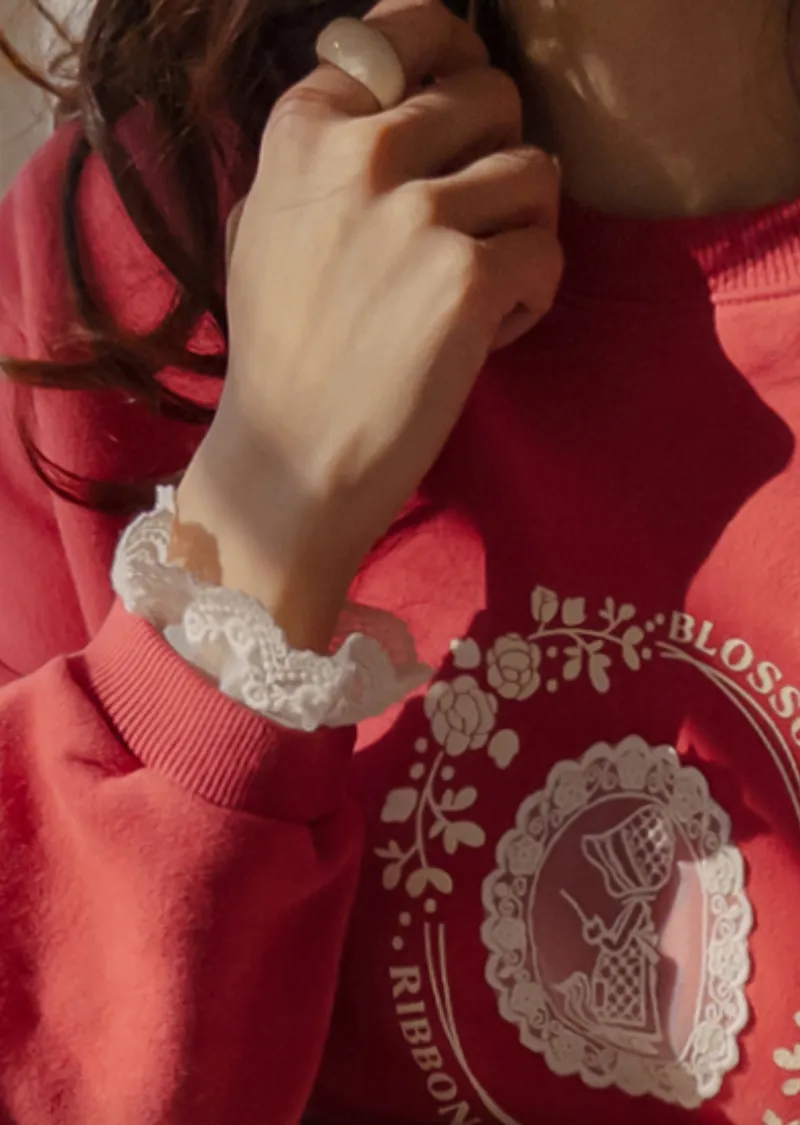 漂亮玫瑰蕾絲貼片點綴袖末蕾絲刷毛上衣
