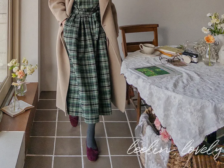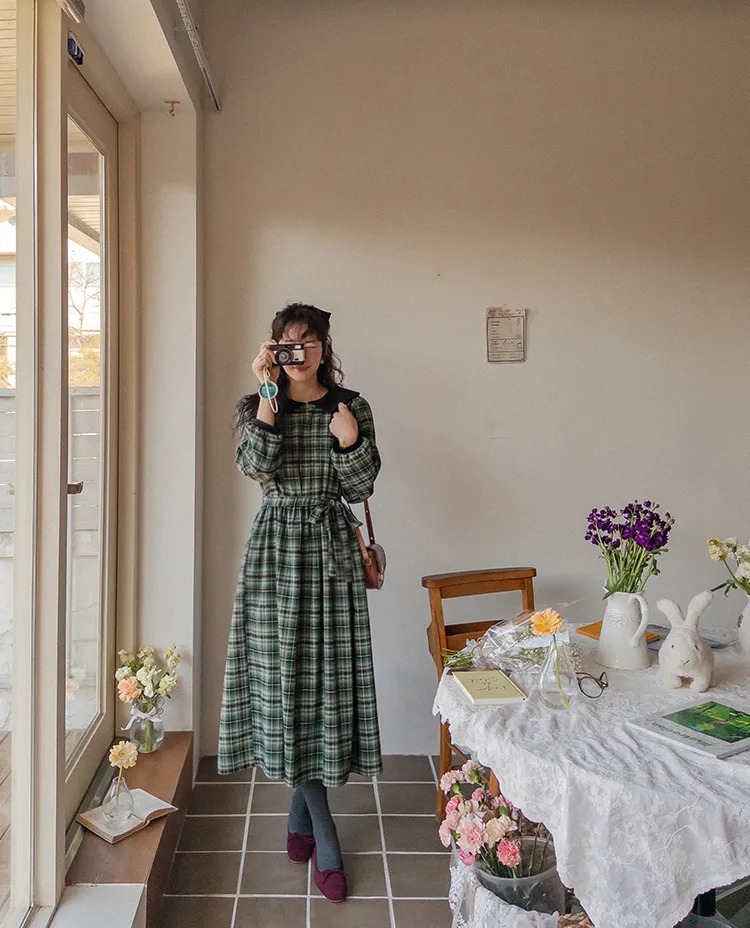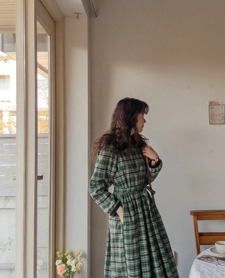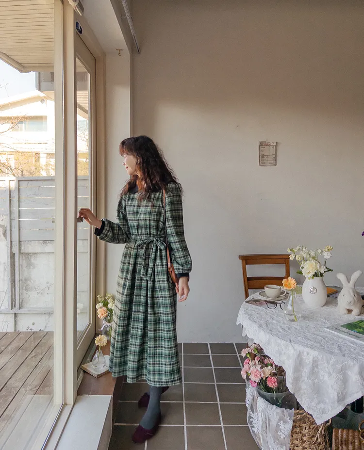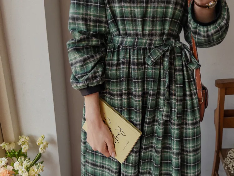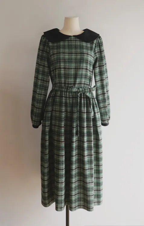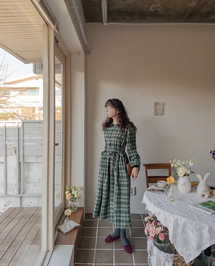 【領口&袖子天鵝絨顏色組合-!】【充滿格紋圖案的可愛又迷人~】【永遠不會過時,所以每年都適合穿著】【您可以根據自己的品味和體型用腰帶進行調整】