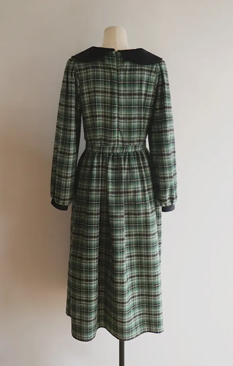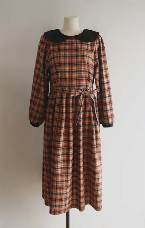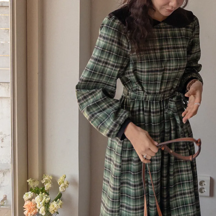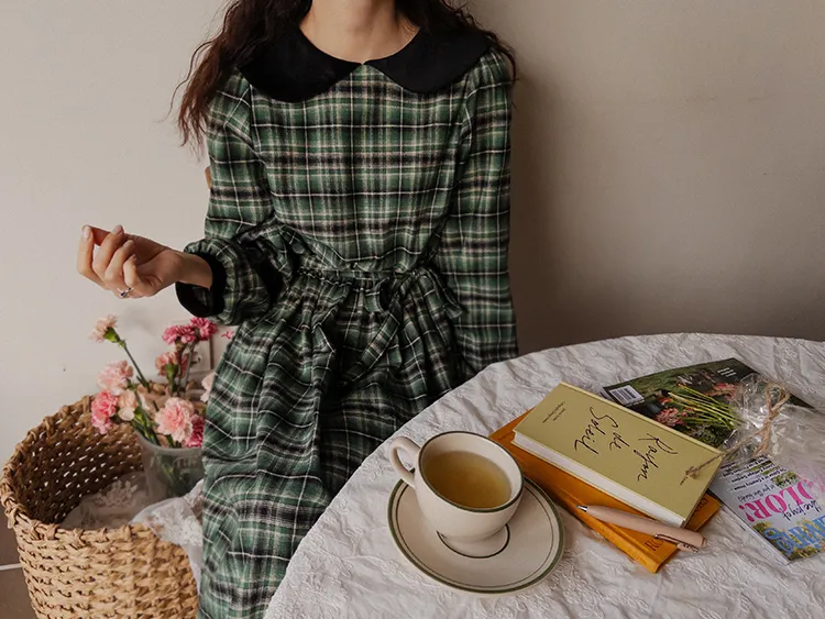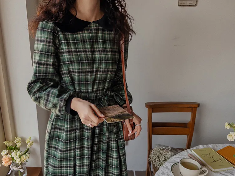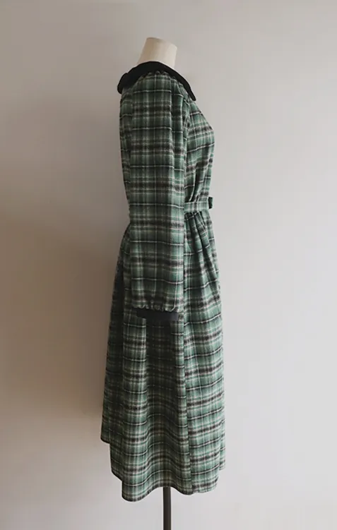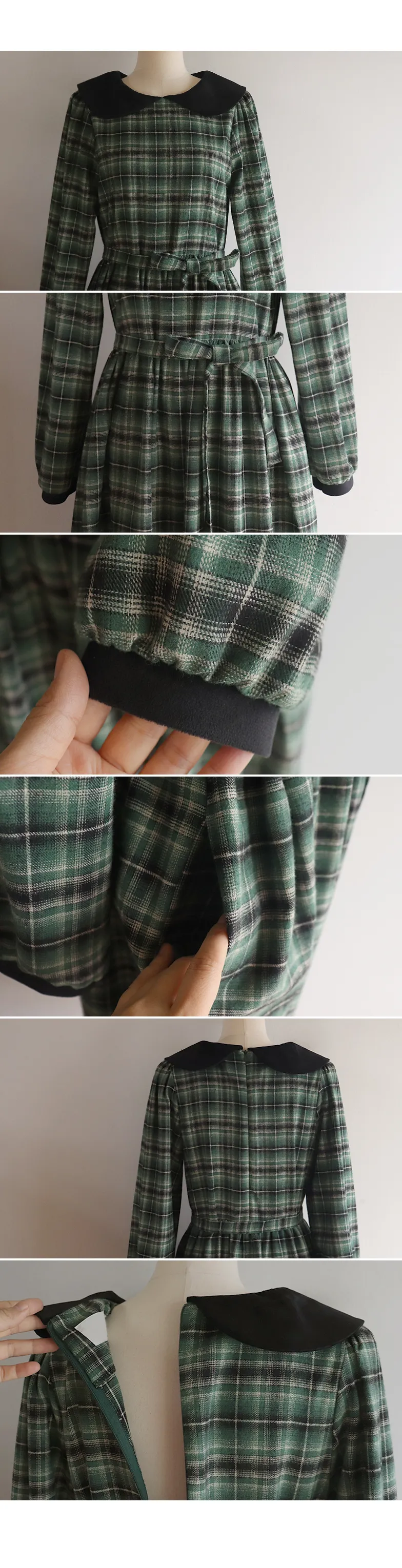 可愛領口袖末配色絨質腰綁帶格紋連身裙