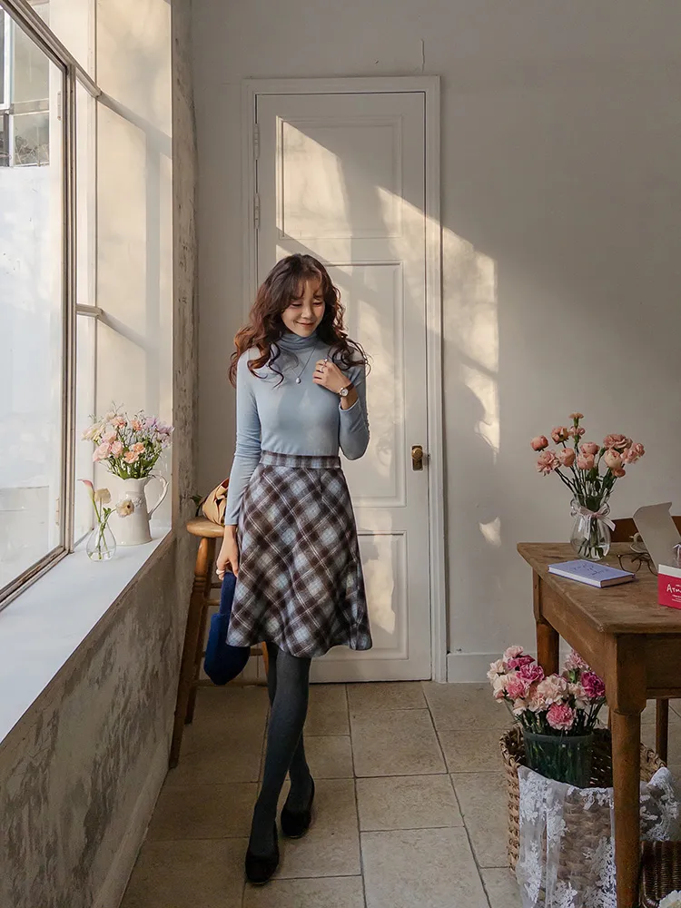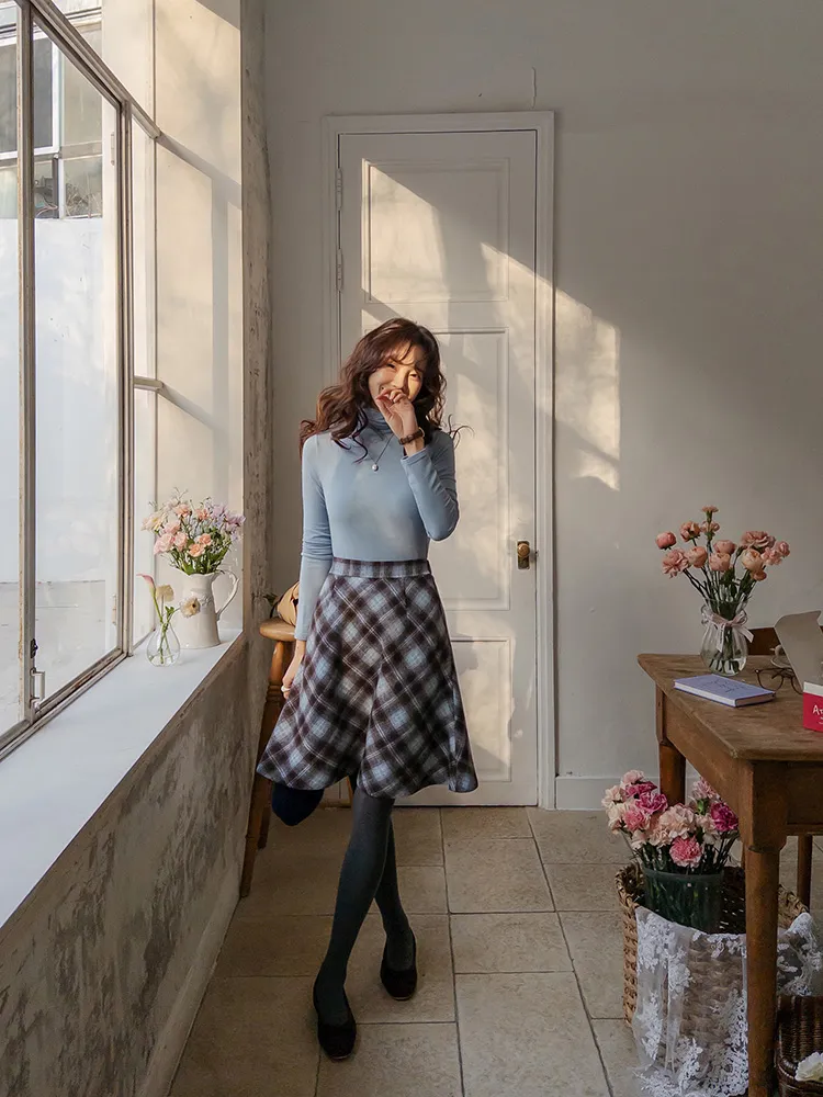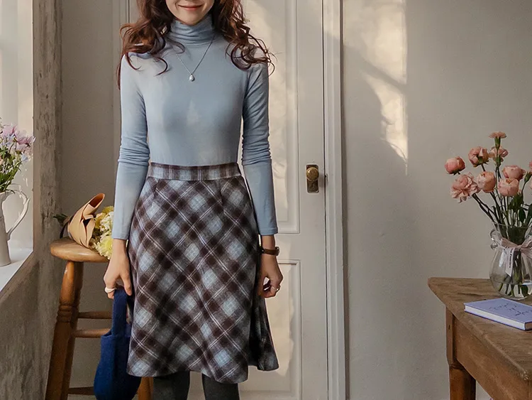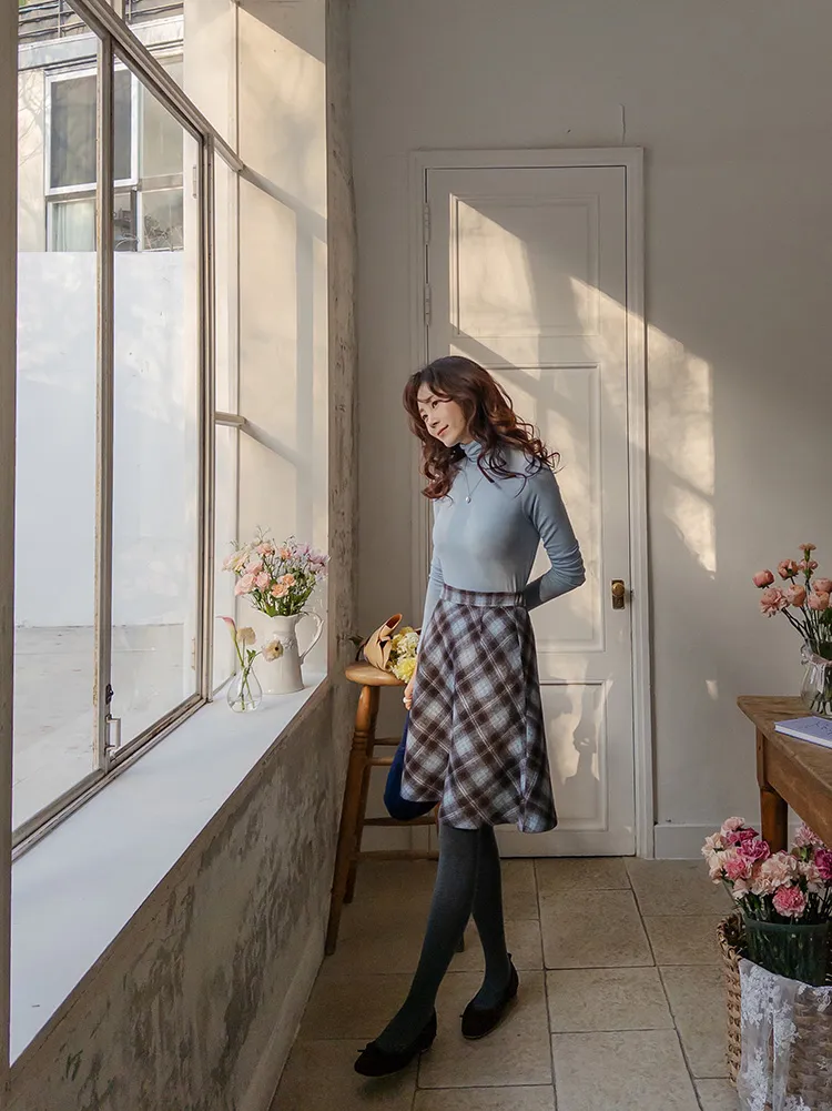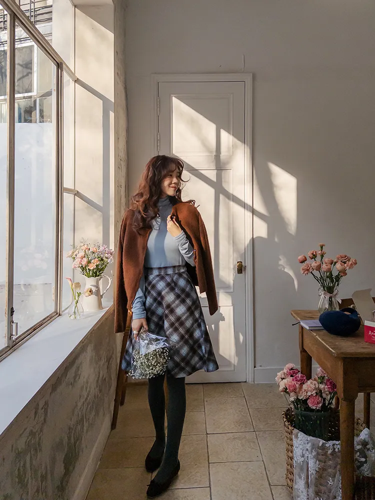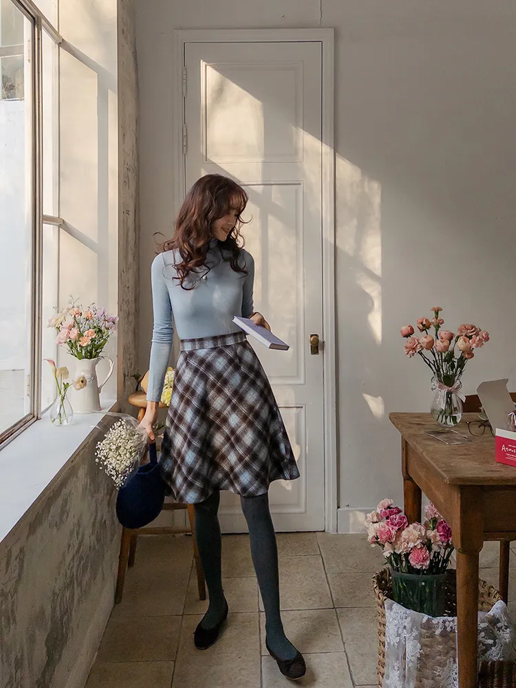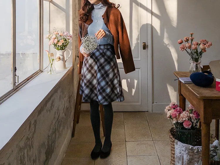 浪漫格紋絨質柔軟線條及膝裙